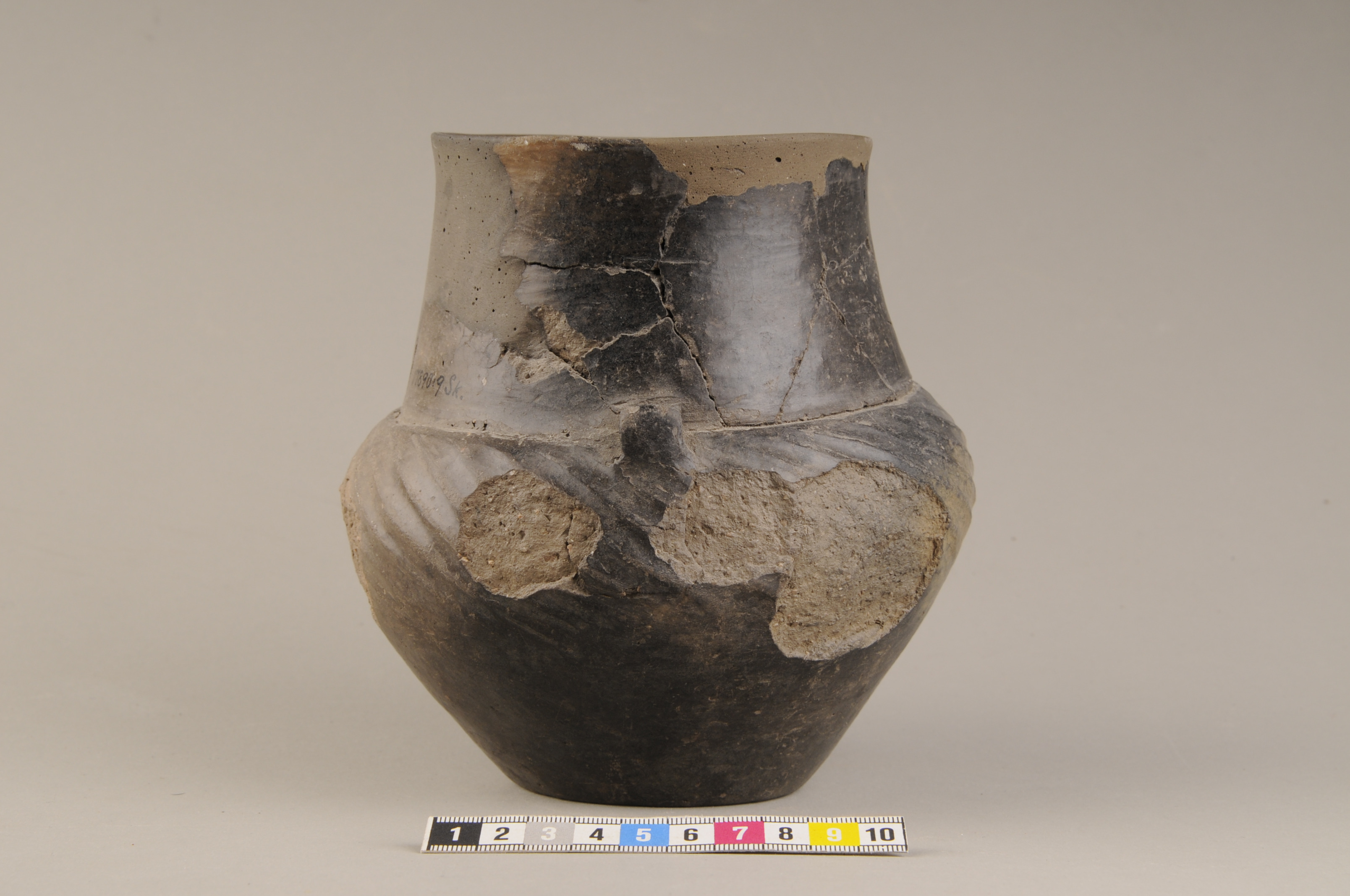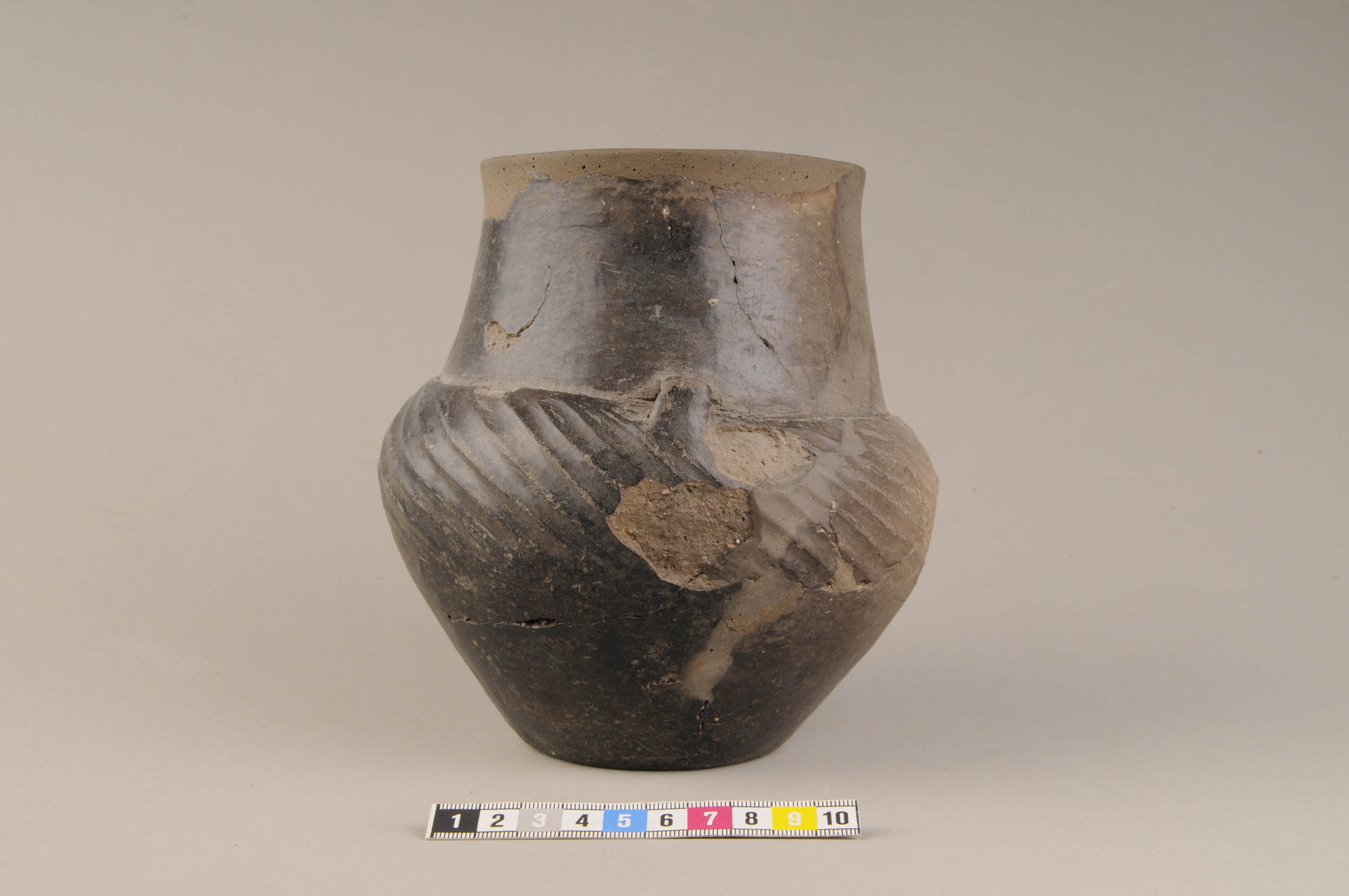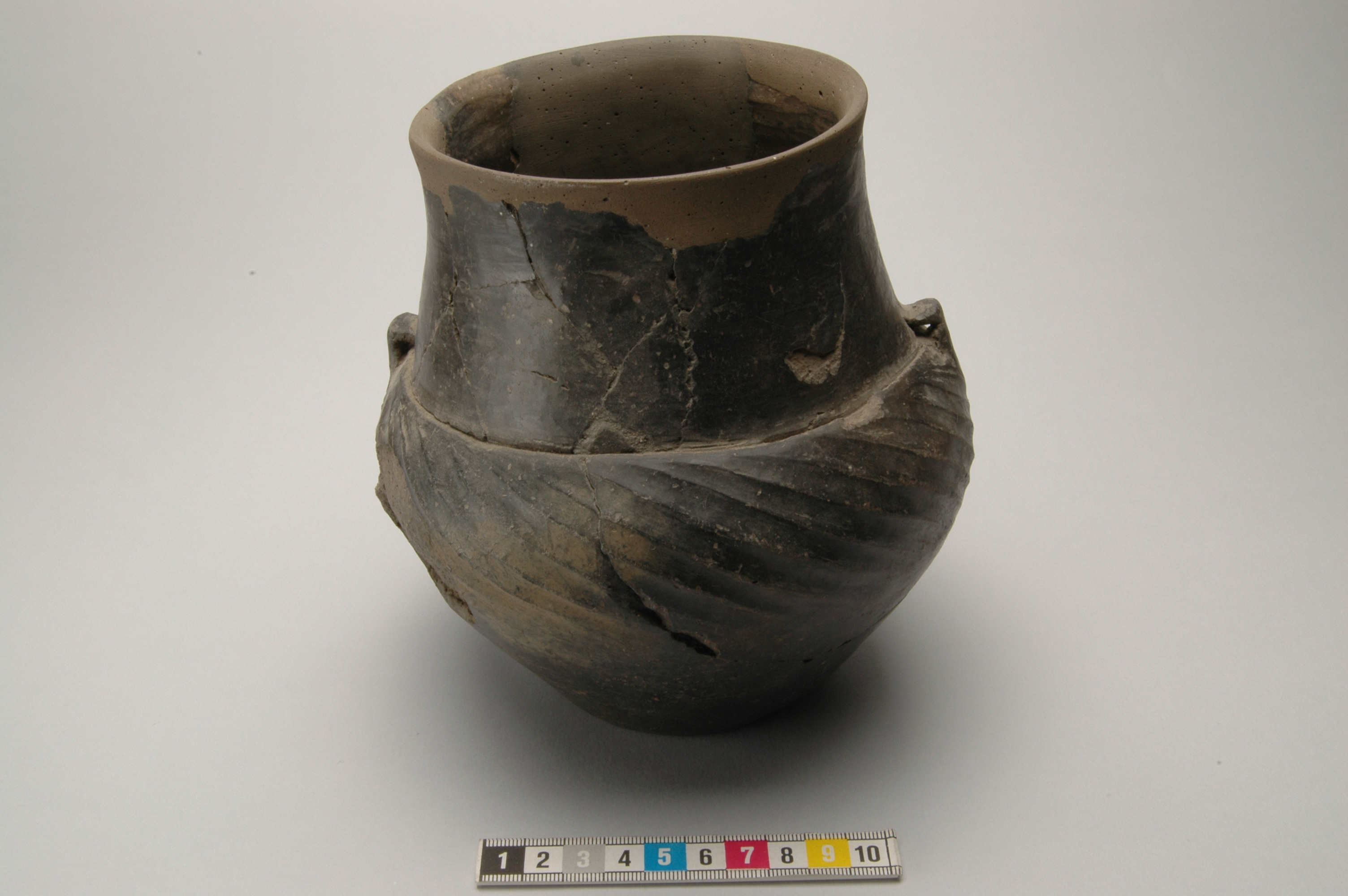 Keramikkärl med snedkannelerat bukparti och två små vinkelböjda, bandformiga öron. Kärlet har en mycket skarp gräns mellan hals och buk. Ytan är mörkbrun och polerad.