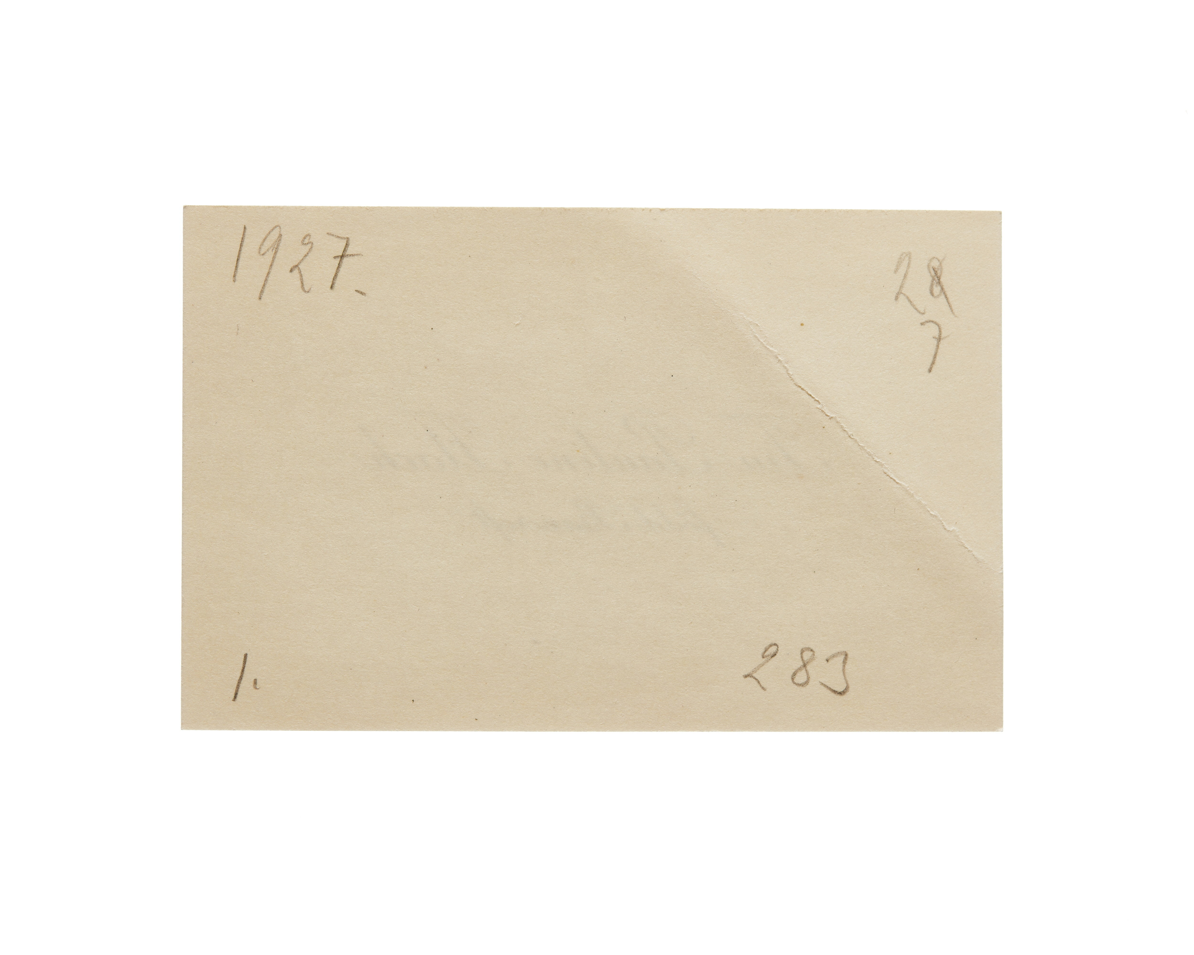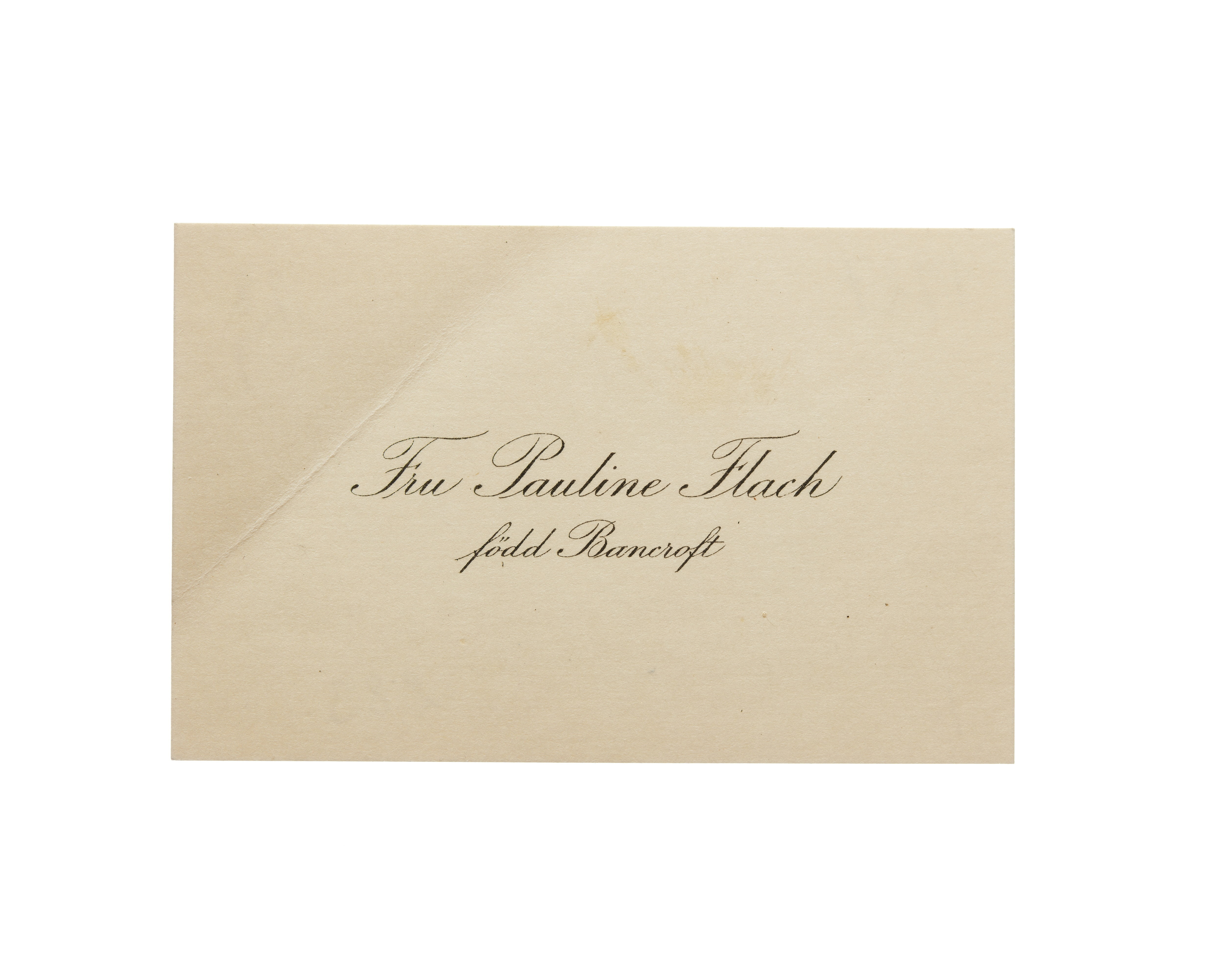 Ett visitkort från Fru Pauline Flach, f. Bancroft, daterat 1927, vikt i övre vänstra hörnet.