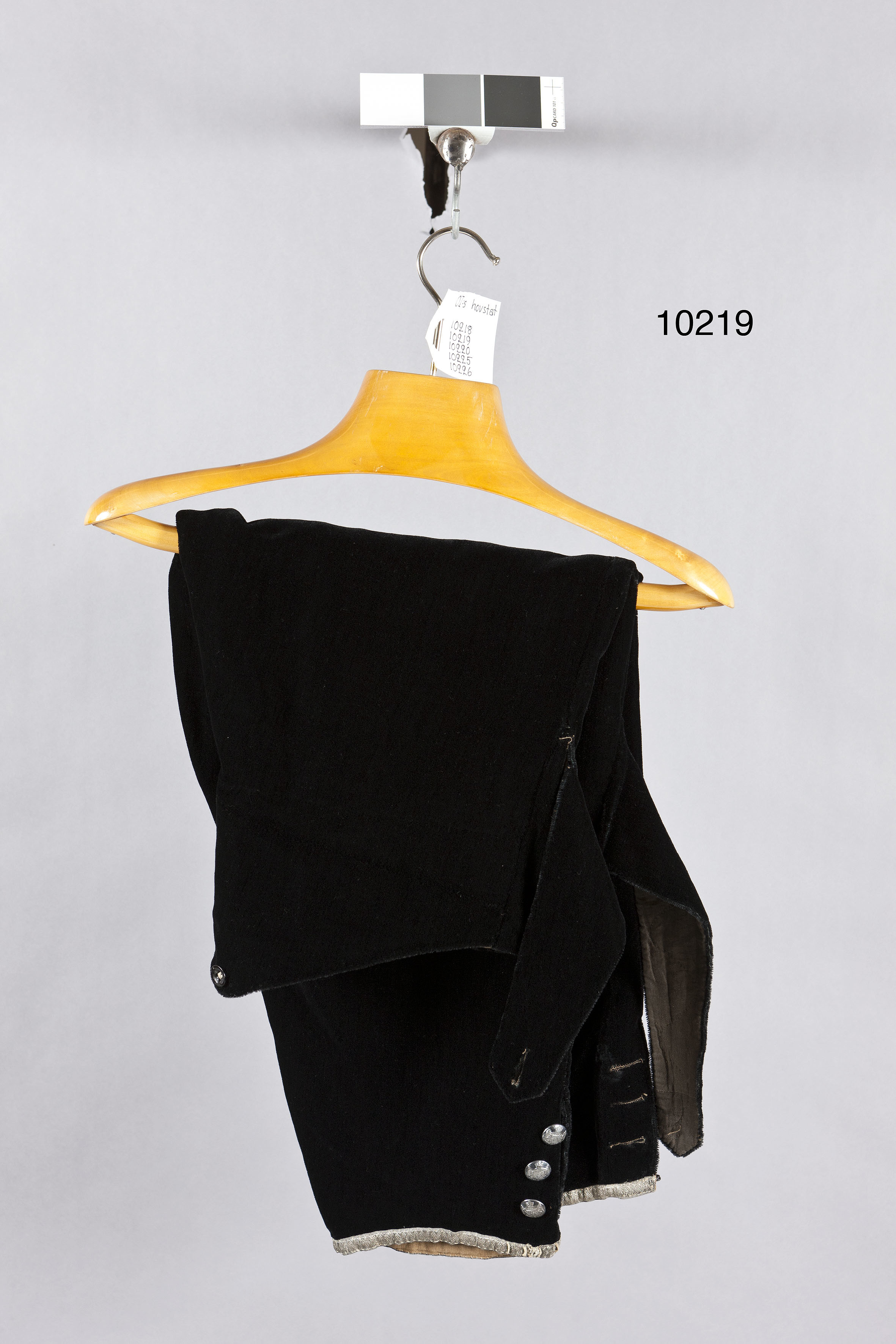 Knäbyxor av svart plysch, knäppning med lucka samt i vardera sidan två kilformiga tampar med ett knapphål på var sida samt fyra svarta knappar, 16 mm i diameter. Bakstycket med två infällda stycken, V-formad nedskärning samt två knappar, lika som de framtill, två knappar vid sidorna. Modellen saknar linning och fickor. Byxbenen med 120 mm långt sprund med tre knappar och tre knapphål. Benet kantat med en 12 mm bred silvergalon med svart hyska och tre hällor av ljust linne. Byxorna fodrade upptill med beige-färgat linne, tamparna med svart bomull, byxbenen nedtill skodda med smal linneremsa. Baktill på fodret med bläck: "m".