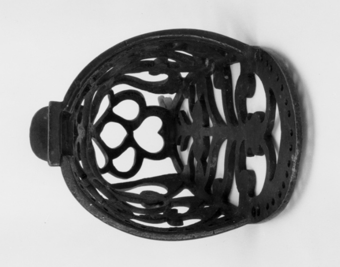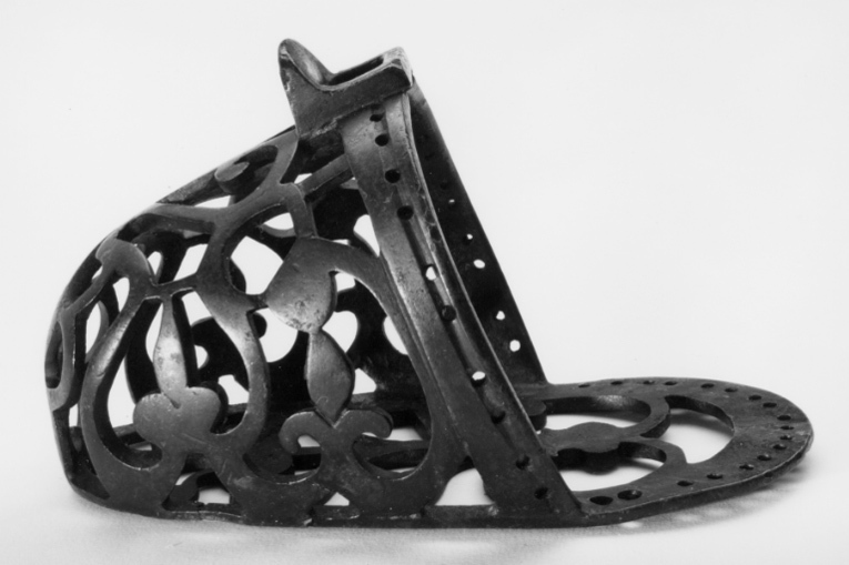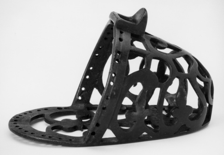 Stigbygel av mörkanlöpt brons. U-formade skänklar med fast rektangulär liggande remögla, framför remläget liten skärm. Korg av genombrutna ornament. I skänklarna hål för fastsättande av fodret. Ovalt genombrutet trampstöd med hål utmed bakkanten.