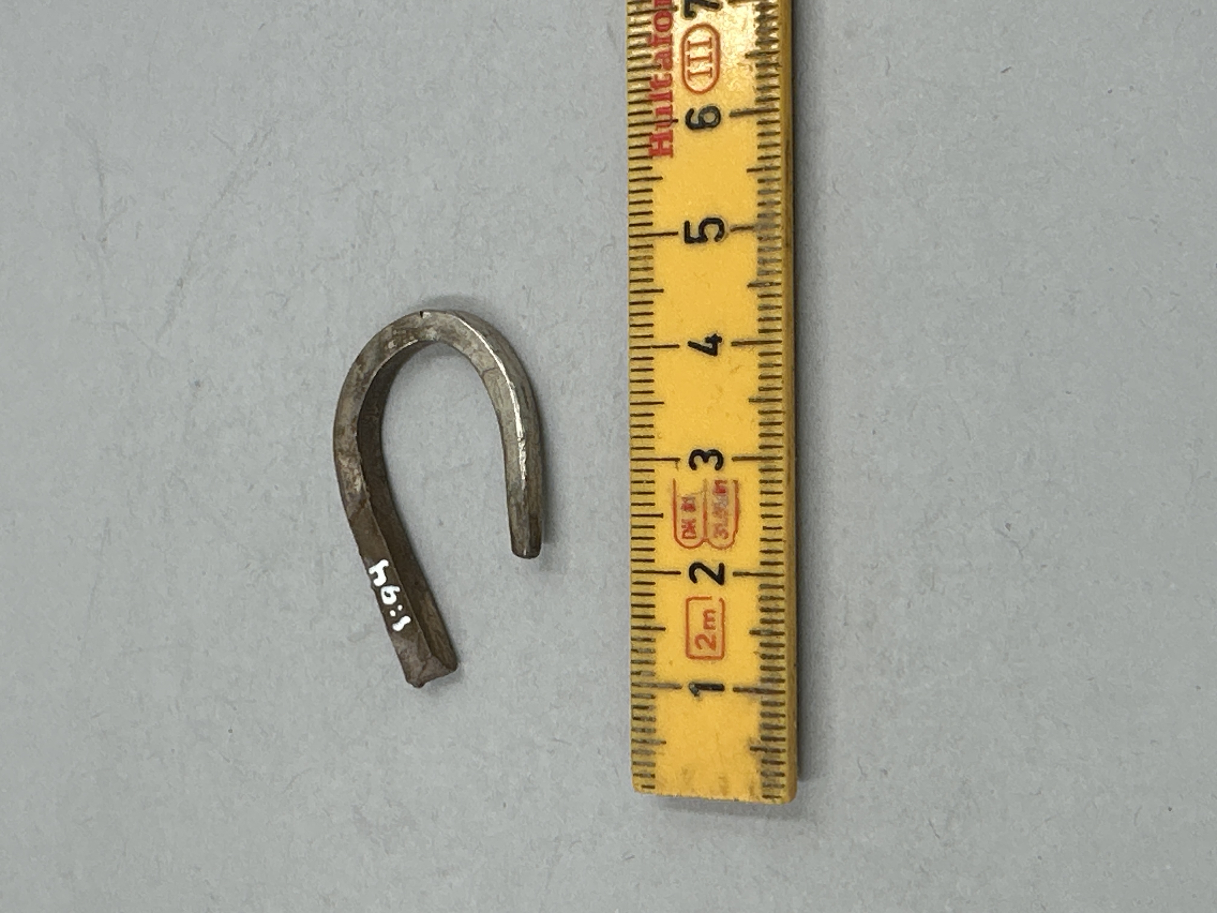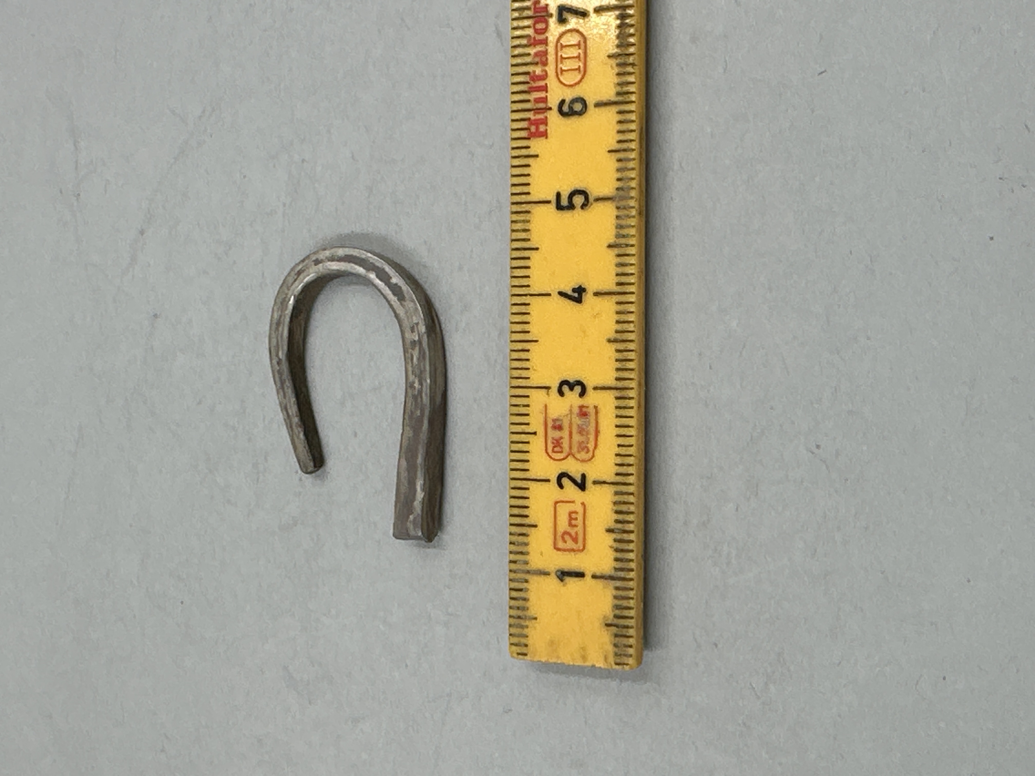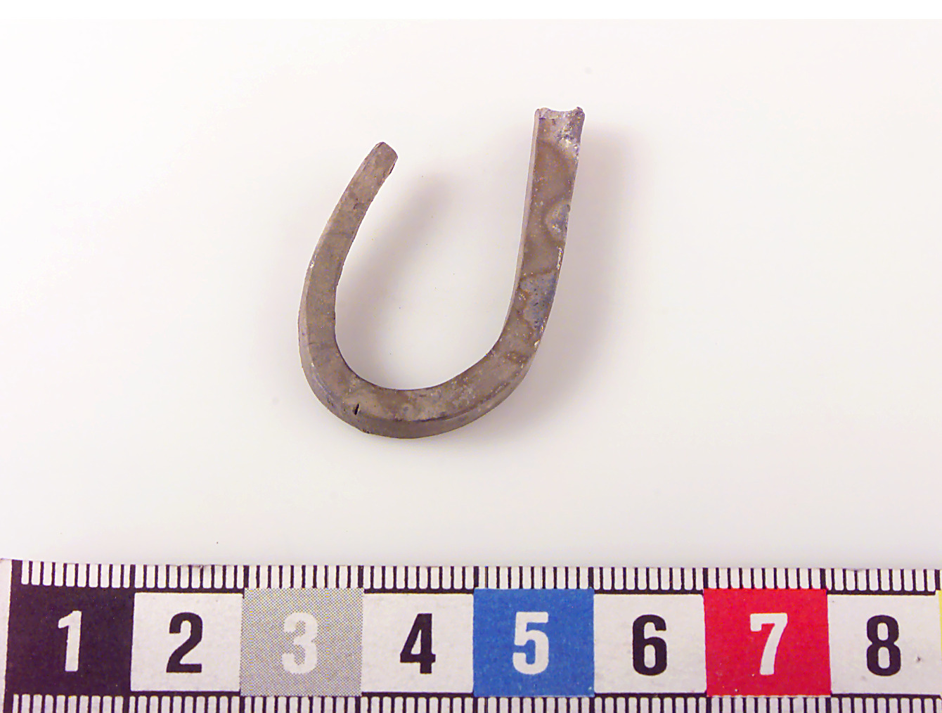 Med rektangulärt tvärsnitt. Omböjd. Avbruten i en ände, den andra avsmalnande.