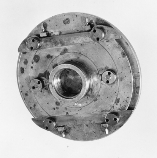 Rund patronskiva som i centrum på ena sidan är försedd med en vårta med ett axialt, gängat hål för fastskruvning av skivan på spindeln. På motsatta sidan är styrskenorna, sliden och skruvöglorna monterade. Skivan har två diametralt, i slidens längdriktning ordnade rektangulära hål (15,5x48,6) för styrklackarna.