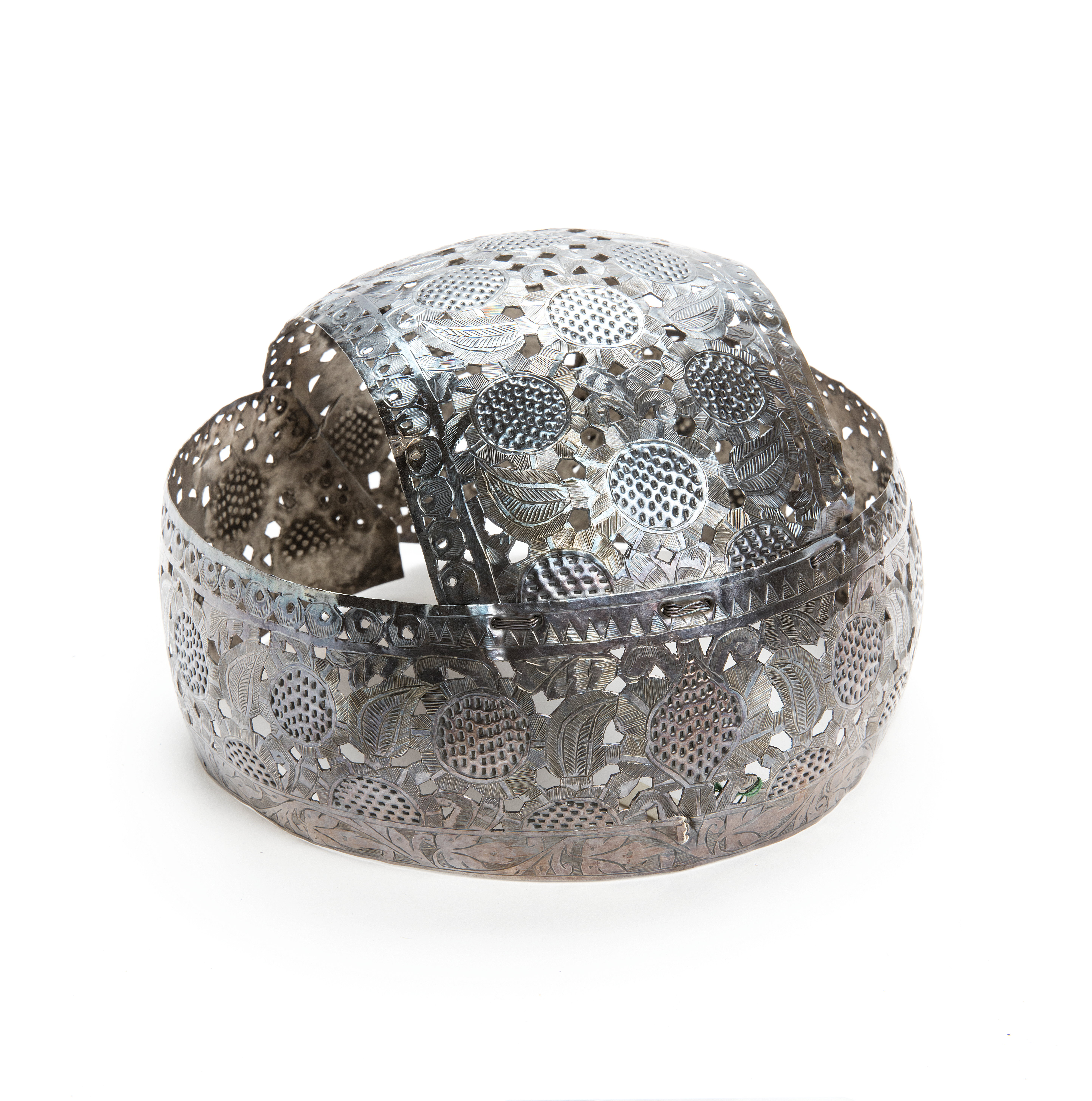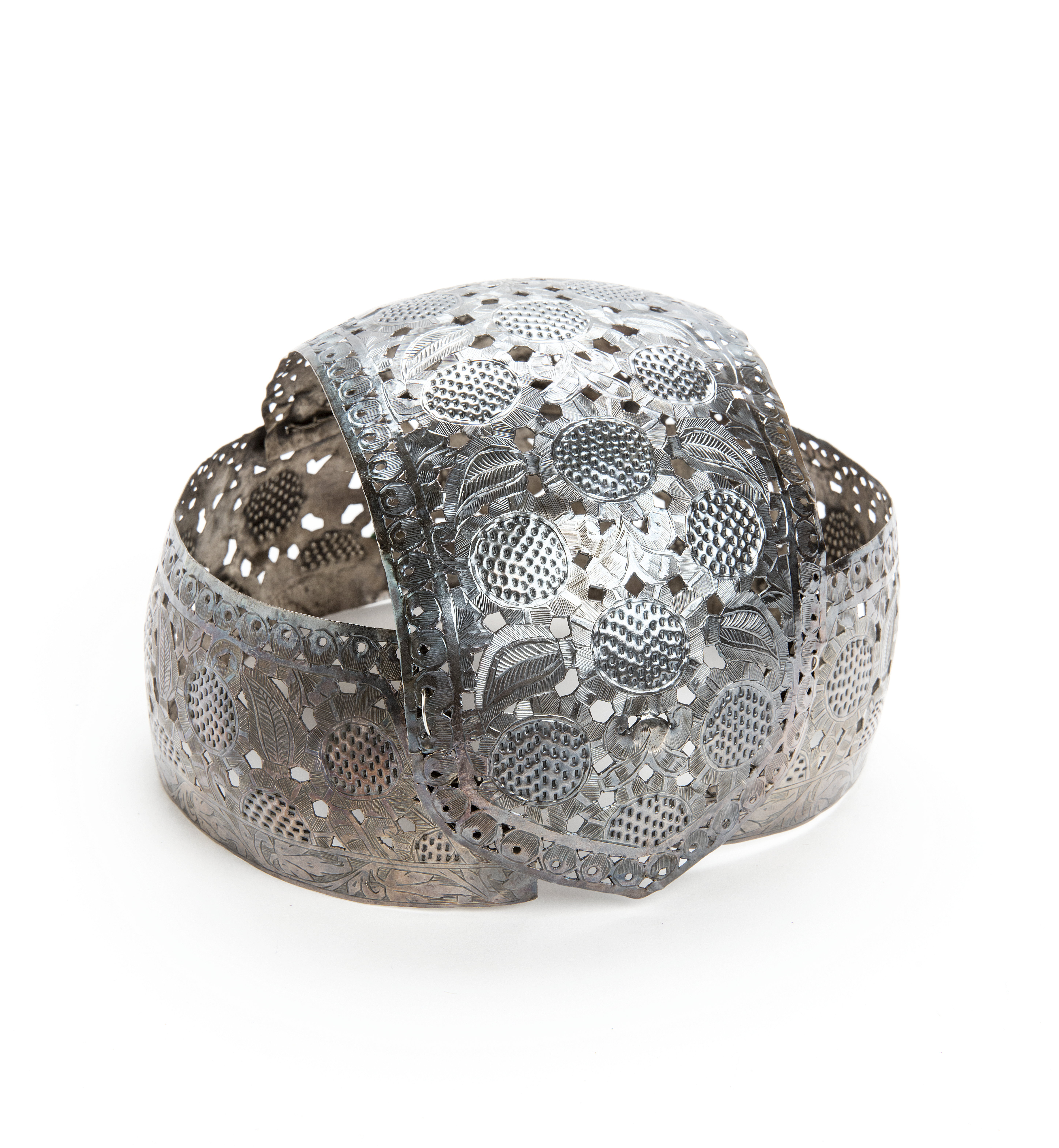 Huvudsirat av pressad och graverad genombruten silverplåt. Sammansatt av två, något välvda. Ett 60 mm brett runt huvudet och ett 95 mm brett över hjässan. Mönstrat med blommor och blad. Dräkten år 1731 skänkt av "Deijen Abdi Bascha i Alger" (se 1855). Gåva till drottning Ulrika Elonora d.y 1731 från dejen Abdi Pascha av Alger. Samtidigt fick Fredrik I två berberhingstar och ett sto, två strutsar, en bössa och ett par pistoler samt fyra svenska slavar.