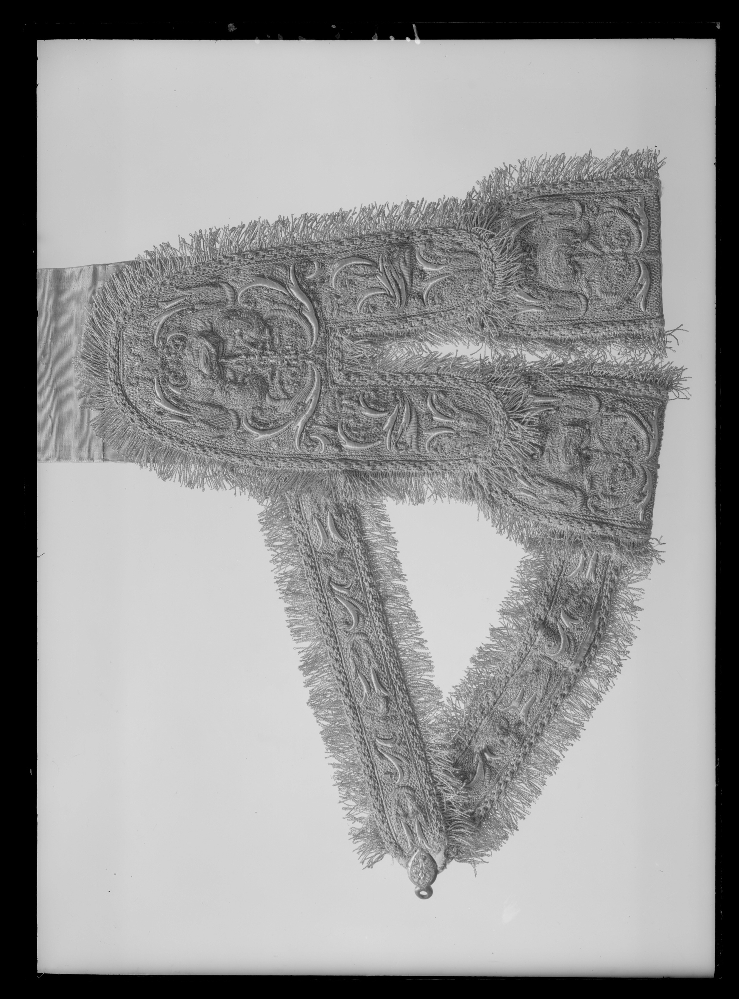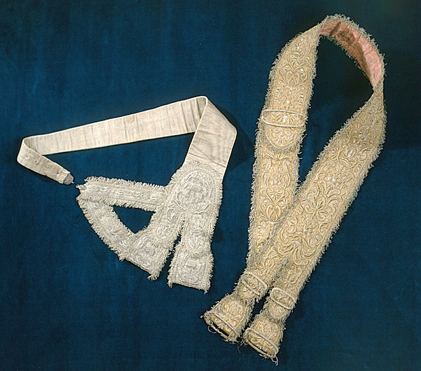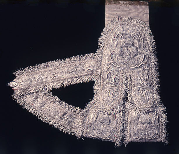 Gehäng broderat i silver. Livband klätt med silvermoiré. Gehängdelen är 32 cm lång och mjukt rundad upptill. I nederkant delad i två tungor i vilka två 9 cm breda öglor är fästade. Från gehängdelens vänstra sida går två band, ca 25 cm långa. Det ena är fäst i gehängets nederkant och det andra ungefär på mitten av den broderade delen. De två är ihopfästa med ett litet silverbeslag. Beslaget avslutas med en liten ring och har en dekor av blommor. Alla dessa delar helt täckta av broderi i silvertråd. Botten täckt av kantiljer. Motiv uppbyggt i relief föreställande stiliserade blombuketter och bladslingor. Kantat med en 2 cm bred silverfrans. Livbandet är 99 cm långt och vid det bredaste stället 12 cm brett. Det avslutas med ett större silverbeslag av samma typ som det tidigare beskrivna fast med en avslutande knopp istället för ring. På den smala delen av livbandet fyra tränsade hål med ca 3 cm emellan. Troligen har gehänget fästs ihop med den typ av sölja som på baksidan har en hake. Haken har då satts i det lilla beslaget med ring i gehängets nederdel och livbandets längd kunnat regleras med hålen. Gehänget har ursprungligen varit fodrat med röd sammet, vilket kan ses i skarvarna mellan dess olika delar. Det har emellertid klätts om med en vit sidenrips med inslag av silverlan.