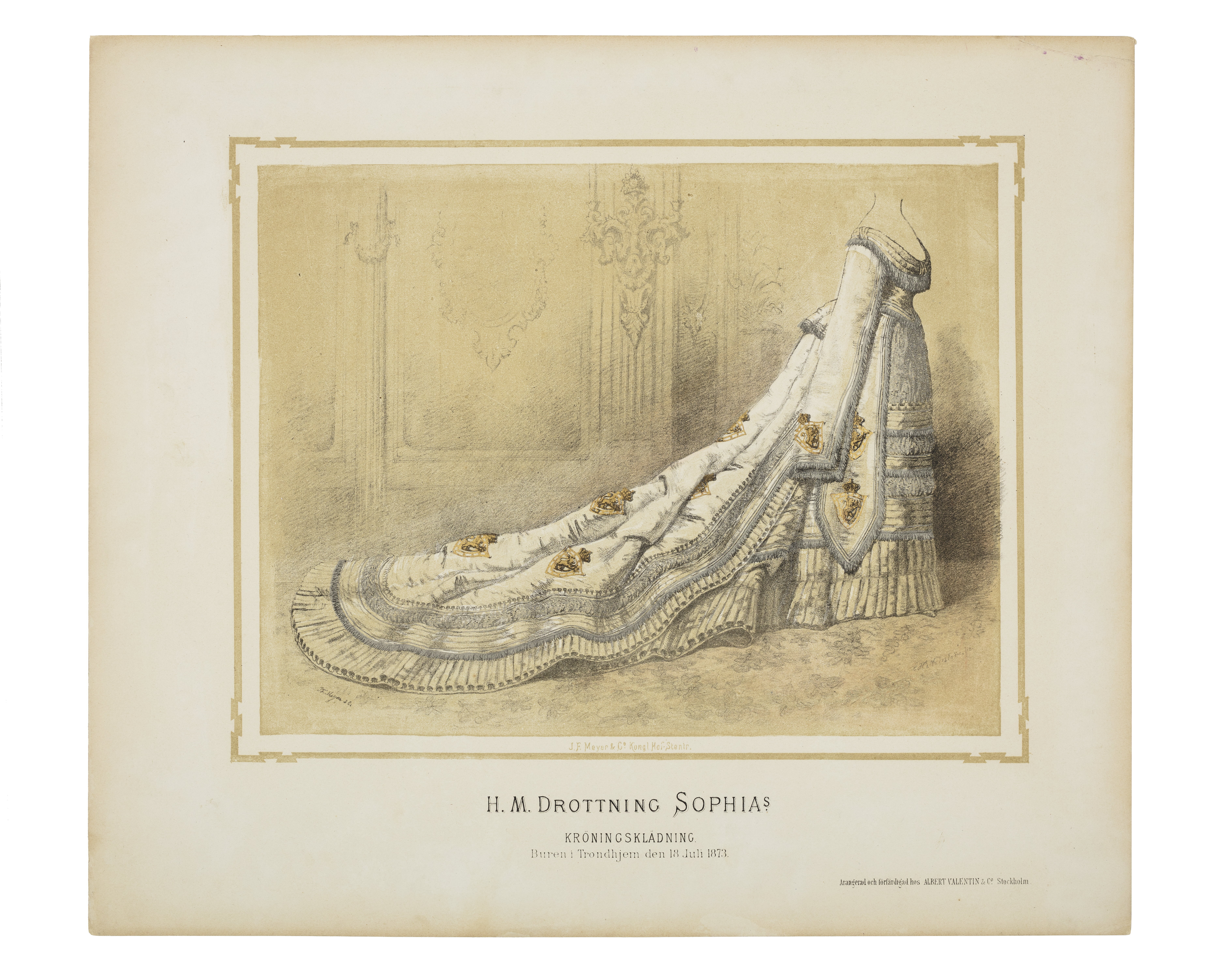 Litografi som framställer drottning Sofias norska kröningsklänning sedd i höger profil. Klänningen är tecknad med svarta och skuggade konturer. De norska vapnen på klänningen är målade med guldfärg och klänningens fransar är målade med silverfärg. Klänningen återges mot bakgrund av en vägg i en rokokosal med en pilaster, en stor kandelaber samt en spegelram. Bakgrunden är gulaktig för att betona den vita klänningen. I vänsterkantens nedre hörn står skrivet en signatur med svart färg: "JF. Meyer & Co". Under motivet är tryckt i gult/guld: "J.F. Meyer & Co Kongl Hof. Stenir". I höger kants nedre hörn finns ytterligare en signatur i svart (svårtydd): "..H Norström ...". Motivet omges av en gulgrön bemålad ram med zick-zackformer i hörnen, bredd 3 mm. Nedanför ramen står tryckt med svarta bokstäver "H.M. DROTTNING SOPHIAS//KRÖNINGSKLÄDNING//Buren i Trondhjem den 18 juli 1873". I nederkanten i höger hörn står namnet på skrädderiet tryckt med svarta bokstäver: "Arangerad och förfärdigad hos Albert Valentin & Co Stockholm". Jämför med litografi inv.nr 33945 samt album inv.nr 33943.
