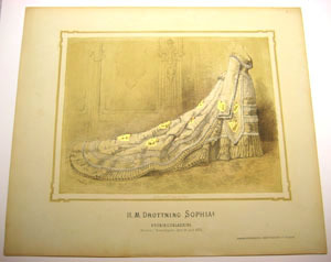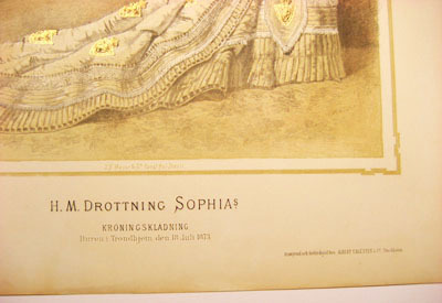 Litografi över drottning Sofias norska kröningsklänning, 1873.