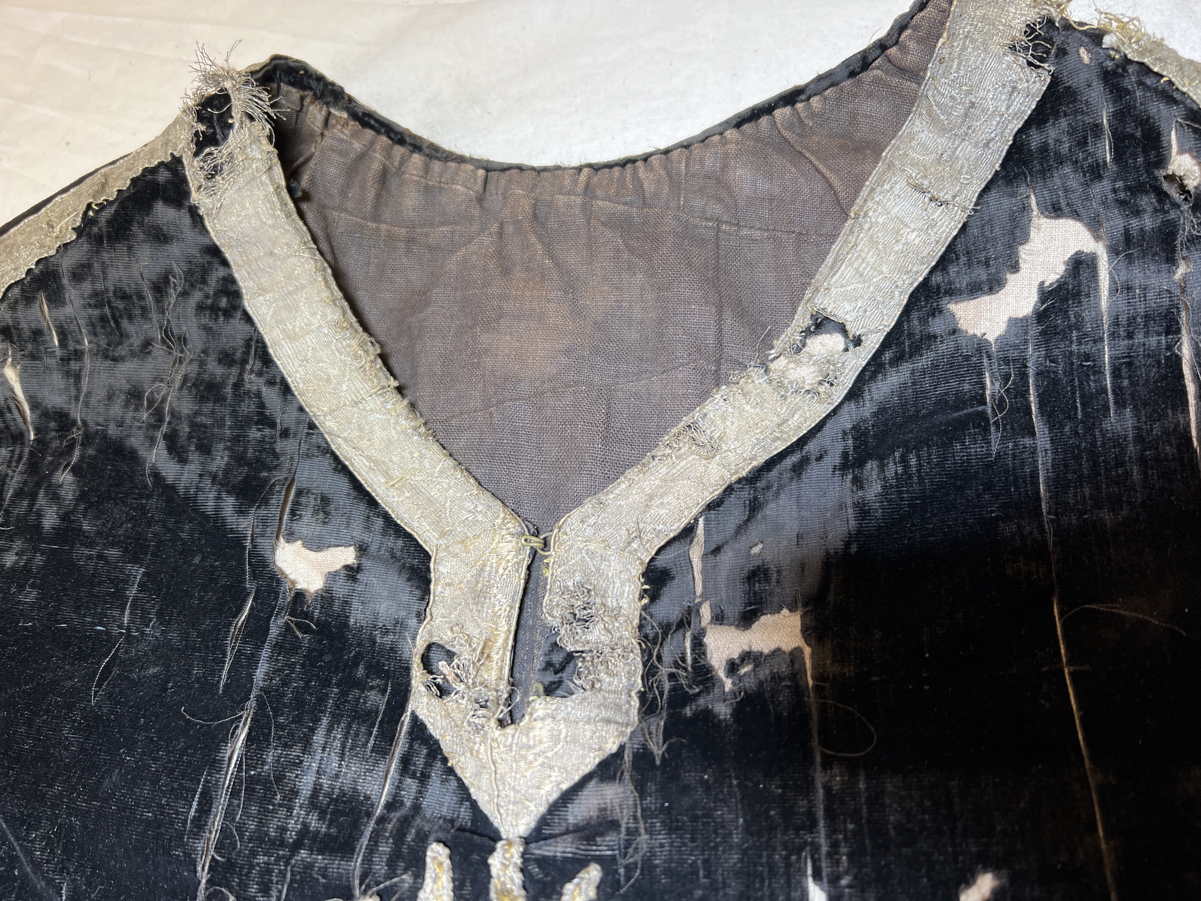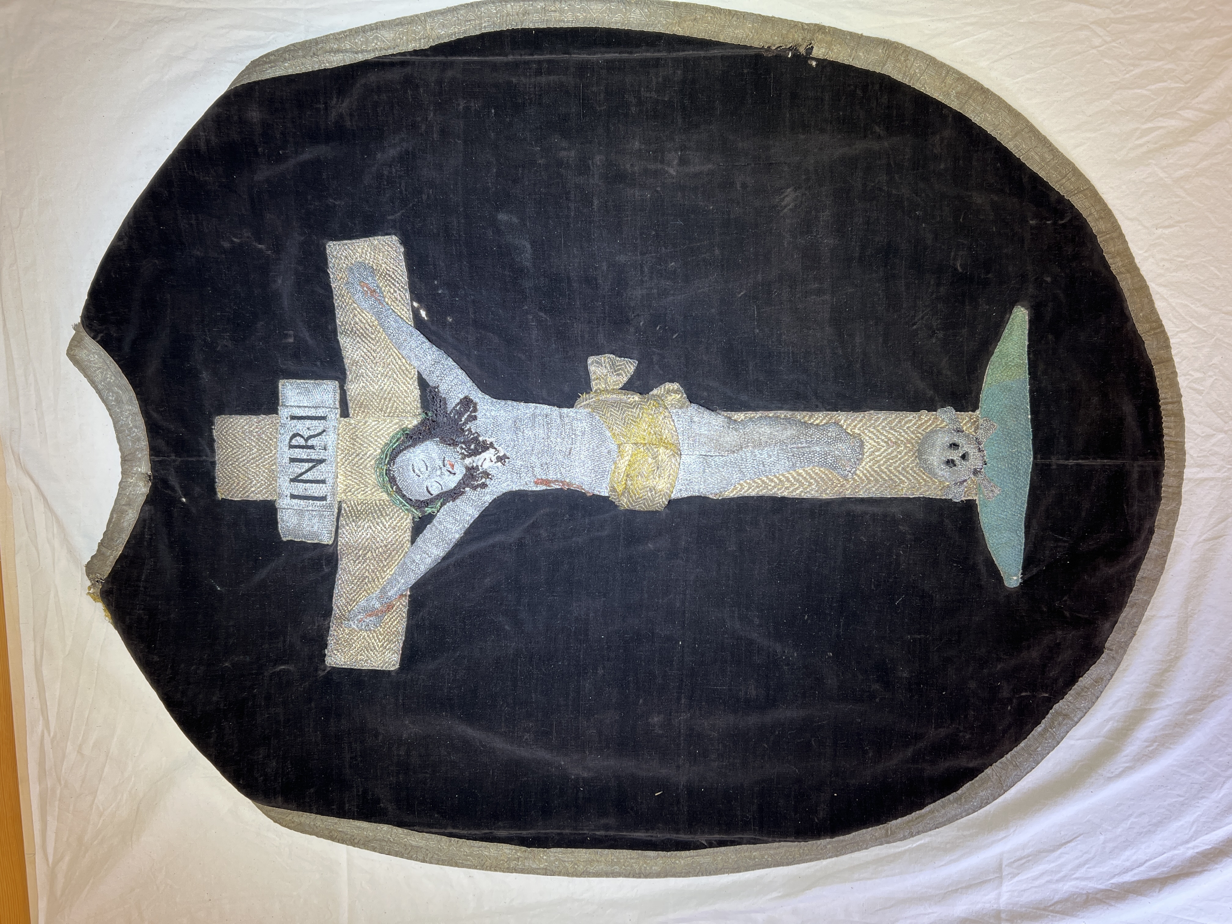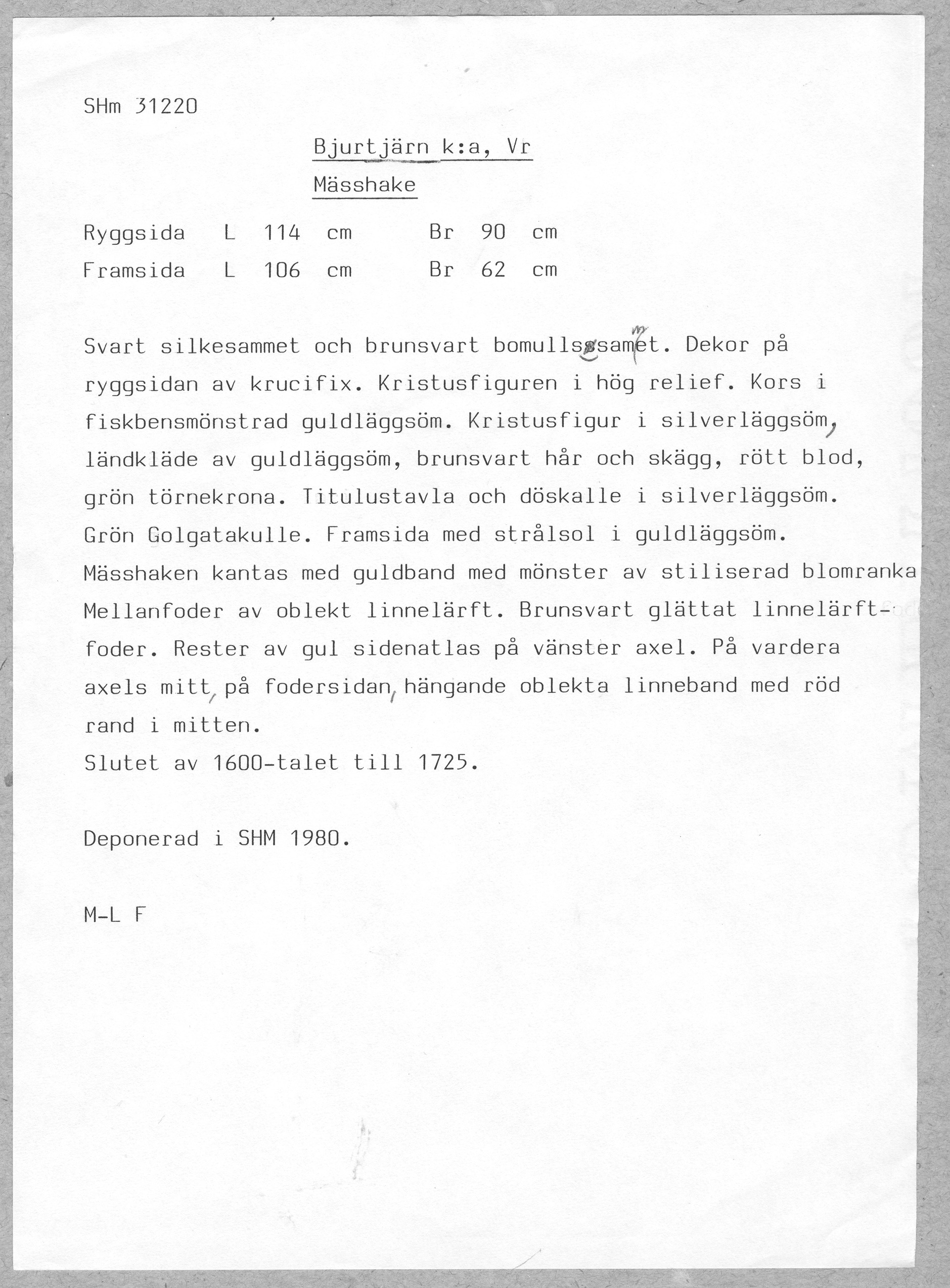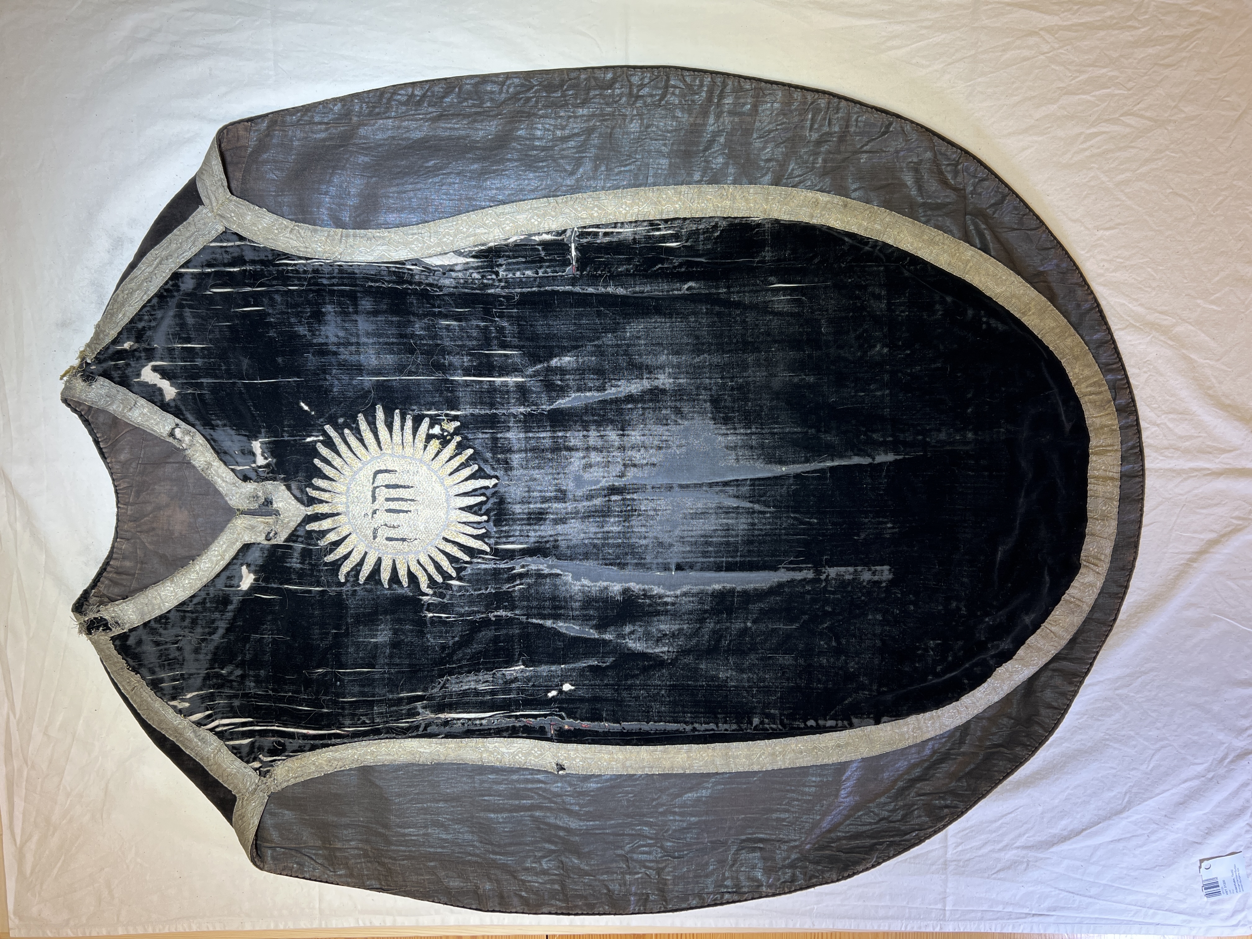 Svart silkesammet och brunsvart bomullssammet, krucifix, strålsol, metallband, brunt lärftfoder. Deponerad i SHM 1980.