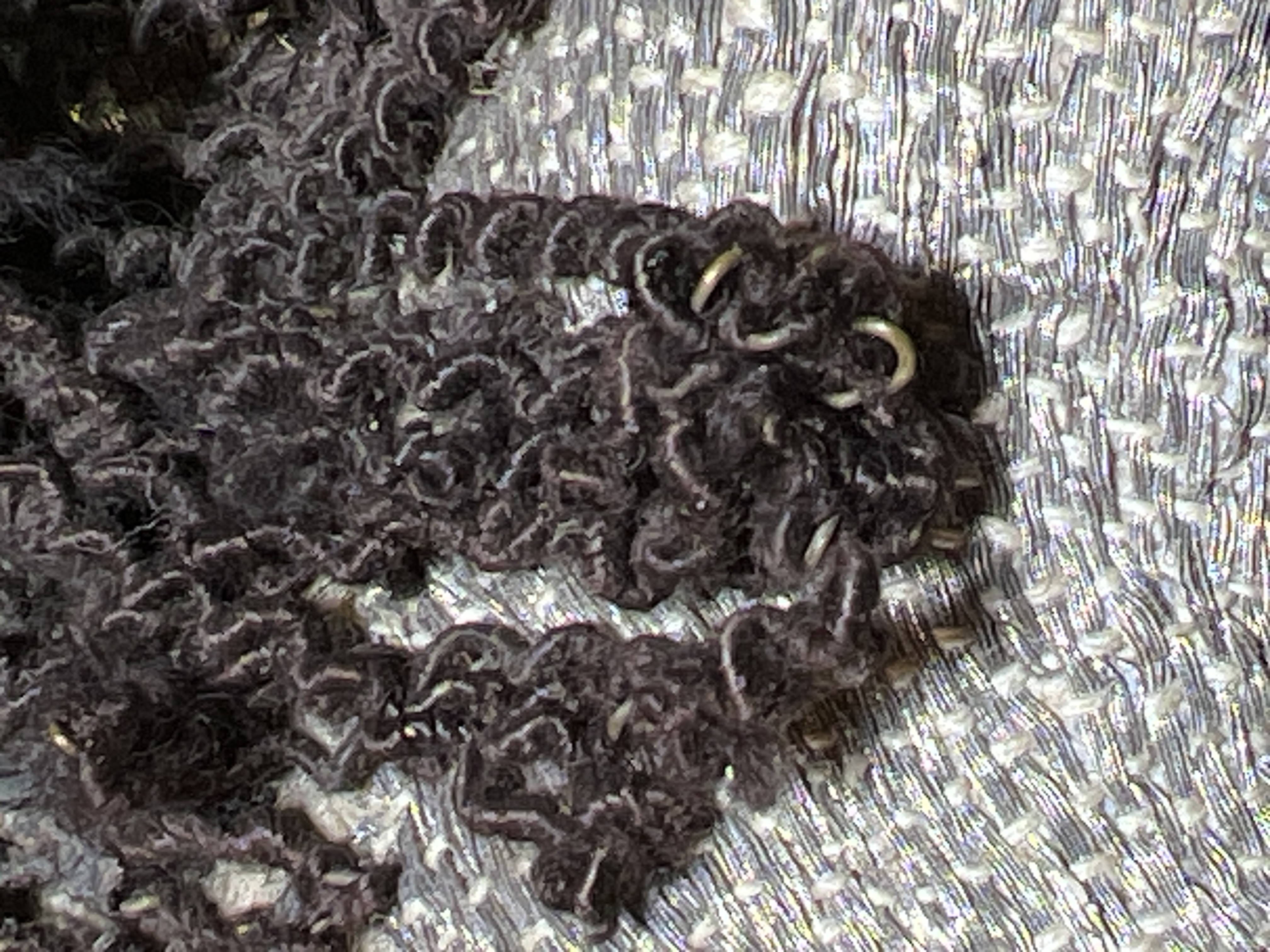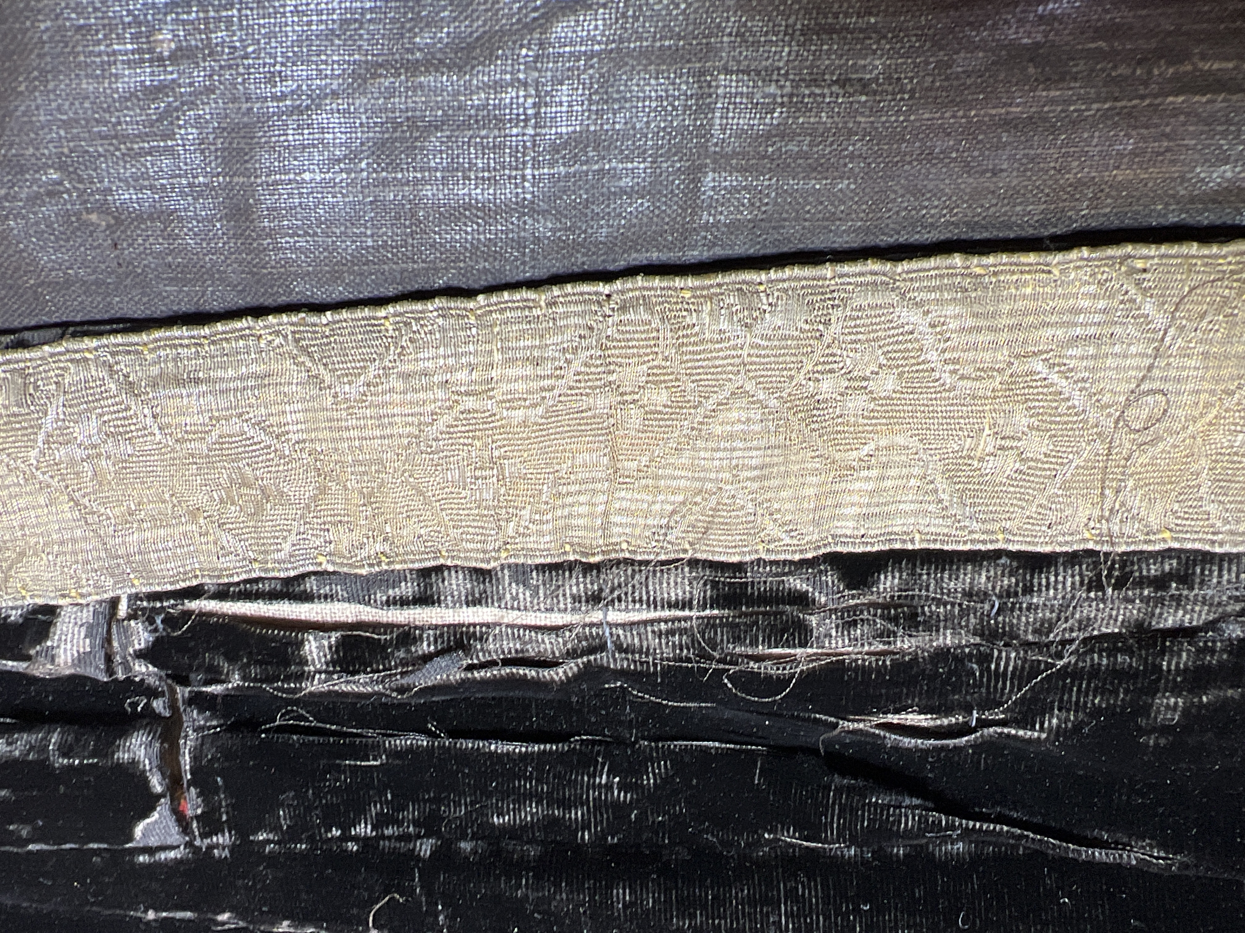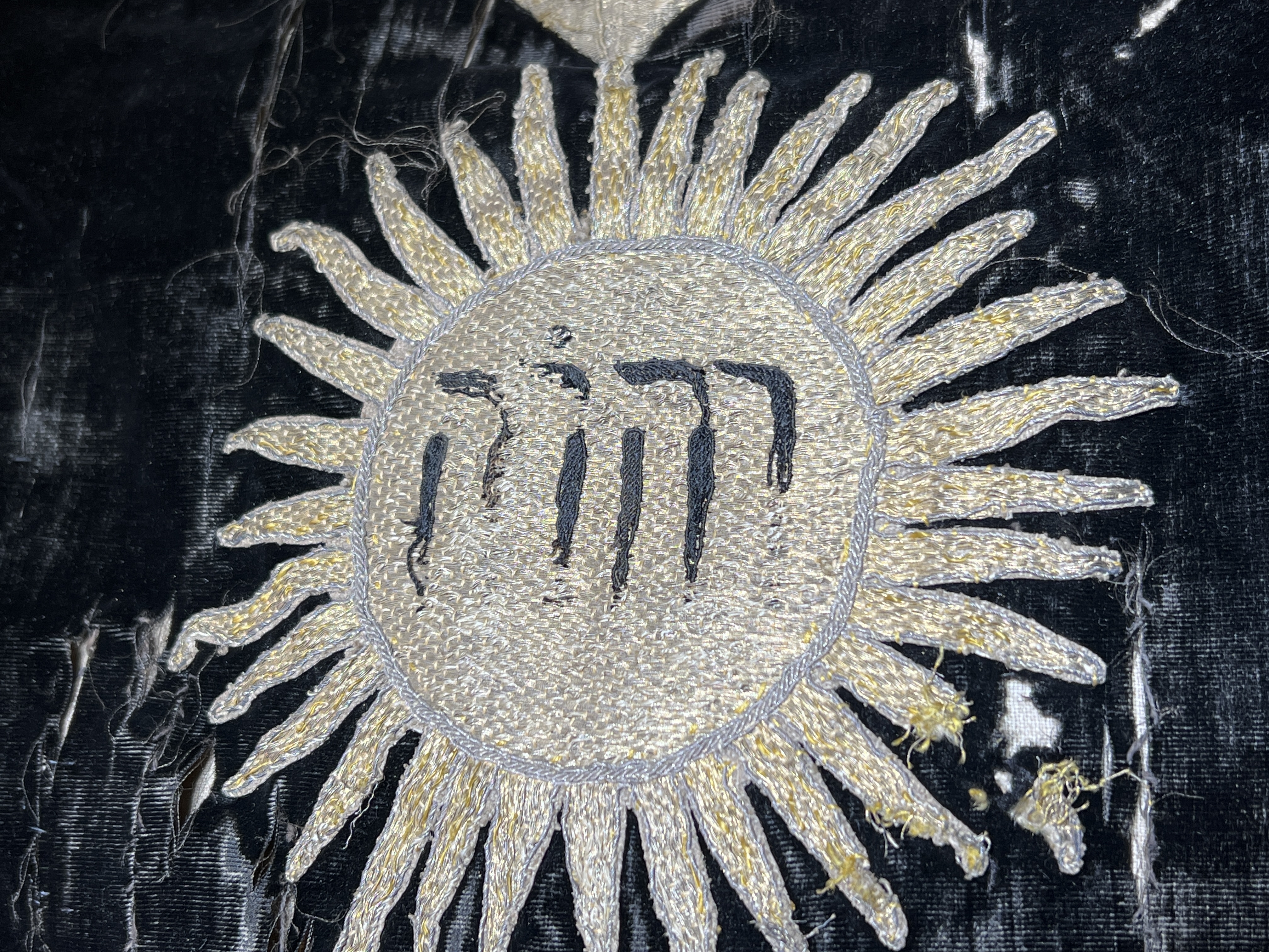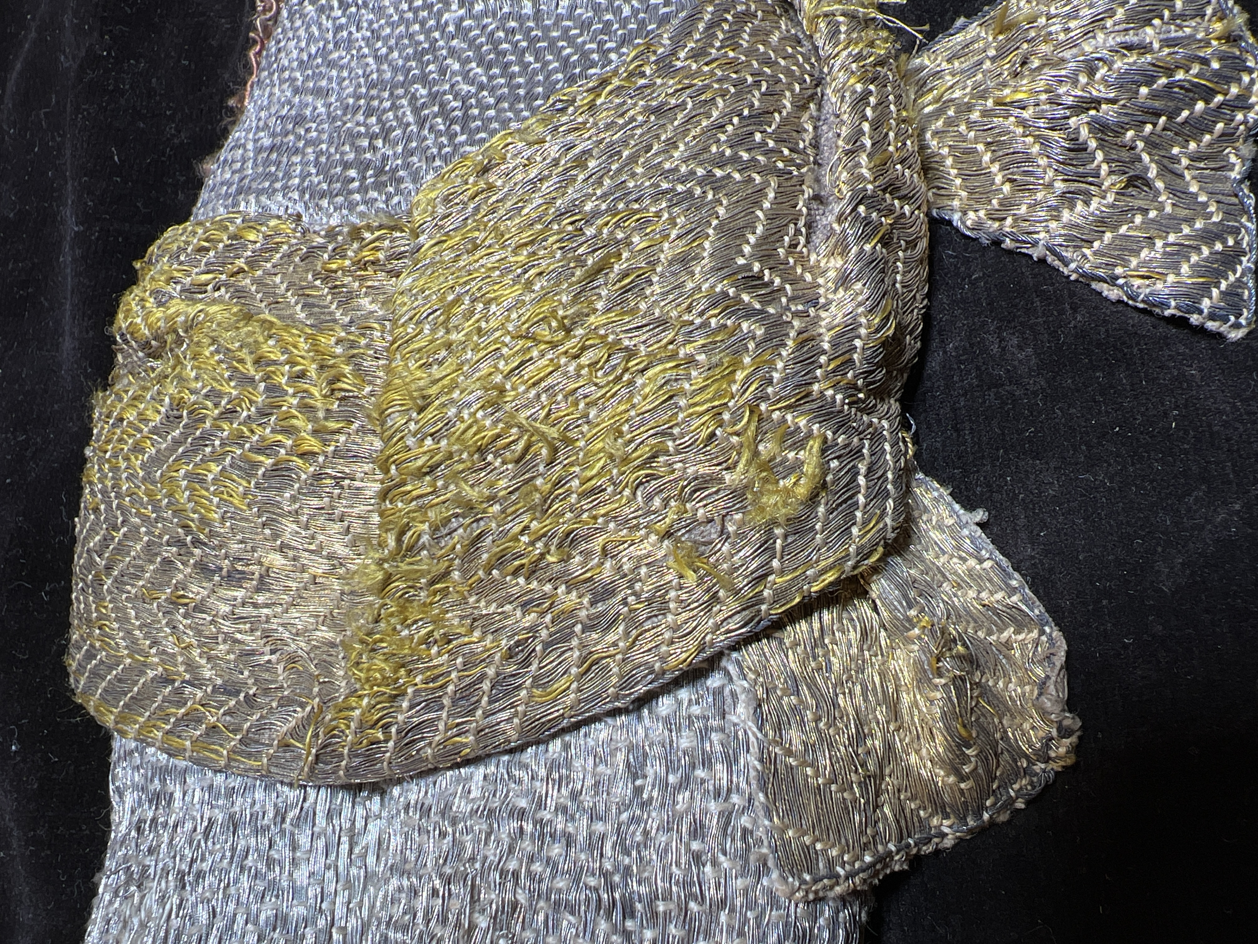 Svart silkesammet och brunsvart bomullssammet, krucifix, strålsol, metallband, brunt lärftfoder. Deponerad i SHM 1980.