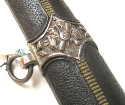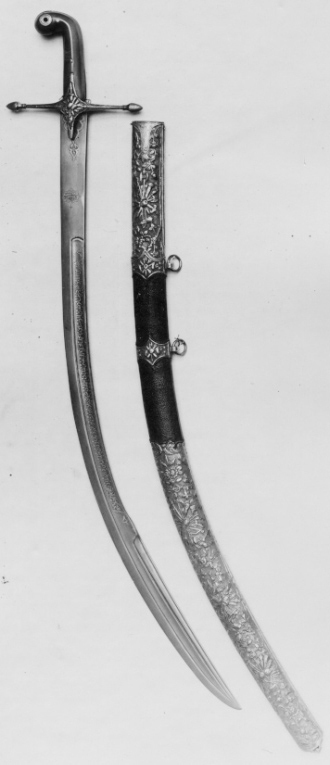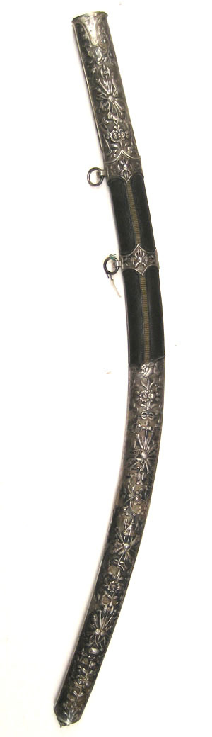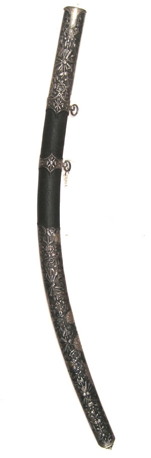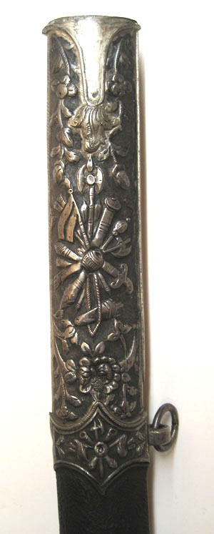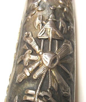 Balja klädd med läder, på utsidan en rand av förgylld silvertråd. Munbleck av ciselerat silver med graverad dekor i form av trofégrupp och blommor. På munbleckets insida finns en tughra ovanför övre mellanbandet. Två mellanband med koppelringar, av silver med ciselerad dekor i form av trofégrupper. Mellanbanden har spetsigt utdragna mittpartier. Doppsko av ciselerat silver, lång, med tre trofégrupper på utsidan och insidan omväxlande med blommor. På doppskons konkava smalsida finns överst en tughra-stämpel. Övre kanten på doppskon är oregelbunden med volutformad dekor.