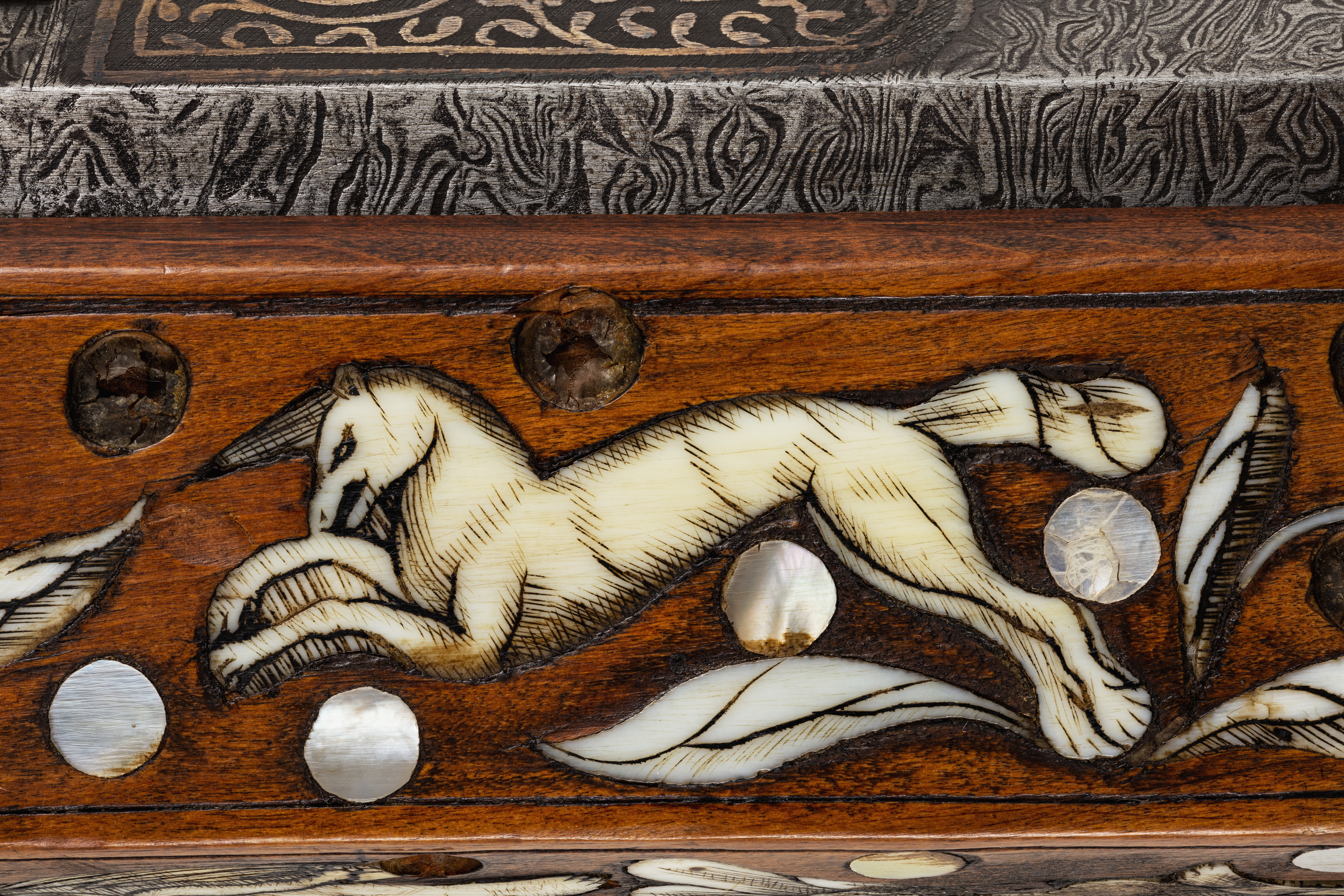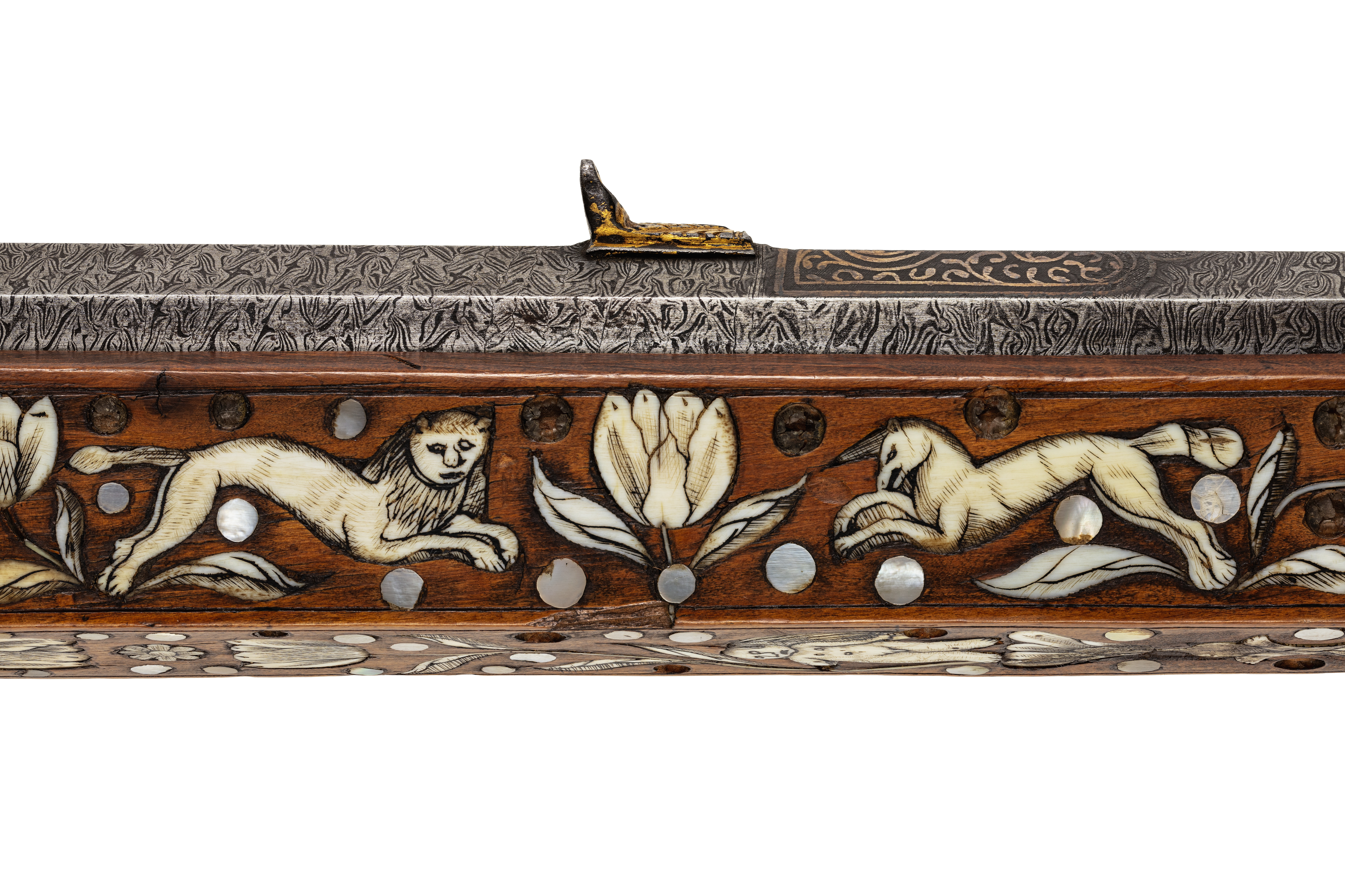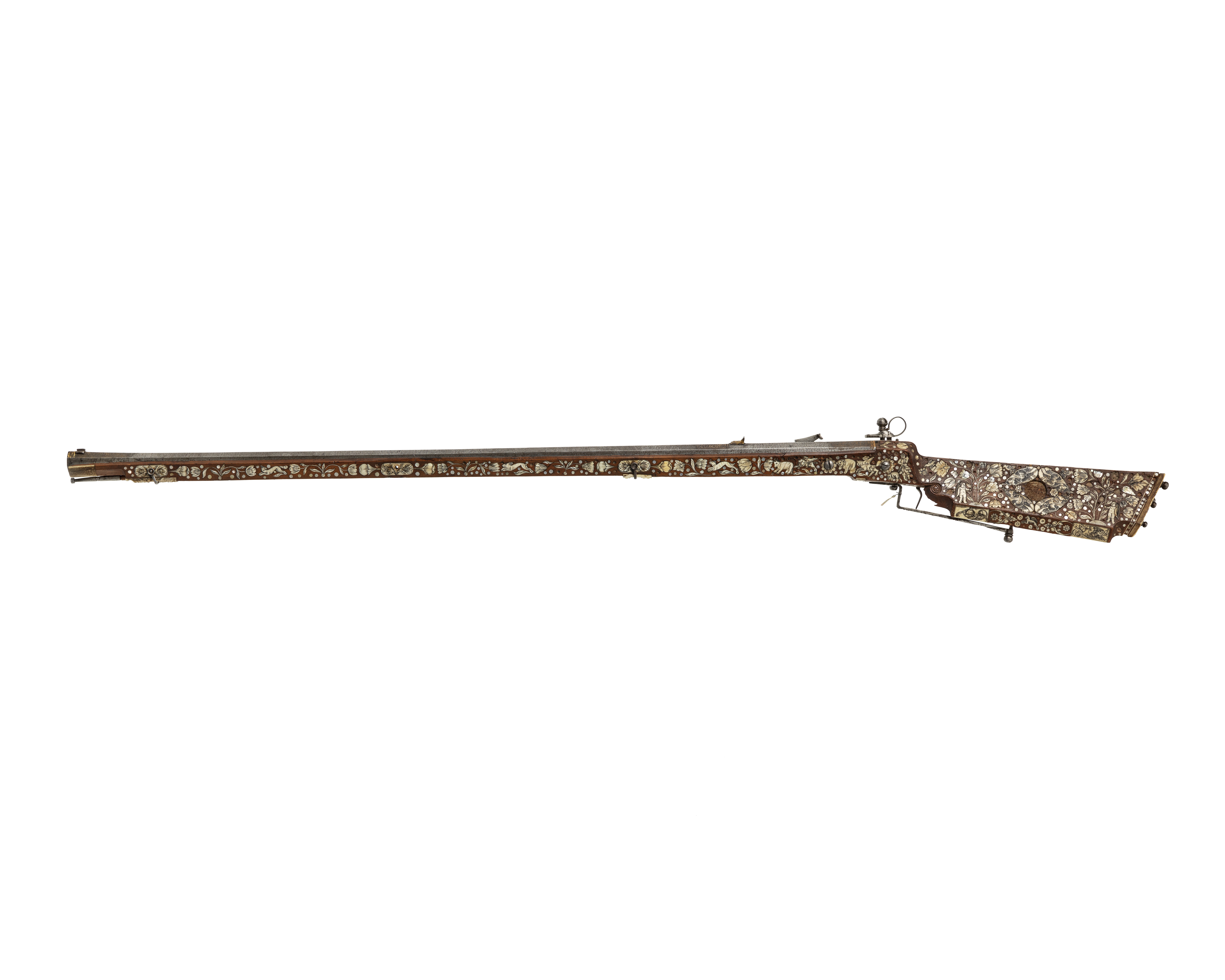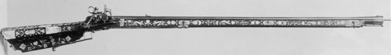 Åttsidig, damaskerad, räfflad pipa av stål, vidgad mot mynningen, skålade bommar. På kammaren framför siktet och bakom kornet partier av rankor av påslaget silver(?). Svansskruvbladet förgyllt, punsad och förgylld bård runt mynningen. Riktmedel: Förgyllt ståndsikte, stolpkorn(?). Fästning: Tre häften. Pipan fäst med krysskruv underifrån samt pipstift. Snapplås av rysk typ med plant låsbleck och utvändigt slagfjäder, punsad, graverad och genombruten dekor. Hane med lös överkäke, filning likt ett djurhuvud, ringformigt grepp, käkskruv med stort, svagt profilerat, runt huvud, lång styrtapp genom underkäken, dekor i form av djurhuvud. Hanfot utdragen framåt och bakåt (ej räta vinklar), rektangulärt tvärsnitt, tvärt avskurna ändar, hälen stöd för säkring. Säkringen med hak i form av ett djurhuvud, säkringsfjäder med filad dekor. Fängpanna med smalt tråg. Utåt vridbart fängpannelock med nedåtriktad, konturerat och genombrutet fingergrepp med dekor i form av ett hjärta och två djurhuvuden. Eldstål med rektangulär slagyta, smal fot med liten skålning på undersidan mot pipan. I vinkel böjd arm med balusterformigt filad nederdel och djurhuvuden på överdelen. Fästning och avtryckare: Två låsskruvar. C-formig avtryckare. Helstock av päronträ med yttäckande dekor av ben- och pärlemorinläggningar i form av blommor, blad, frukter och djur och punkter. Kolv av tysk typ med kolvlåda och bred vinge. Bakplåt av ben med fyra kolvkulor av stål. Kolvvinge med på båda ändar rektangulära benplattor, den främre med en mansfigur omslingrad av textband med otydlig, rysk(?) text, den bakre med en duva och rankor. Kolvlådelocket framtill och baktill med graverade benbeslag, gravyr i form av en tulpan mm, på mitten en platta med en fågel (ersatt?). På anslaget ett rankverk med avvikande gravering runt en nu bortfallen, rund-oval mittplatta samt barnfigurer. På sidbleckssidan inläggningar med bakifrån en spjutbeväpnad björnjägare till fotsoch en hare, på kolvryggens v. sida en liggande skytt, en oval med räv samt vid kolvänden en spjutbeväpnad hjortjägare till häst. På framstockens båda sidor springande djur, hare, räv, elefant, lejon och enhörning. På framstockens undersida en naken pojke. Plana, profilerade näsband av ben. Rektangulär, punsad varbygel, överrörka och spetsrörka. Tillbehör: Laddstock av trä, l: 1082 mm med skoning av stål, i ena änden profilerad och vidgad.