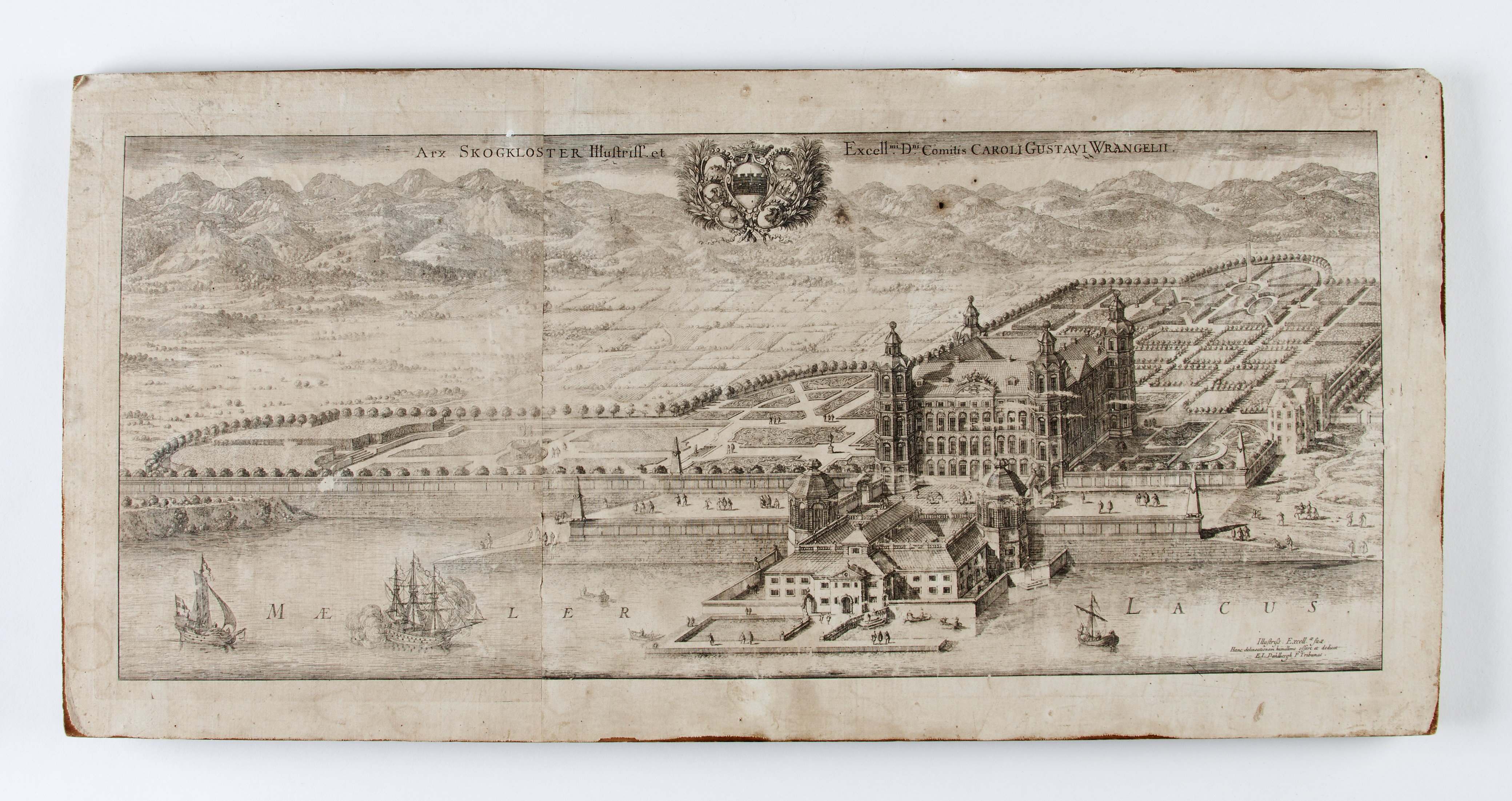 Vy i fågelperspektiv från sjön. Sign. “ Illustriss Excell. ae suae hanc Delineationem humillime offert et dedicat E.I Dahlberg p Tribuns”. Planch nr 140 ur Erik Dahlbergs Suecia et Hodierna, 1710 års upplaga. Avtryck efter plåten 270 mm h., 604 mm b. Pappret skarvat 260 mm från vänstra tryckkanten. Pappret uppfodrat på linneväv och limmat på furuskiva.