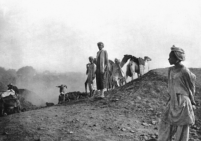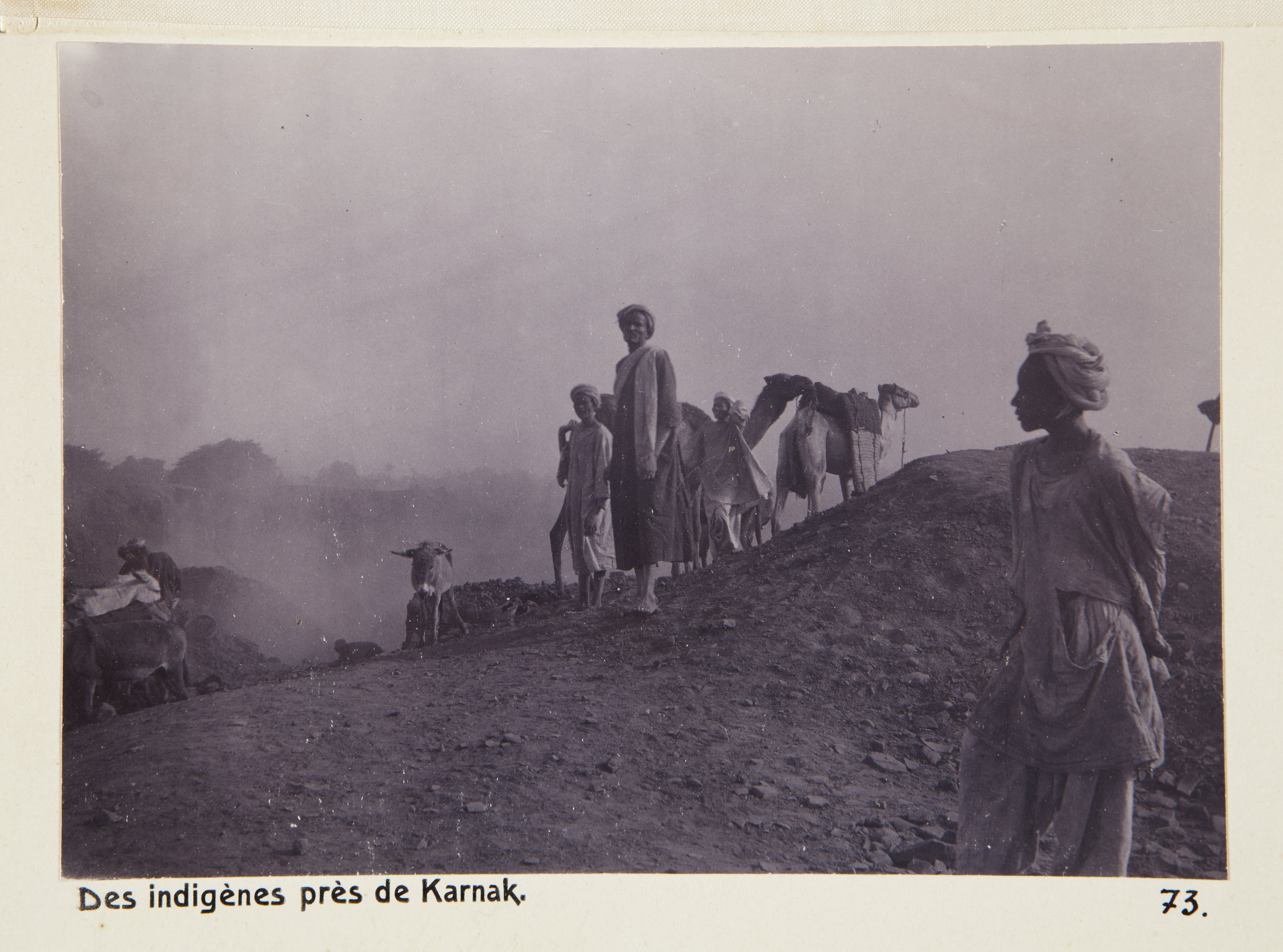 Människor på en kulle utanför Karnak. Egypten. Text på fotografiet: Des indigènes près de Karnak. Fotografierna LXVI:M.01.- 201. kommer från resan till Egypten och Sudan som Wilhelmina och Walther von Hallwyl gjorde vintern 1900-1901. De lämnade Sverige den 5 november 1900 och fortsatte från Egypten till Palestina den 28 mars 1901. Med på resan var döttrarna Ellen med maken Henric de Maré och Irma med maken Wilhelm von Geijer. Wilhelminas sällskapsdam, fröken Ida Uhse reste också med. Under en del av resan anslöt sig ledamoten av Internationella domstolen i Kairo, assessorn Otto Conrad Waldemar Cedercrantz med makan Anna Elisabeth. Vid resan uppför Nilen hade Walther von Hallwyl hyrt ångfartyget Columbia med besättning. Båtresan startade i Kairo 27 december 1900, gick ända till Wadi Halfa varifrån man reste vidare med tåg till Khartum och tillbaka till Wadi Halfa. Båten vände åter i riktning mot Kairo, men det verkar som att sällskapet tog tåg sista biten, från Luxor. Henric och Ellen de Maré samt fru Cedercrantz lämnade båten redan då de passerade Luxor första gången. Resten av sällskapet återvände till Kairo den 1 mars. Fotografierna LXVI:M.01.-120. togs av resenärerna själva, de största av Ellen de Maré, de mellersta av Wilhelmina von Hallwyl och de minsta av Wilhelm von Geijer. Resten köptes av professionella fotografer i Kairo, de flesta från Studio Photogr. Artistique G. Lekegian & Cie. Alla uppgifter kommer från Ida Uhses reseanteckningar.