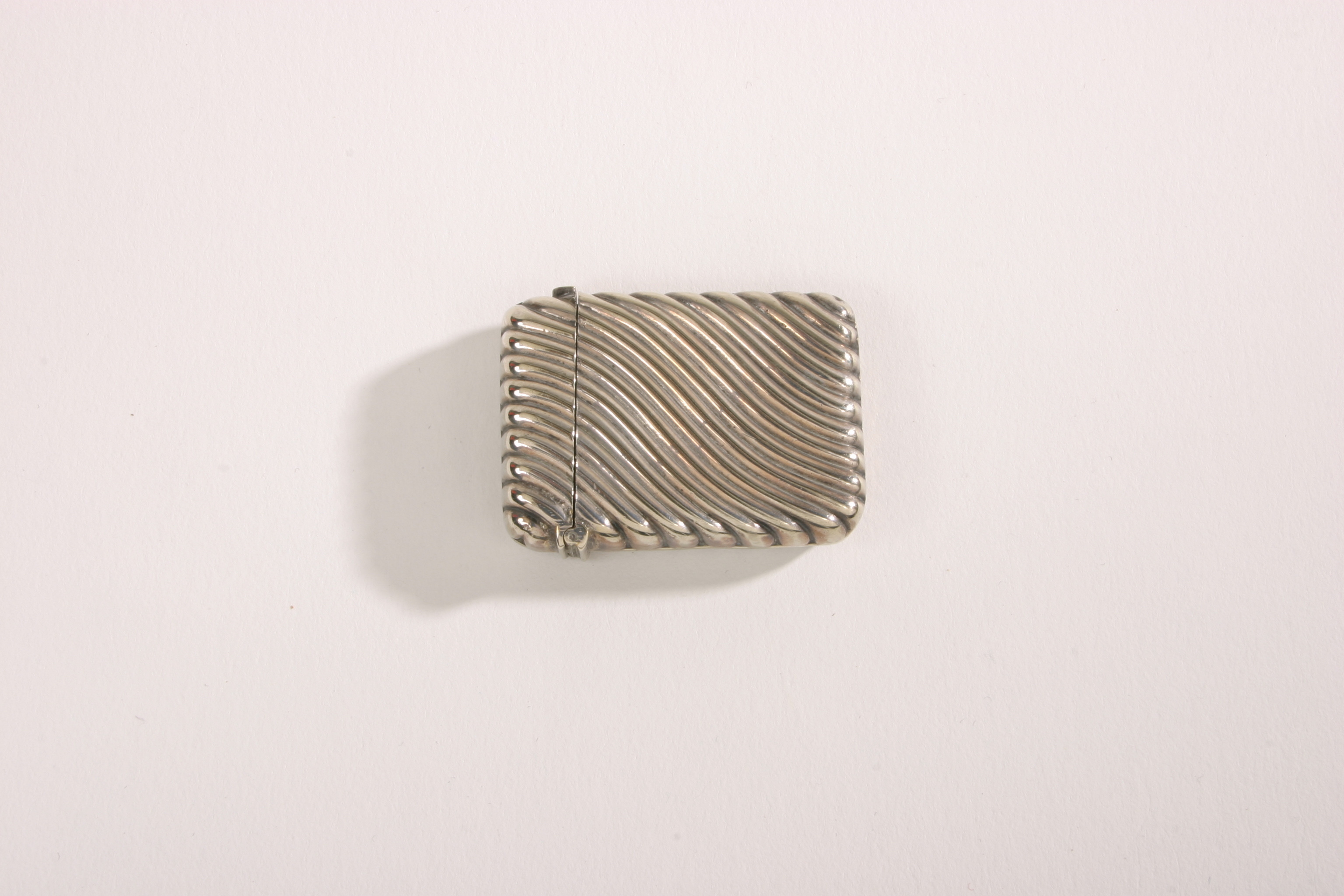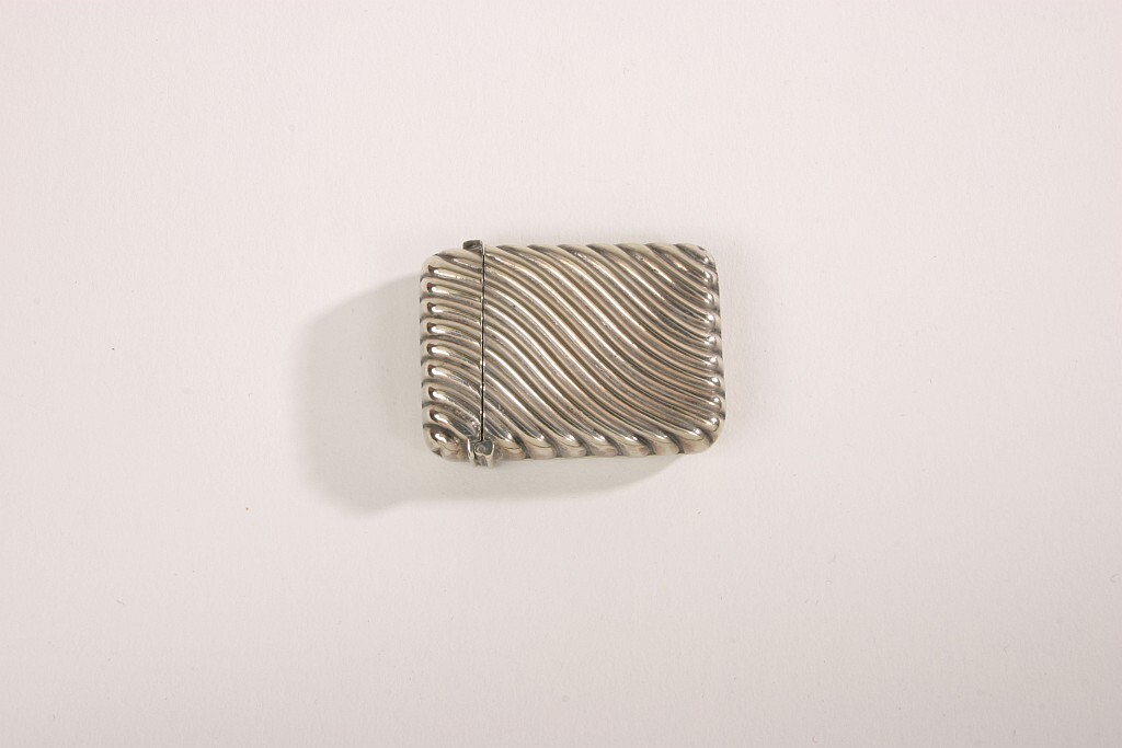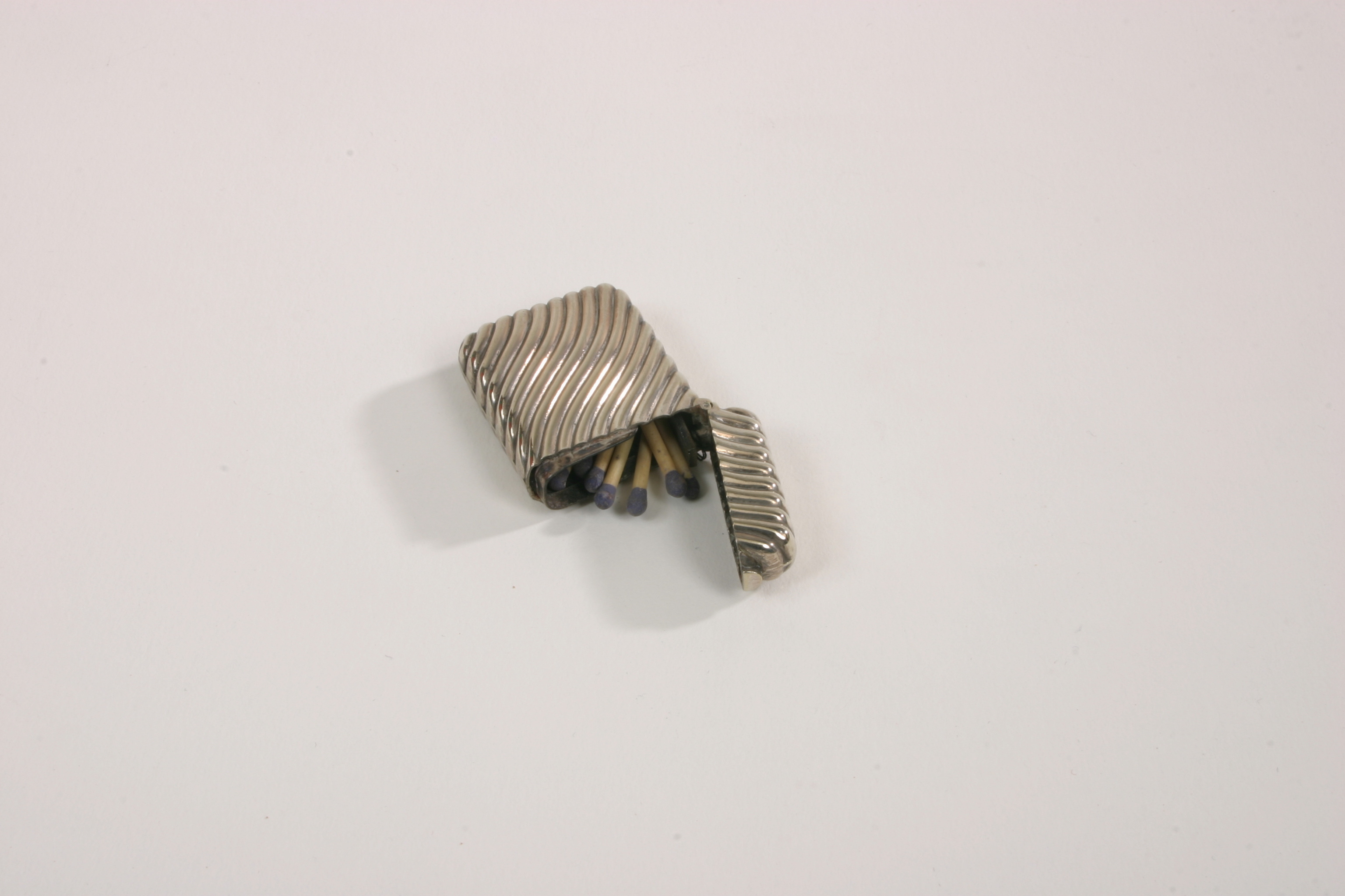 Litet plant, rektangulärt tändsticksfodral av nysilver med kannellerad dekor i form av sneda, vågformiga räfflor. Fjäderbelastat uppfällbart lock. I fodralet 14 tändstickor med lila svavel.