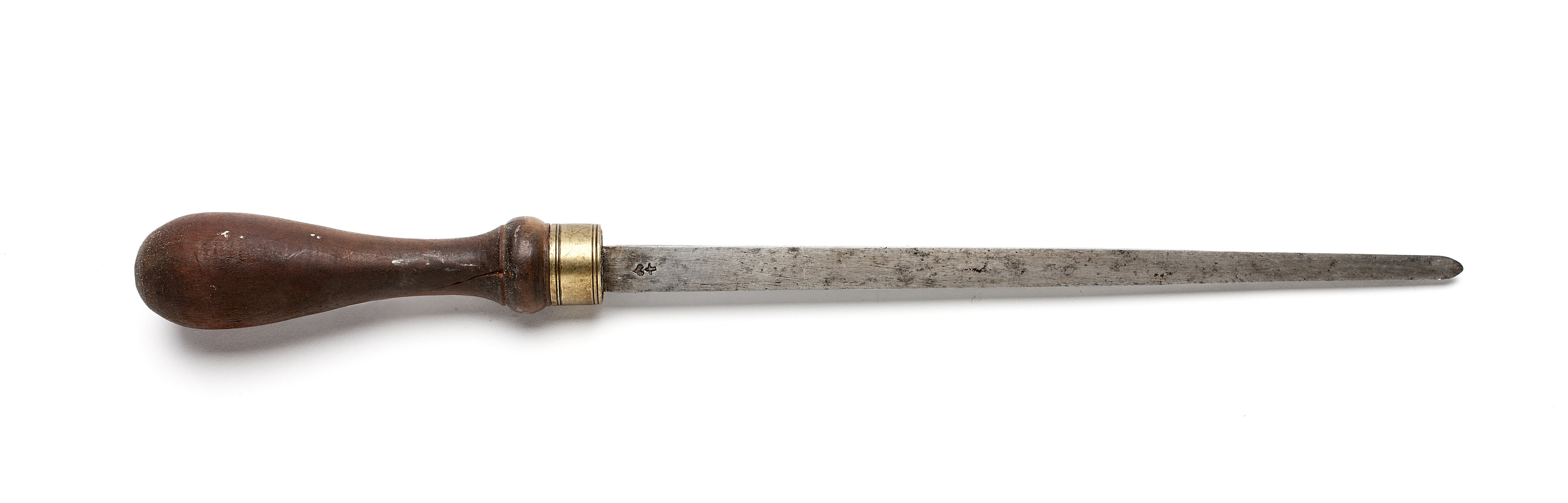 Klinga med rektangulär genomskärning. Undre kanterna avfasade i änden. Stämplat på klingan: hjärta under kors. Svarvat skaft av päronträ, med en vulst nedtill. Mässingsring.