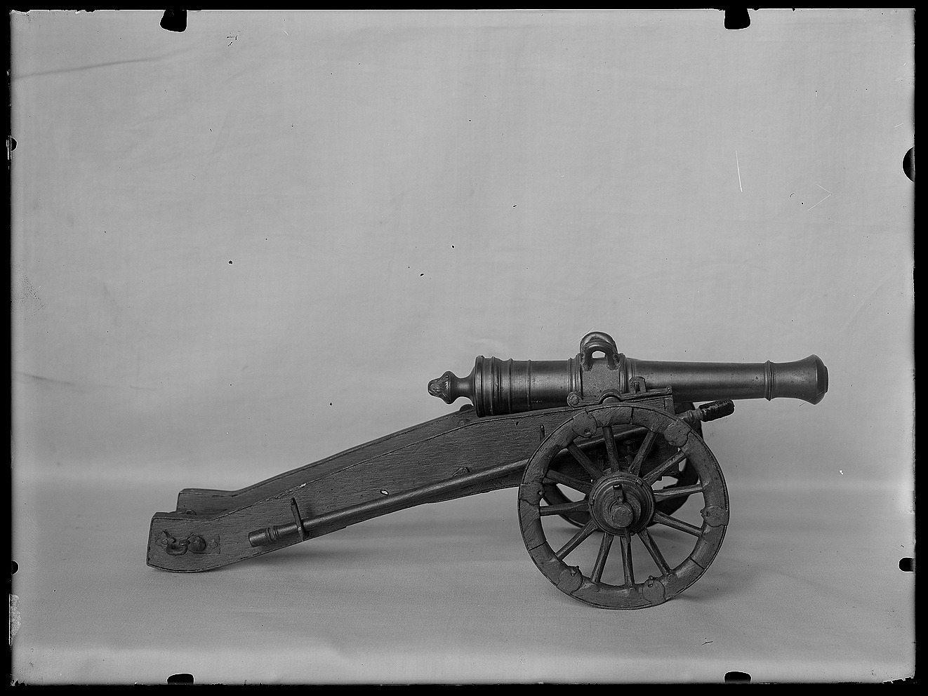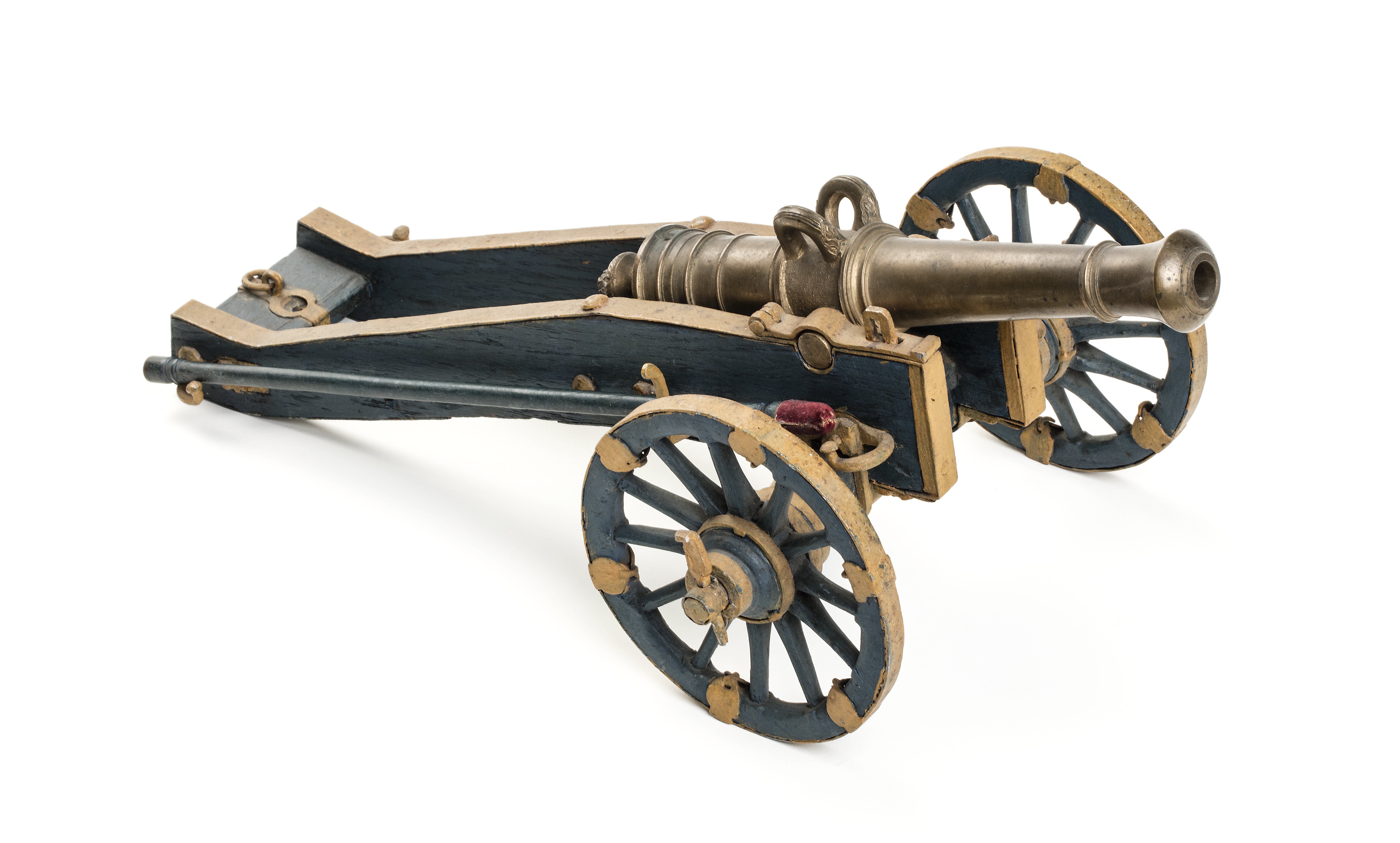 Framladdad verklighetstrogen miniatyr med rör av mässing och detaljerad lavett av blåmålat trä med detaljer av stål målade i gult. Kanonrör av gjuten och svarvad mässing, slätborrad med kaliber 10,25 mm. Röret med trumf avslutad med ringar, hantag med räfflad ovansida och i ändarna fält med skurna blad. Kammaren med svarvade ringar, fänghål upptill. Avslutas baktill med druva med skuren bladdekor mot prickpunsad botten. Lavett och hjul av ek målad i blå färg. Skoning och detaljer av stål målad i gult. Lavetten med långa svagt s-fomigt svängda gavlar, sammanhållna an platta tvärslåar framtill, baktill och i mitten. Fyrsidig hjulaxel, fäst med beslag av stål. Hjulen med tolv ekrar, skoning med sex beslag av stål. Laddstake, l 272 mm, av trä målad i samma kulör som lavetten. I ena änden viskare av rödaktig sammet och svarvad ring, i den andra svarvad ring och cylindrisk, tvärt avslutad ansättare. Tureholm