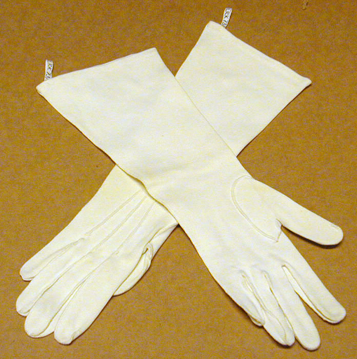 Lång vit handske av stickat bomullstyg. Sydd. Tre prydnadsvalkar, längsgående över handens ovansida, kantade med laskade sticksömmar.