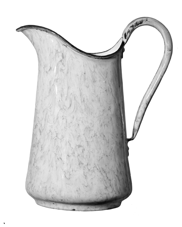 TILLBRINGARE Av emaljerad stålplåt, utanpå gråspräcklig, inuti vit. Rund, avsmalnande uppåt, med utsvängd snås och indragen plan botten; kring mynningen en stav i blått; handtag flackstavigt och bågformigt utsvängt. Höjd: 19,5 cm.; diameter: 11,2 cm.
