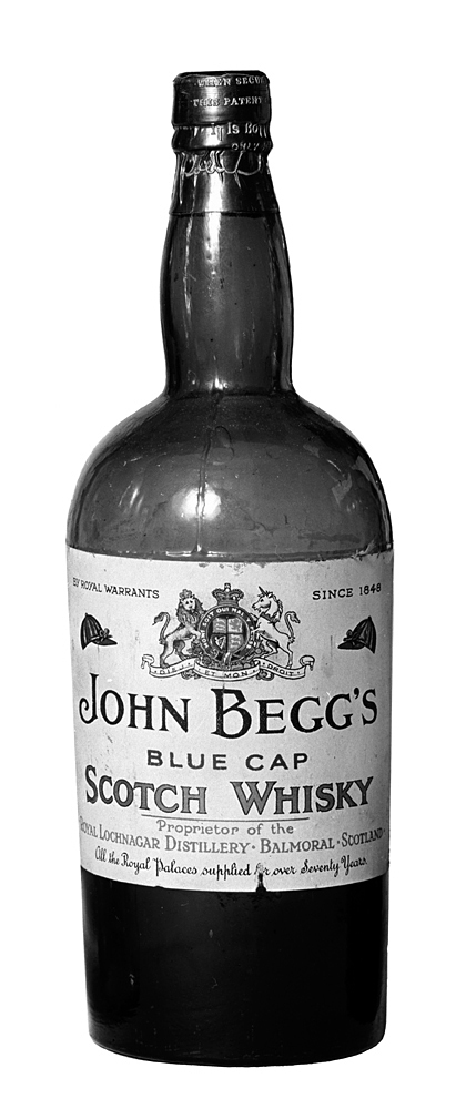 "BLUE CAP", John Begg, Proprietor of Royal Lochnagar Distillery, Balmoral, Scotland, åtta helbuteljer. Av gulgrönt glas. Cylindriska, med kupigt indragen skuldra och spolformig hals med en bred och en smal stärkring; bottnen skålig. Etikett vit, på denna text i guld, rött, blått och svart, dessutom upptill i färger Storbritanniens riksvapen (hovleverantörsmärke), på ömse sidor därom en blå jockeymössa. Kapsylfragment av förtent bly, blåfärgat, med text i förgylld relief. Höjd: 29,1 cm.; diameter: 9,8 cm.