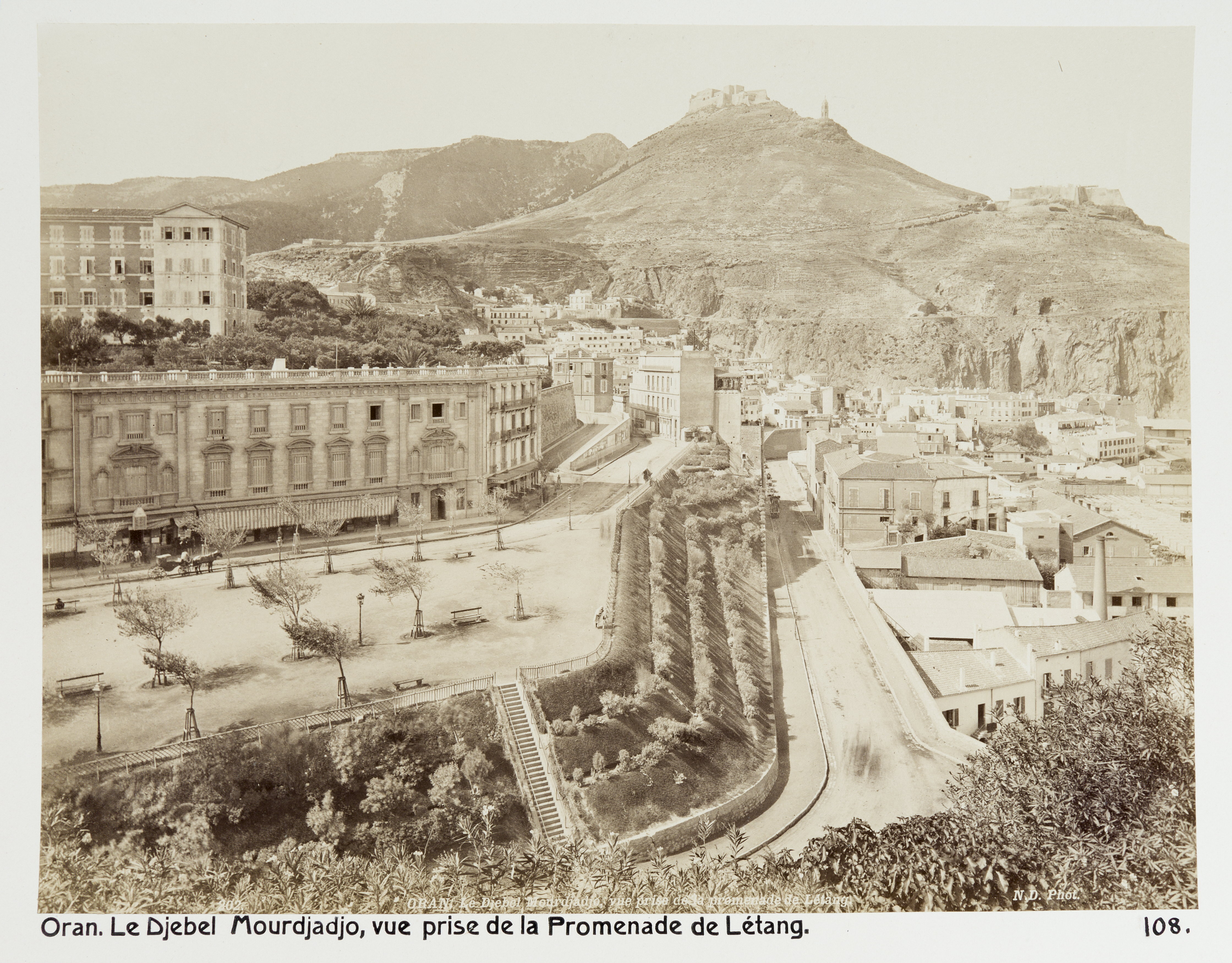 Oran. Bergskedjan Djebel Mourdjadjo. Vy från dammpromenaden. Bilden är en dubblett till LXVI:F.112. Bilderna med inventarienummer LXVI:K.H.01.-137. är inköpta av Johanna Kempe, f. Wallis, i Alger, Biskra, Tunis, Constantine, Oran och Blidah vid hennes vistelse i nämnda städer tillsammans med sin dotter och svärson, Wilhelmina och Walther von Hallwyl, dotterdottern Irma samt fröknarna Caroline Pflaum och Ida Uhse under deras resa genom Algeriet och Tunisien samt åter över Schweiz 11 februari - 19 maj 1889. Förestående uppgifter lämnade med ledning av fröken Ida Uhses Reseanteckningar. Vissa av bilderna är dubbletter till bilder i inventarienummerserien LXVI:F.01.-138. som köptes in av Wilhelmina von Hallwyl under samma resa.