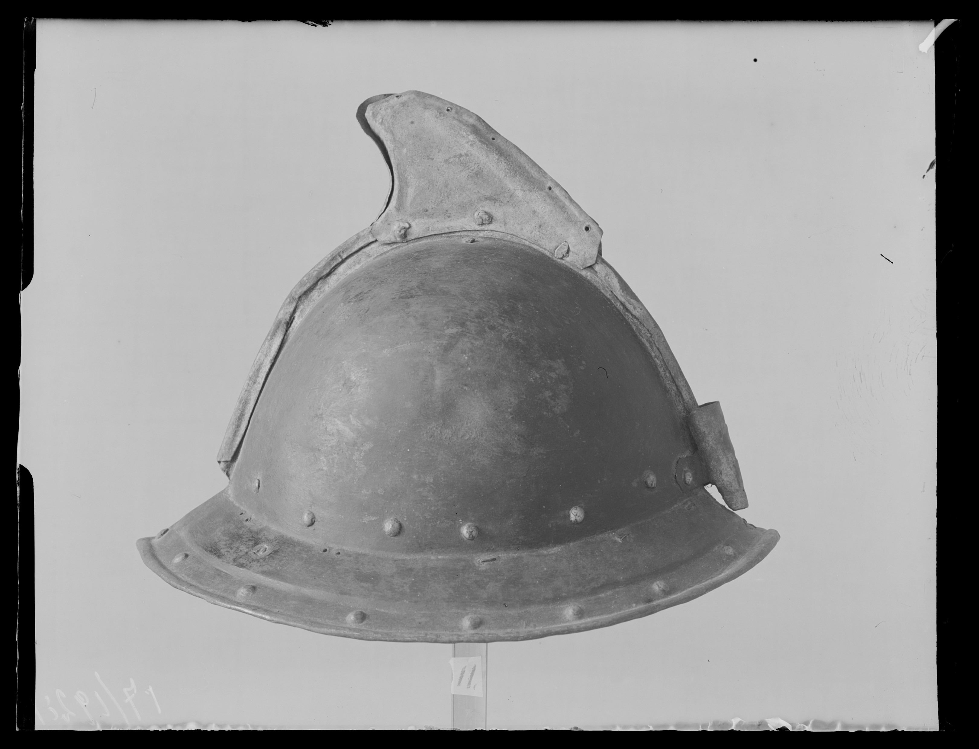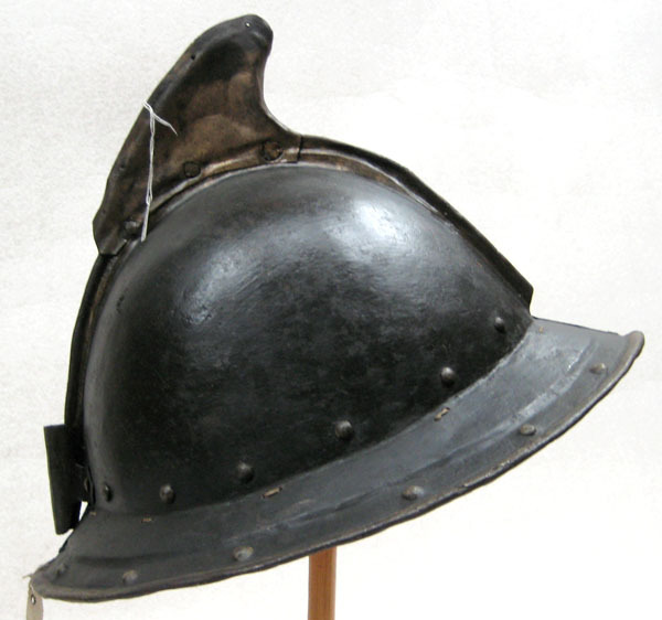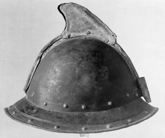 Av driven stålplåt. Utsidan målad svart med nederkant, kamkant och vinge ursprungligen guldgula, tydliga filspår. Insidan med slagmärken. Hjälm bestående av två halvor, sammanfogade i en längsmed klockan löpande kam, omvikt och förstärkt. Klockan rundad. Upptill på kammen är en senare (under 1700-talet) nitad dekoration i form av en trekantig något framåtsvängd vinge av bleckplåt, av två halvor fäst i kammen med tre nitar. Nertill övergår klockan i ett brätte, något neddraget med invikt rundsmidd kant och försänkt bård med falska uppdrivna nitar. På klockan baktill en plymhållare, H 60 mm, nedåt avsmalnande med tre hål, fäst med två nitar. I klockan nertill på var sida nitar i rad. I kanten där brättet möter klockan är en rad av små slagna hålpar hela vägen runtom. I klockan mitt på är ett liknande hålpar, ett på var sida kammen. I brättet baktill ett från insidan slaget hål, framtill på vänstersidan punsad stämpel liknande ett D. Hjälmfoder av grov lärft, hopsytt av två halvor. Under detta en stoppning av linblånor. Fodret är fastsnört i brättetts hålpar med linnetråd.