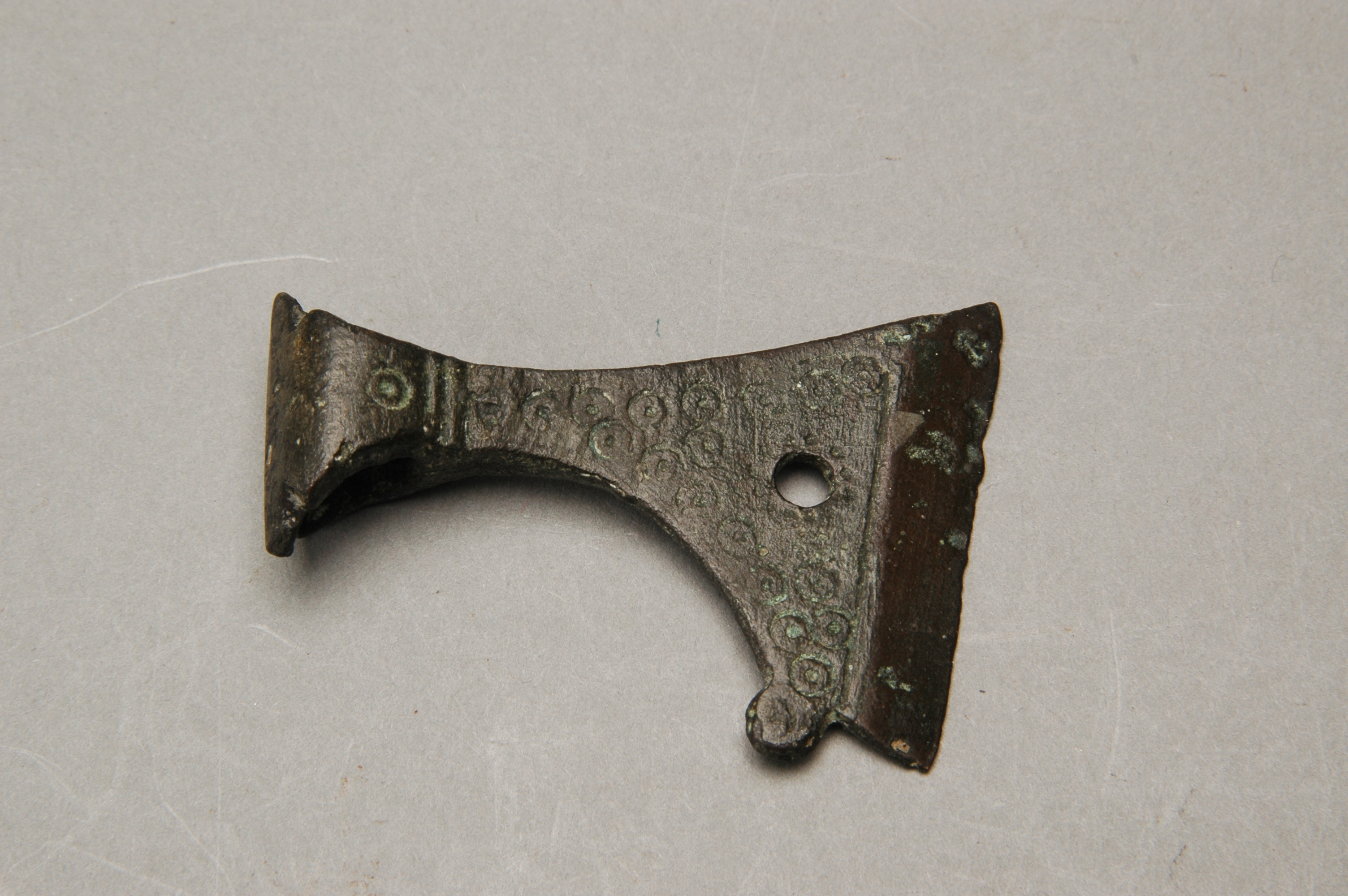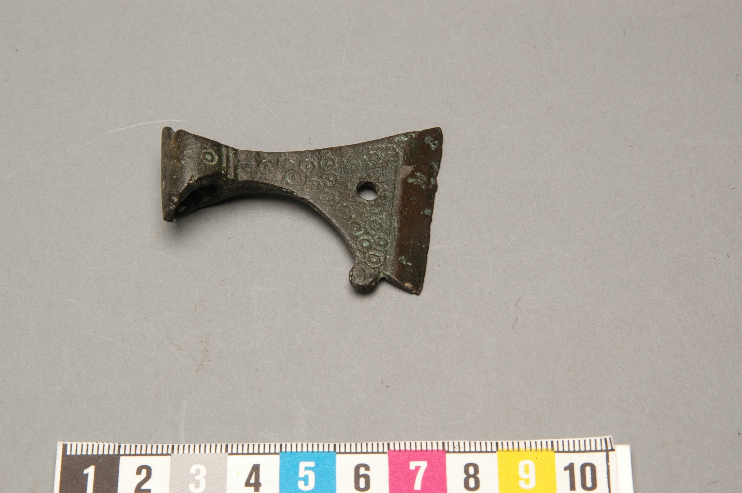 Miniatyryxa av brons, ornerad.