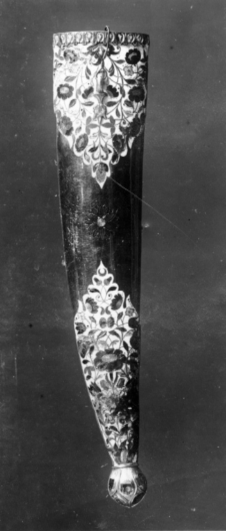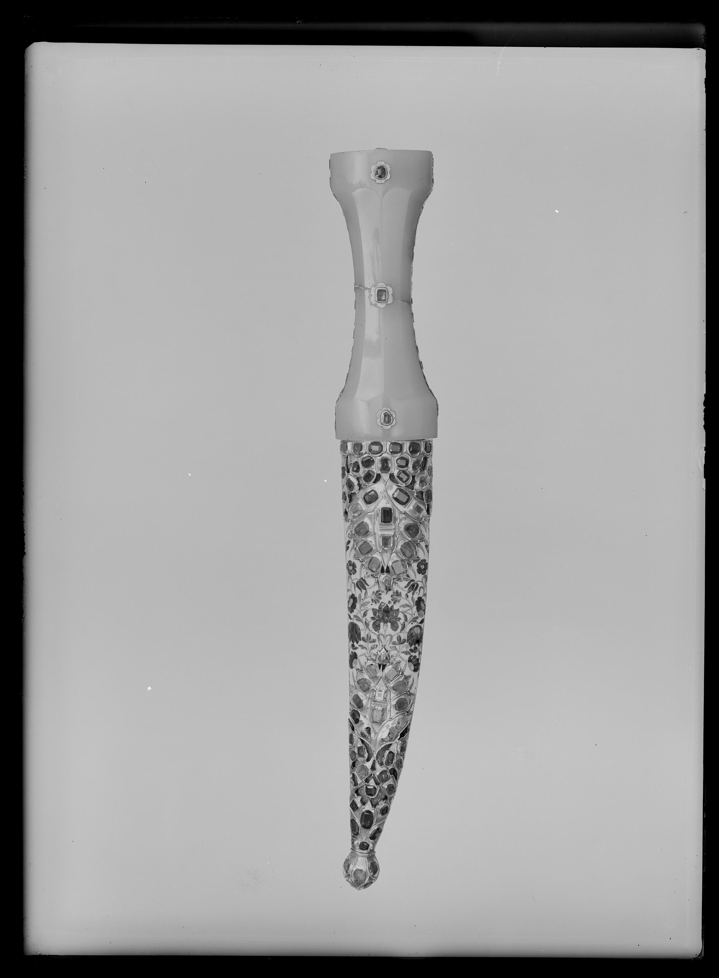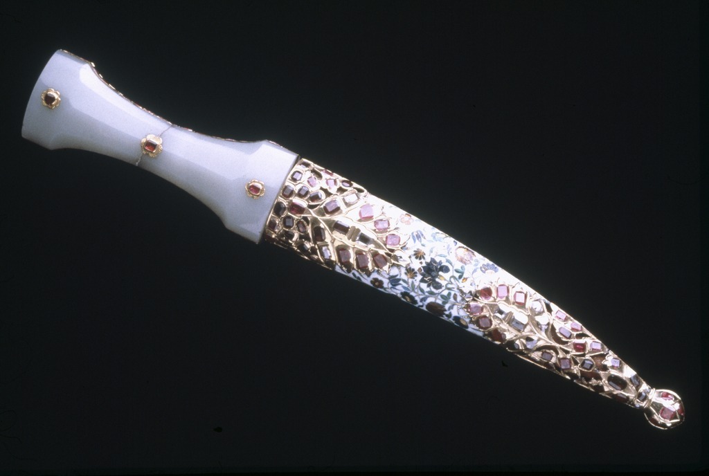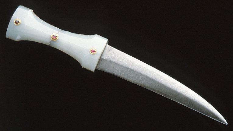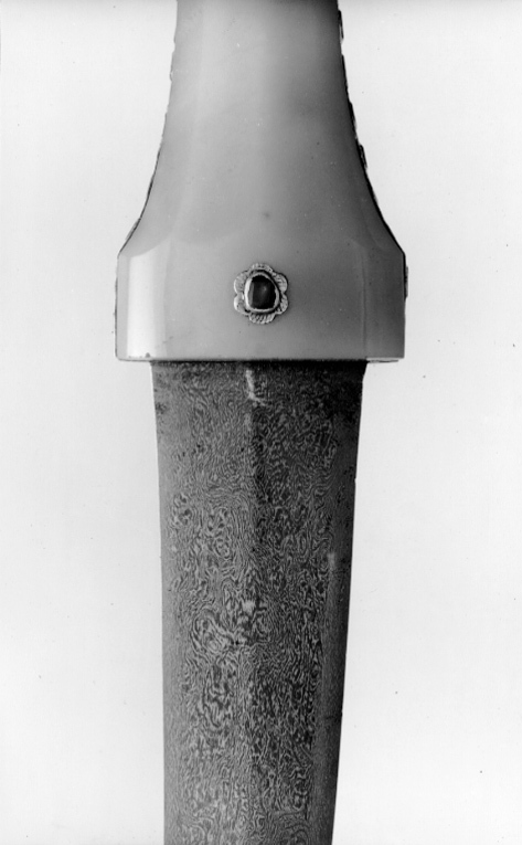 Timglasformat fäste med kärna av metall med kant av pålagt förgyllt silver, däri infattat 40 rubiner, slät fattning. Sidor av ljus grågrön jade med mittparti slipat i fyra faser. På vardera sidan tre blomformiga beslag av guld, däri infattat rubiner, på fästets översida ett likadant beslag, placerat över kärnan. Tvåeggad, damaskerad klinga (wootz) med jämnbreda, varandra mötande skär, ena eggen rak, den andra eggen uppåtböjd mot den andra.