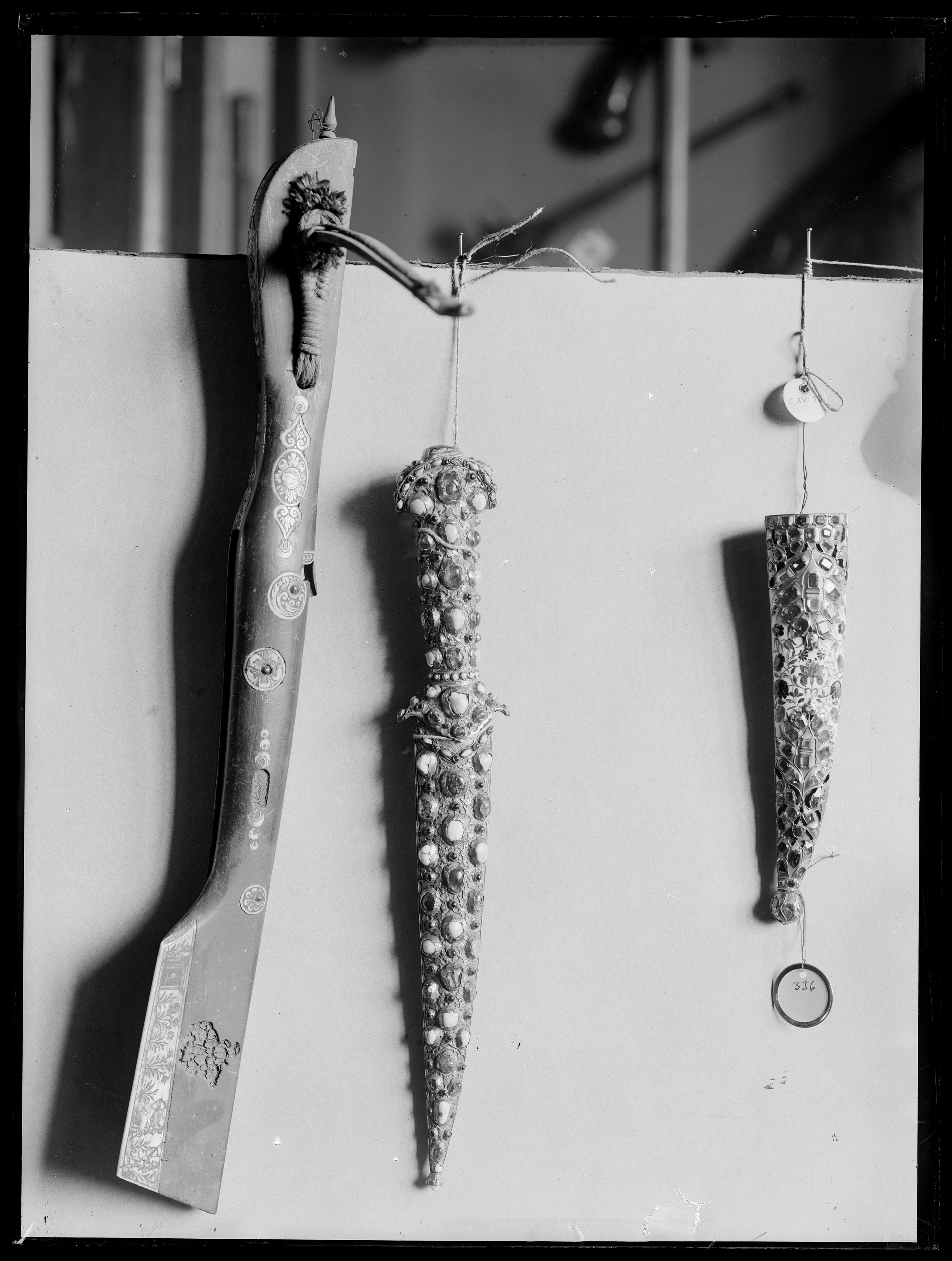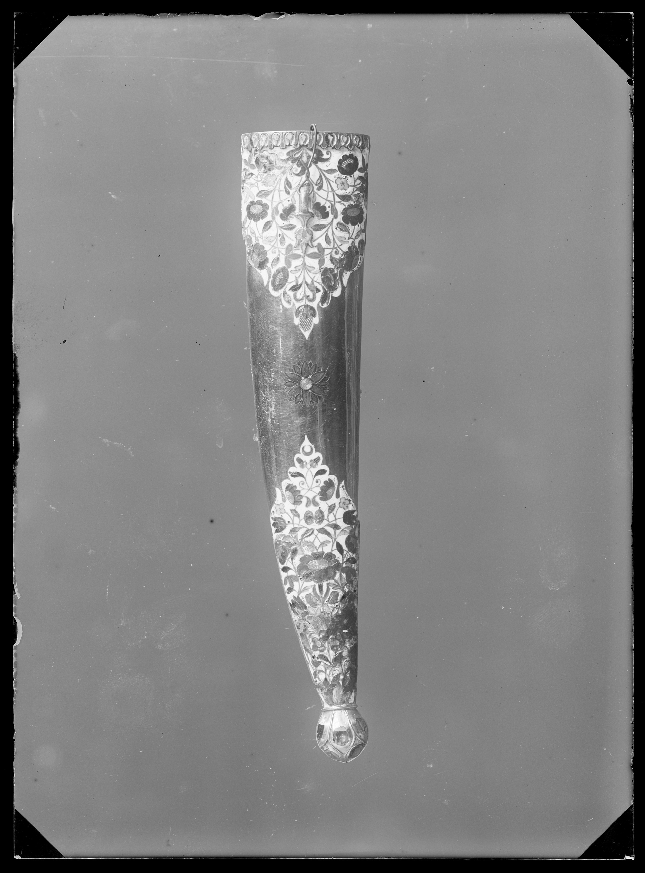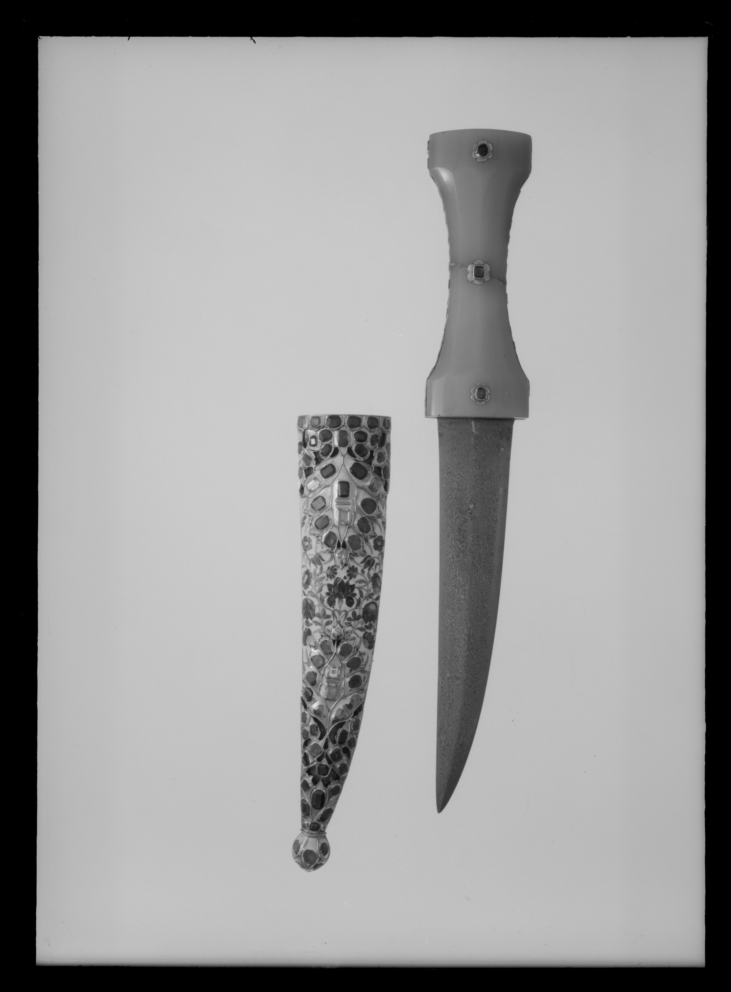 Timglasformat fäste med kärna av metall med kant av pålagt förgyllt silver, däri infattat 40 rubiner, slät fattning. Sidor av ljus grågrön jade med mittparti slipat i fyra faser. På vardera sidan tre blomformiga beslag av guld, däri infattat rubiner, på fästets översida ett likadant beslag, placerat över kärnan. Tvåeggad, damaskerad klinga (wootz) med jämnbreda, varandra mötande skär, ena eggen rak, den andra eggen uppåtböjd mot den andra.