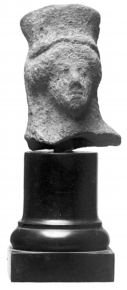 HUVUD (kvinno-) från Girgenti, Sicilien. Av gulrött, bränt lergods. Ögon otydliga,; lockigt hår, nedfallande på axlarna, hög huvudbonad, nedtill med ett stafformat band och baktill urholkad; baksidan ej utarbetad. Huvudet från en byst eller statyett; halsen med brottytor. Mått: Höjd: 5,9 cm.; bredd, från sidorna: 4 cm., framifrån bakåt: 3,2 cm.