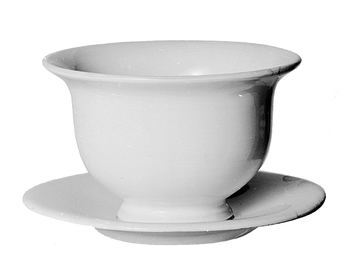 SÅSSKÅLAR, två stycken, med fastsittande fat av porslin. Omvänt klockformiga, på svagt profilerad insvängd låg hals; fat med utsvängd bräddkant och plan botten samt på låg fotkant; i bottens mitt ett runt hål. H: 9,1; D: 13,3 cm. Fat: D:15,6 cm.