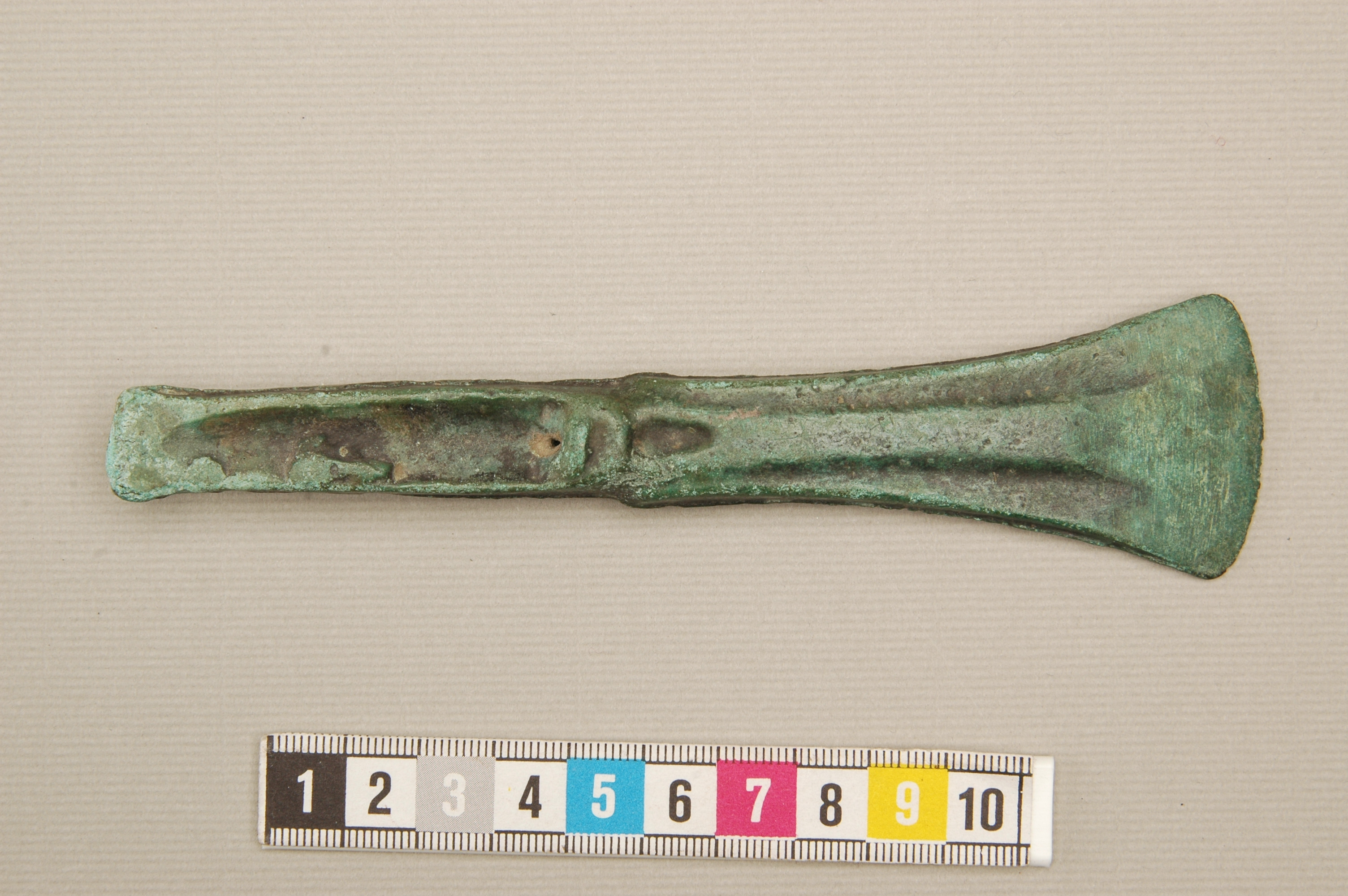 Avsatsyxa av brons, tydligen ett sekunda arbete, med kraftiga gjutsömmar, hål i godset vid avsatsen och överflödiga metallklumpar på överdelen. Mitt på varje sida en svag men bred ås med en fördjupning uppe vid avsatsen. Utmed varje kant en bred, svag fåra.