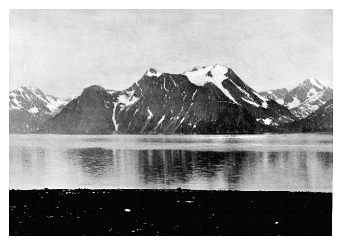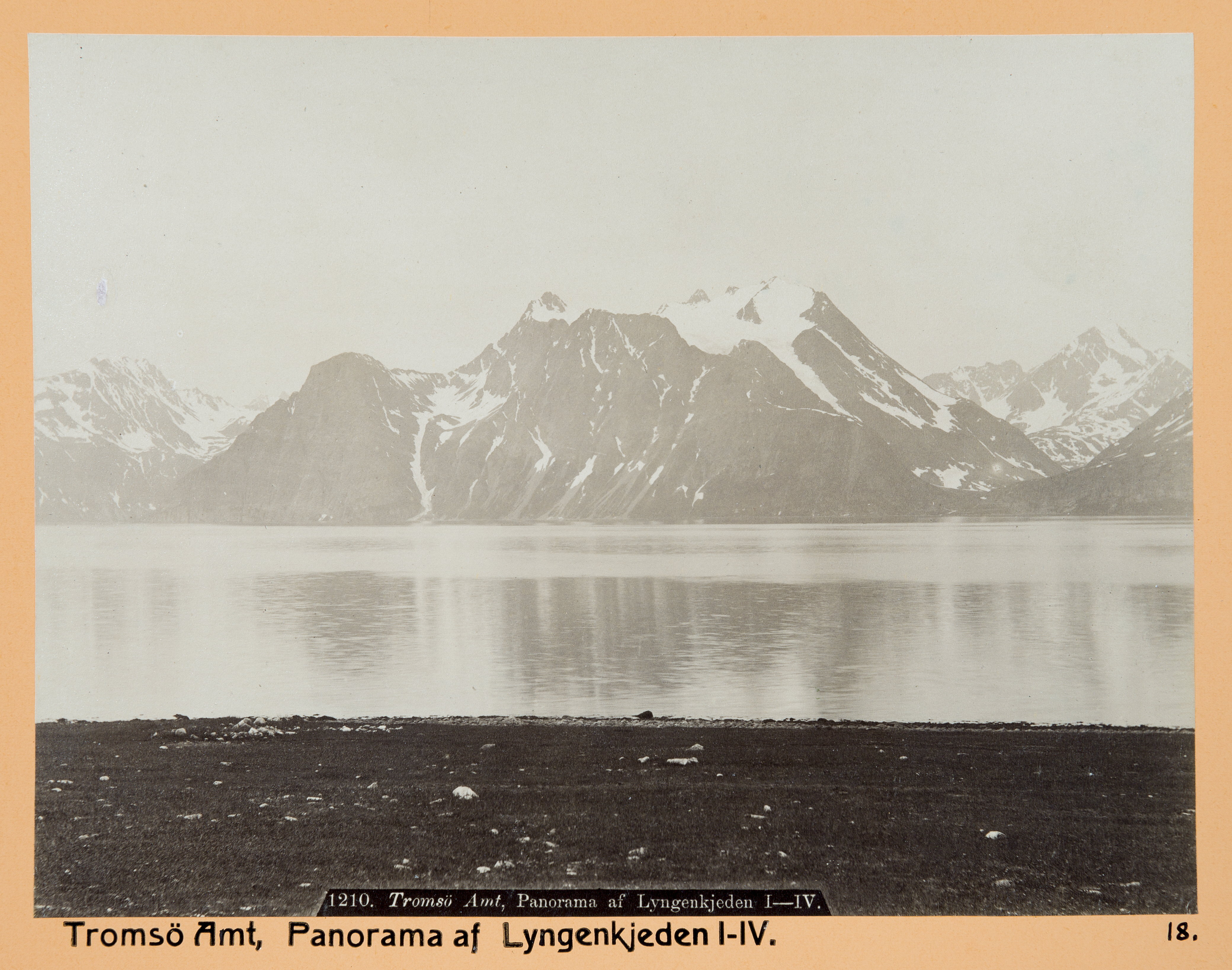 Panorama över Lyngenkjeden (Lyngsalpan?) nära Tromsö. Fotografierna LXVI:C.01.-33. är inköpta av Wilhelmina von Hallwyl, f. Kempe, i Trondheim, Tromsö och Hammerfest under en resa till Norge tillsammans med maken Walther von Hallwyl, modern Johanna Kempe, döttrarna Ebba, Ellen och Irma, Walthers svägerska Ester von Hallwyl, f. von May, från Schweiz, med sina döttrar Hilda och Irma samt fröknarna Caroline Pflaum och Ida Uhse. Gruppen reste med ångbåten Capella från Trondheim till Nordkap och åter till Trondheim, 1-15 juli 1886. Uppgifterna kommer från Ida Uhses reseanteckningar.