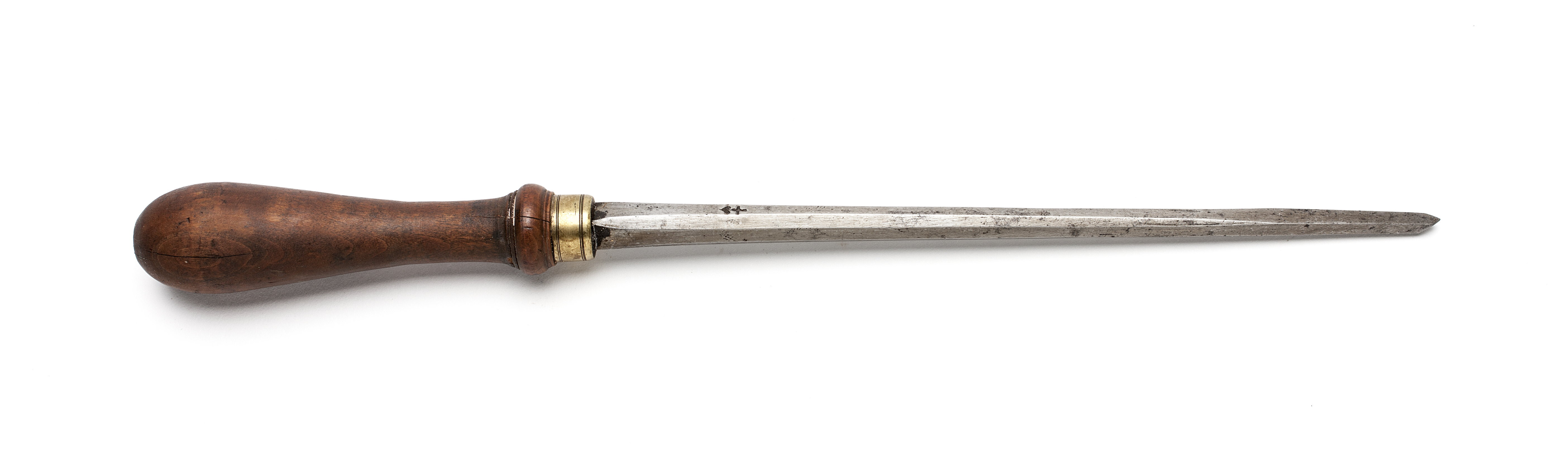 Klinga med åttkantig genomskärning, i änden sexkantig. Stämplat på klingan: hjärta under kors. Svarvat skaft av päronträ, med en vulst nedtill. Mässingsring.