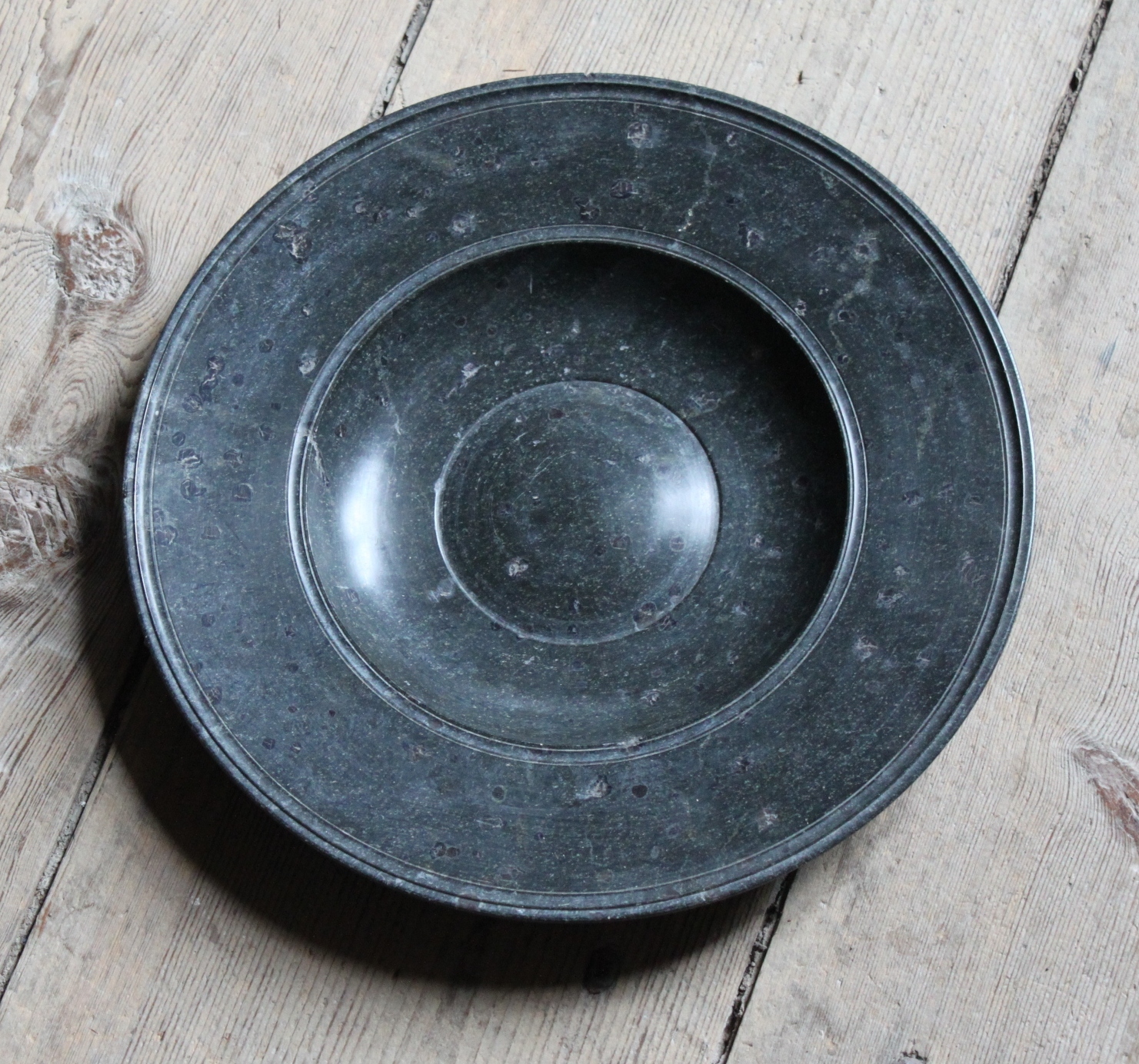 Flat spegel , mjukt rundad hög kep , svagt uppböjt brätte.