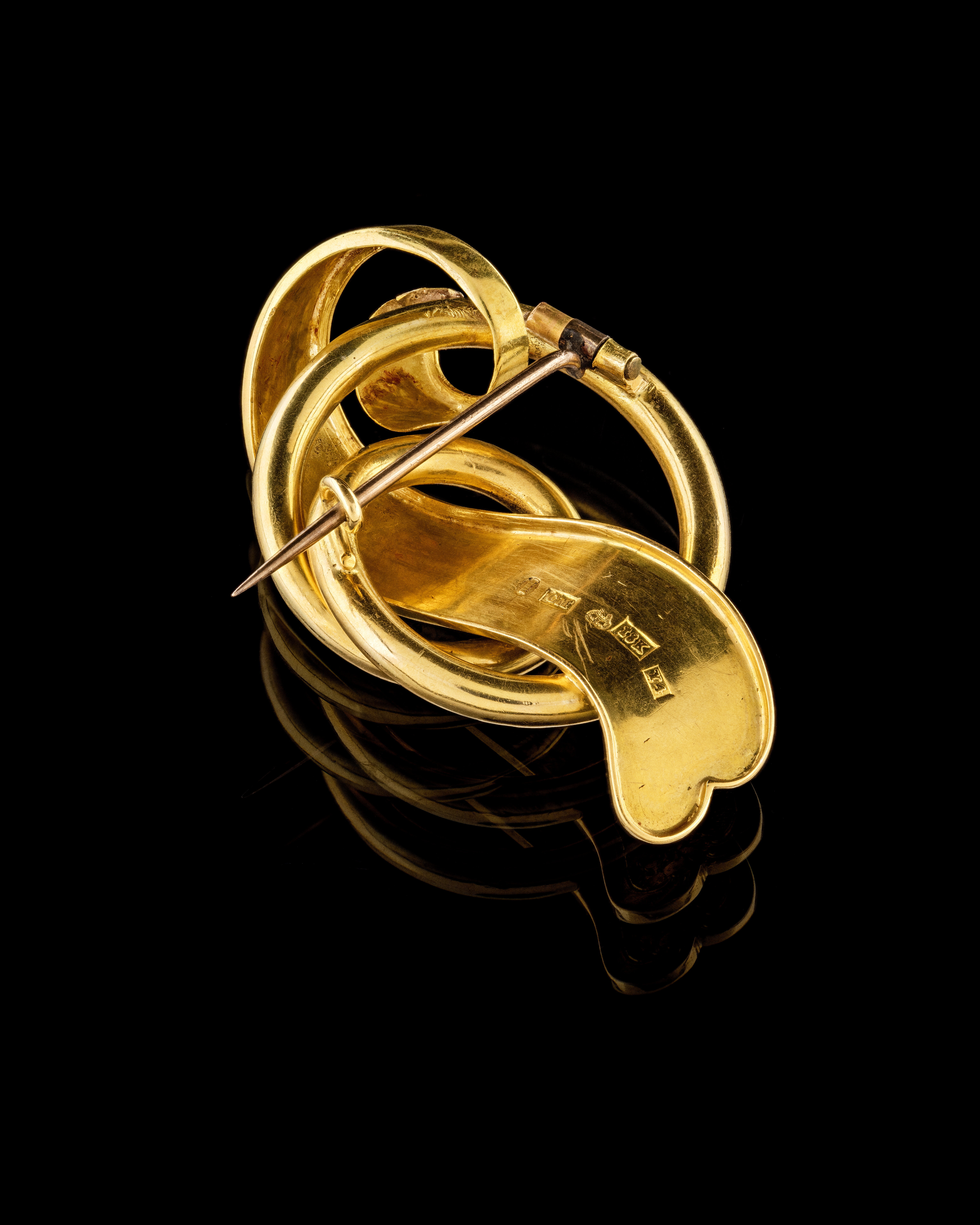 Bestående av två broscher samt ett par örhängen i etui. De nästan identiska broscherna, den ena stor och den andra liten, fick Johanna av sin make Wilhelm Kempe år 1853 respektive 1854. Den mindre broschen har en avbruten hake som indikerar att den kan ha använts även som hängsmycke. Broscherna består av en knut i rundstav vars yttersta ände har valsats ut och smyckats med blomsterrankor i relief. Att broschernas nedre del formpressats syns extra tydligt bakifrån. Där syns också bland annat juvelerarfirma Gustaf Möllenborgs stämpel. Möllenborg var en av de stora firmorna som efter skråväsendets avskaffande i Sverige år 1846 började importera och tillverka smycken enligt de nya, moderna teknikerna för det köpstarka borgerskapet. Örhängena är också från Möllenborg, men tillverkade med ett decenniums mellanrum, 1853 respektive 1863. Sannolikt lät Wilhelm Kempe ersätta ett örhänge som husrun tappat. De består av en knut i rundsatv med synliga blomdekorationer. Johanna finns avporträtterad med garnityret på en målning från år 1865 i Hallwylska museets samling. Målningen är gjord av konstnären Édouard Boutibonne under dottern Wilhelminas bröllopsresa. JeSo, 2016-03-10