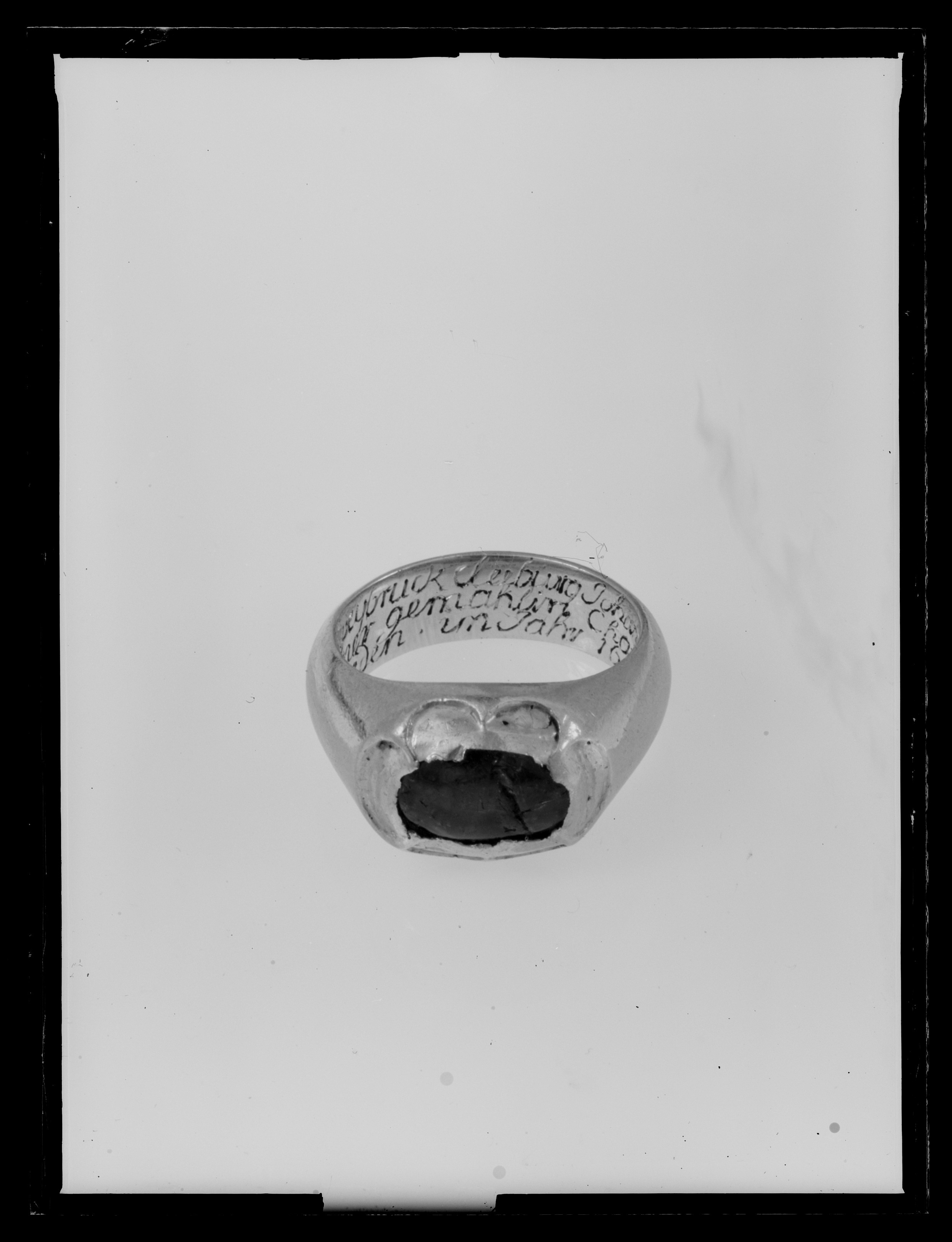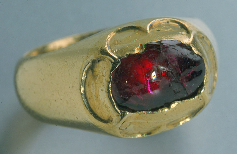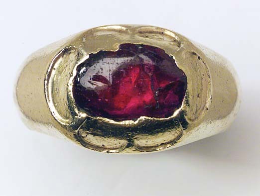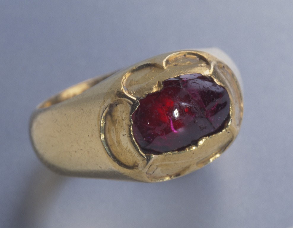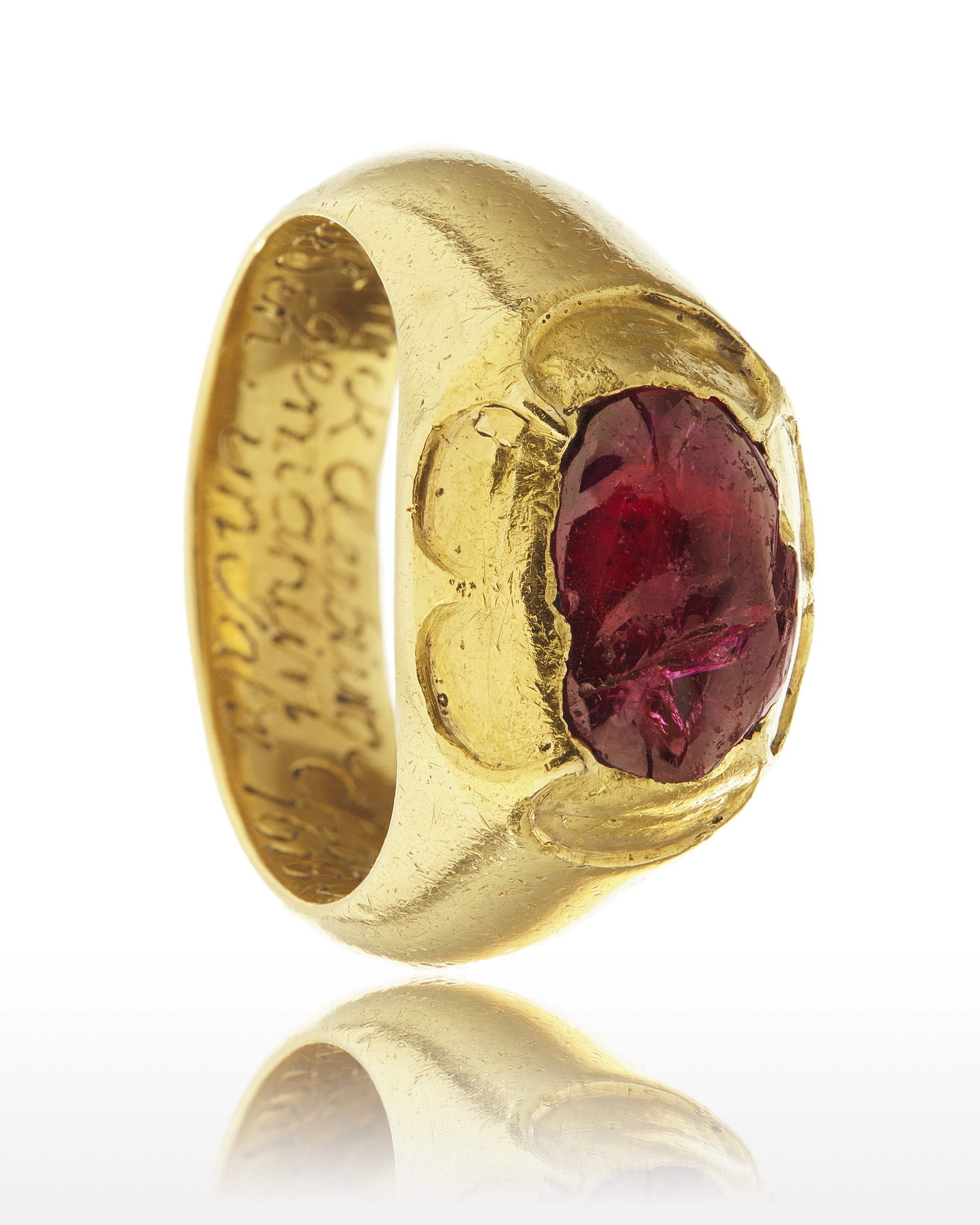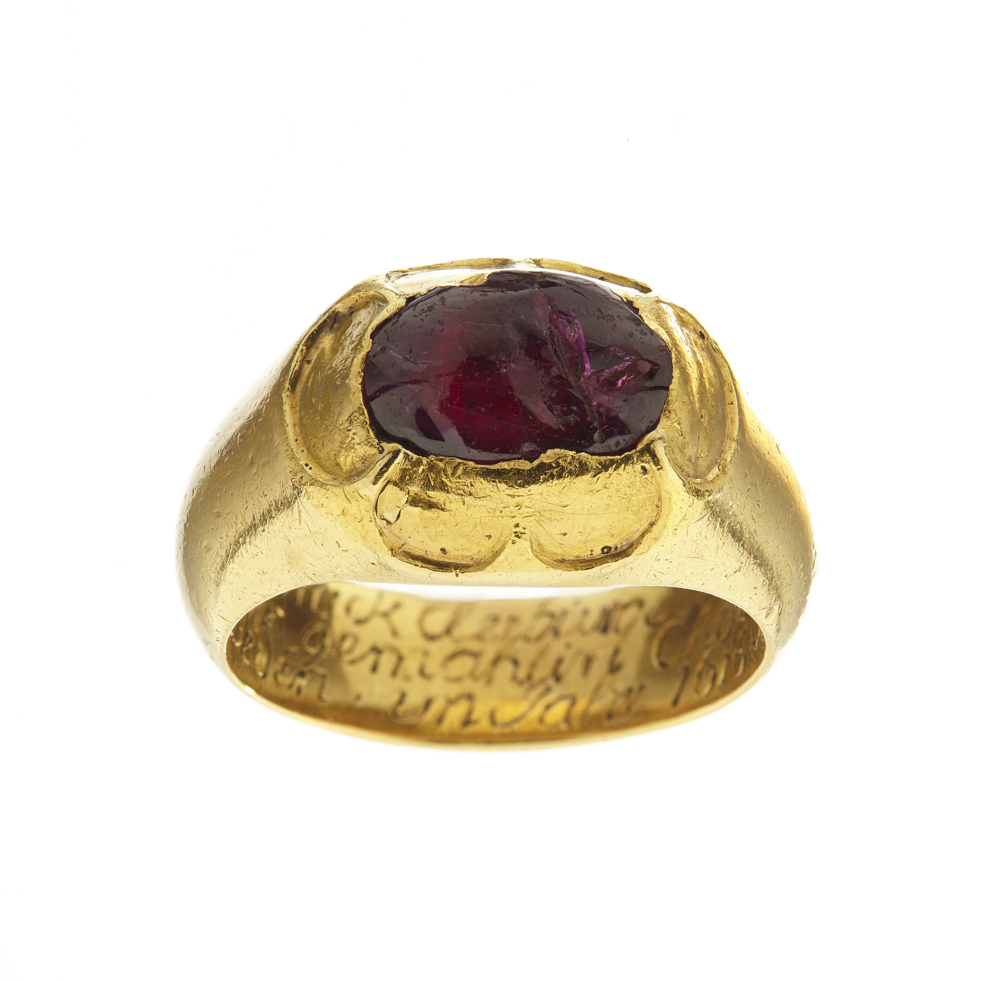 Massiv guldring, uppåt förtjockad till fattning för cabochonslipad rubin, avdeckt fattning. På ringens insida graverat:"des Pfalzgraf zu Zweibruck Cleeburg Johan Casimire: // traur ring mit seiner gemahlin Chatarina // printzesin zu Schweden in Jahr 1615 d.11 Junij".