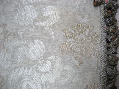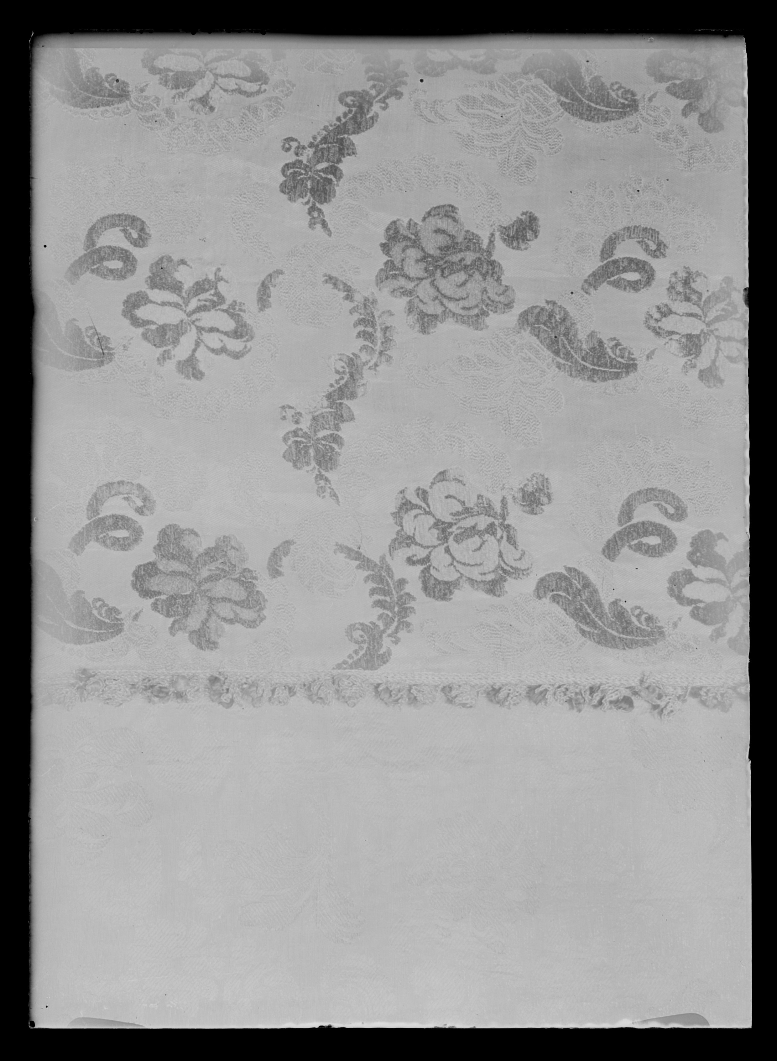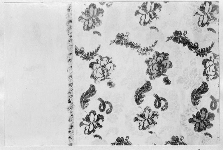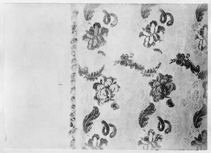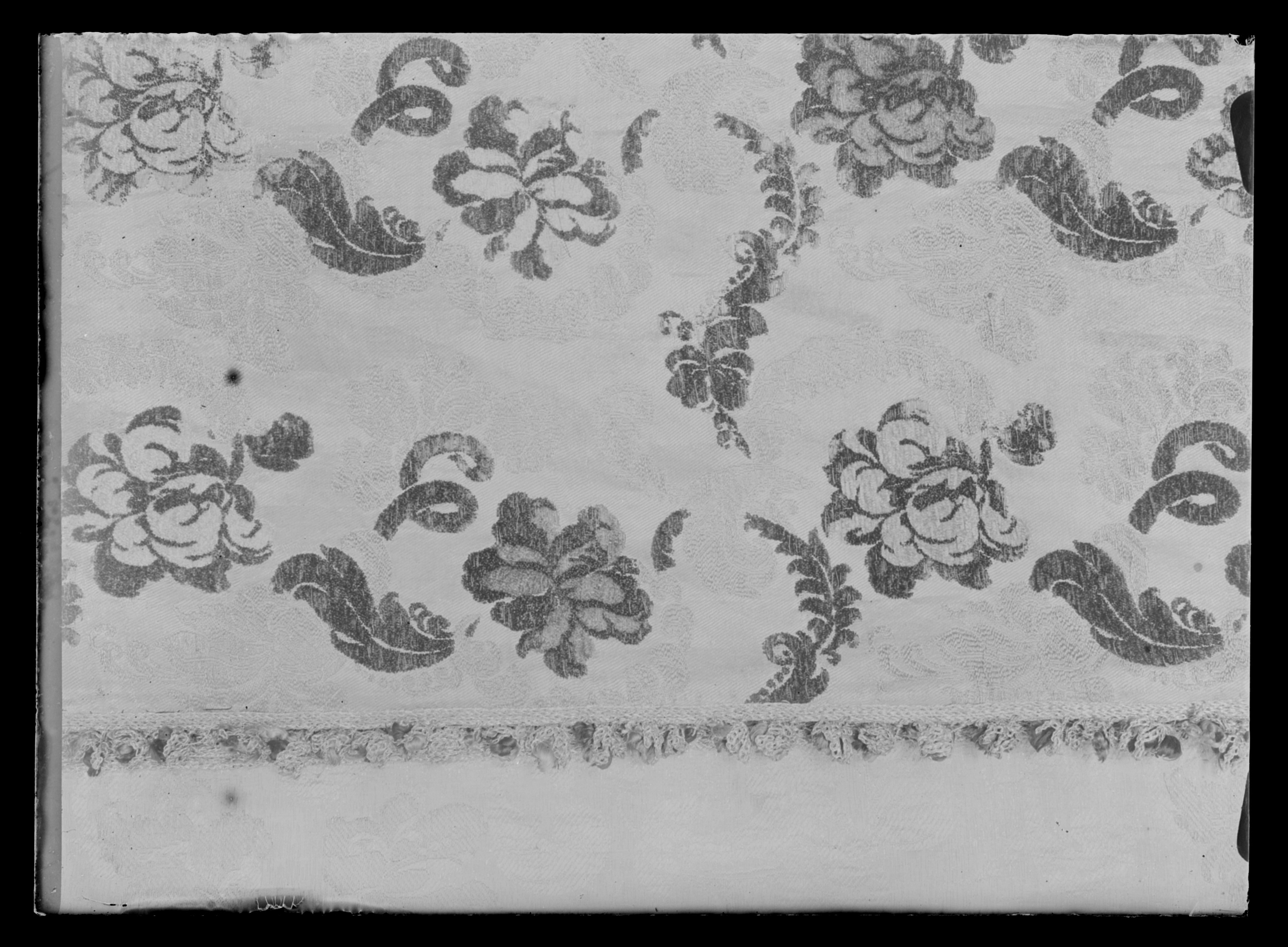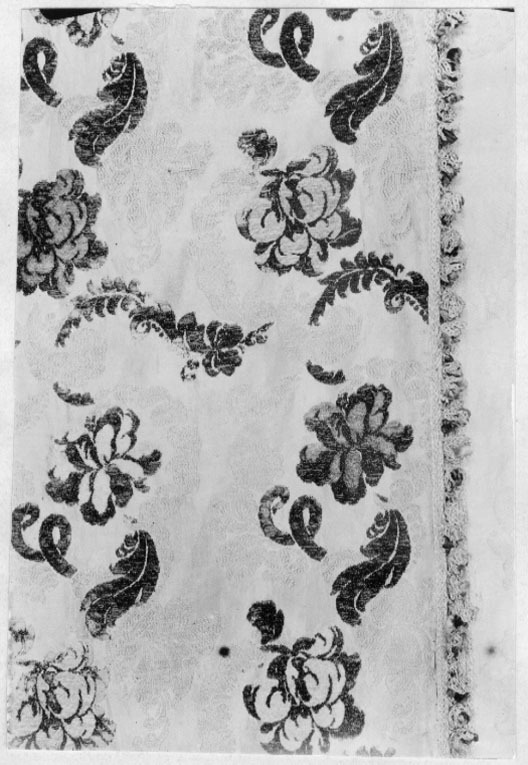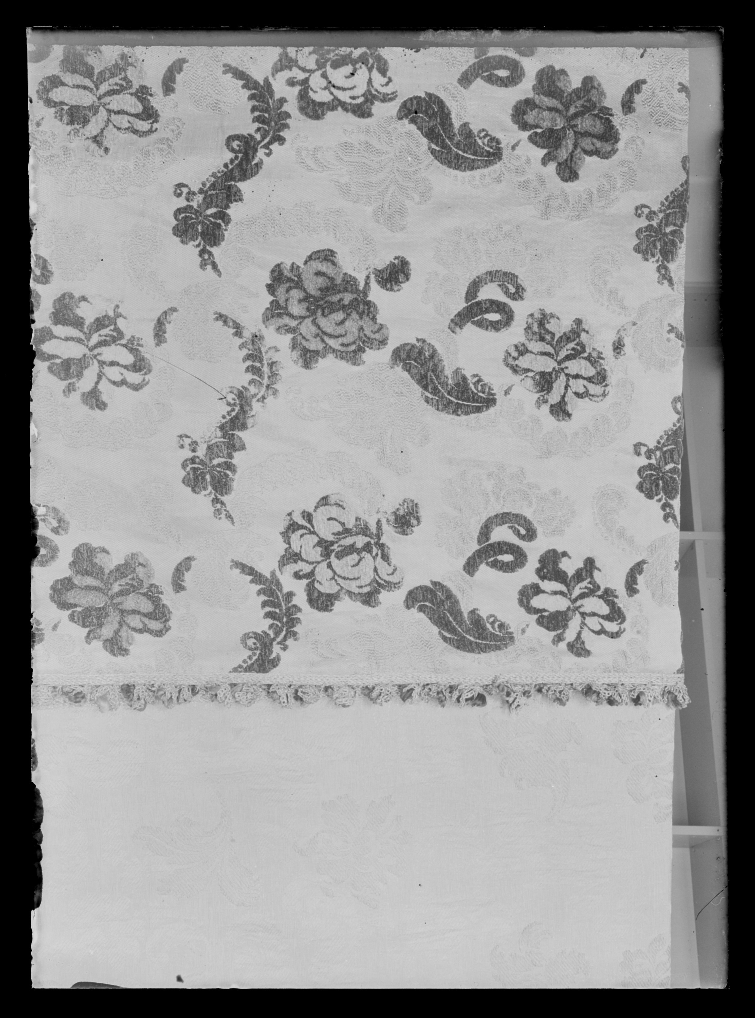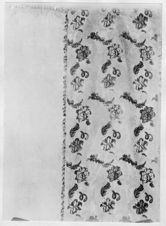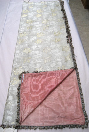 Sängomhänge i två stycken av sidenbrokad i benvit silke, silver och guld, i växt- och blomsterslingor. Kantad på långsidorna och nedre kortänden med flätat band av silver- och guldtråd med runda tofsar. Varannan tofs har ett flätat hölje av silvertråd och varannan av guldtråd, med fyllning av röd och grå, respektive rosa och beige silke. Övre kortsidan har tio öglor i gul metall som mäter 18 mm i diameter. Foder av rosa sidenmoaré.