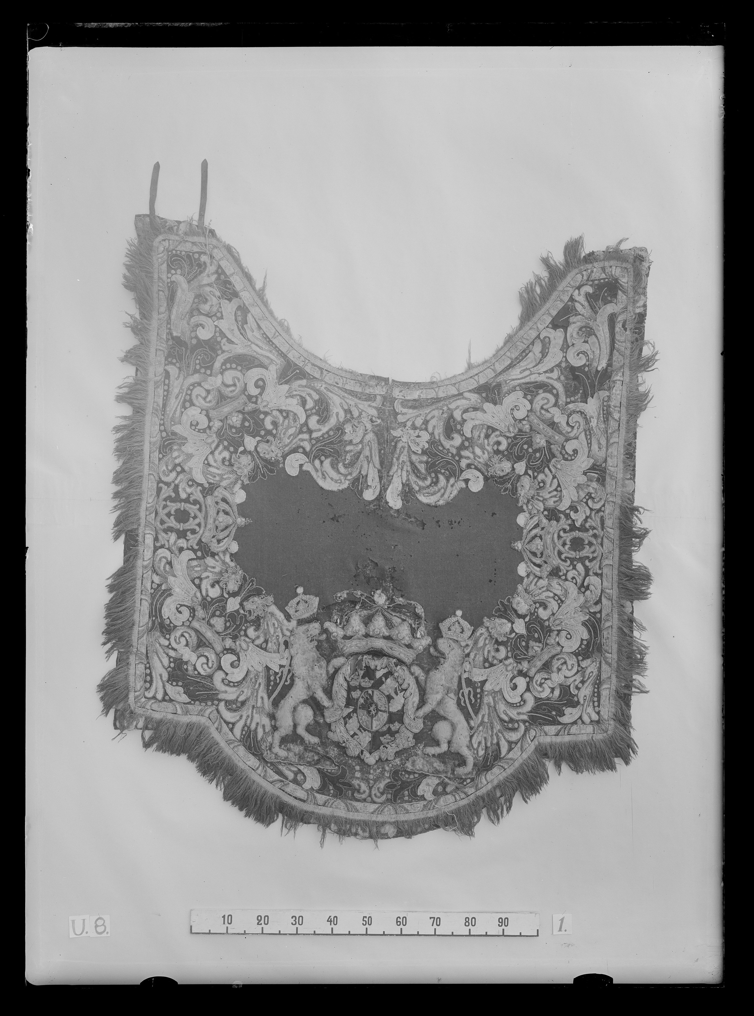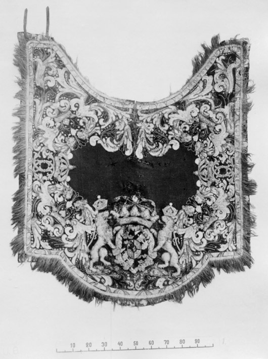 Handhästtäcke, ur en svit om 30 st med svenska riksvapnet och Karl XI:s namnchiffer.