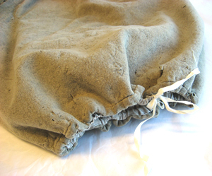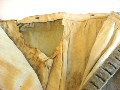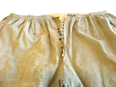 Pösiga knäbyxor av grått kläde med en 30 mm bred midjelinning nedanför vilken byxornas vid samlats så att små veck bildats. Mitt fram ett 370 mm långt sprund med en knäppning bestående av sju, ursprungligen tio, runda höga knappar med snörmakeriarbete av svart tagel och med motsvarande knapphål, 30 mm breda, kantade av svart silkesgarn. Knapphålen sitter på en till hälften dold, påsydd slå. På midjelinningen sitter ett 50 mm brett knapphål samt en saknad tillhörande knapp. På vardera byxben, mitt fram nedanför midjelinningen en 130 mm lång, vertikalt iskuren ficka, kantad av en dekorsöm. I nederkanten på vardera ficka sitter ett stygn av svart silkesgarn. Byxsluten kantas av en 10 mm bred linning som utgörs av en dragsko genom vilken är trätt ett vitt linneband för att nedtill knyta ihop och samla byxornas vidd. Byxorna är fodrade med vit linnelärft. På midjelinningen bak sitter fyra stora krokar av stål. På insidan av linningen fram sitter på vardera sida en något mindre mässingskrok, en modern konstruktion.