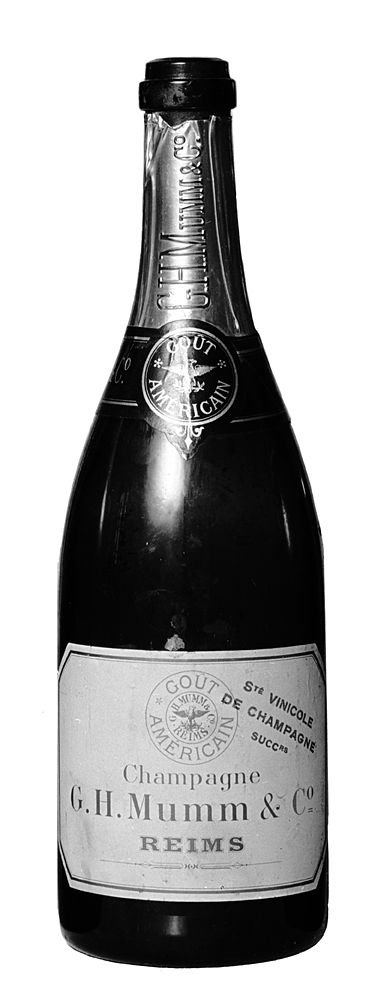 G. H. MUMM & Co., Reims, extra dry, Goût Américain, en helbutelj Av mörkgrönt glas. Cylindrisk, med sluttande skuldra och lång smal hals med stärkring; bottnen konisk, högt uppskjutande. Etikett vit, på denna text i guld, däröver varumärke i guld med omskrift i rött, dessutom vid högra övre hörnet text i blått: "S:te Vinicole de Champagne Succ:r". Upptill kring skuldran ett brett pappersband, varpå i guld mot svart botten: EXTRA DRY G. H. MUMM & Co., på bandet en rund etikett, varpå firmamärke och text: GOUT AMÉRICAIN, i guld. Kapsylfragment av förtent bly, ljust gredelinfärgat, långt nedlöpande på halsen, på detsamma i blå relief: G. H. MUMM & Co. Höjd: 30,5 cm.; diameter: 9,3 cm.