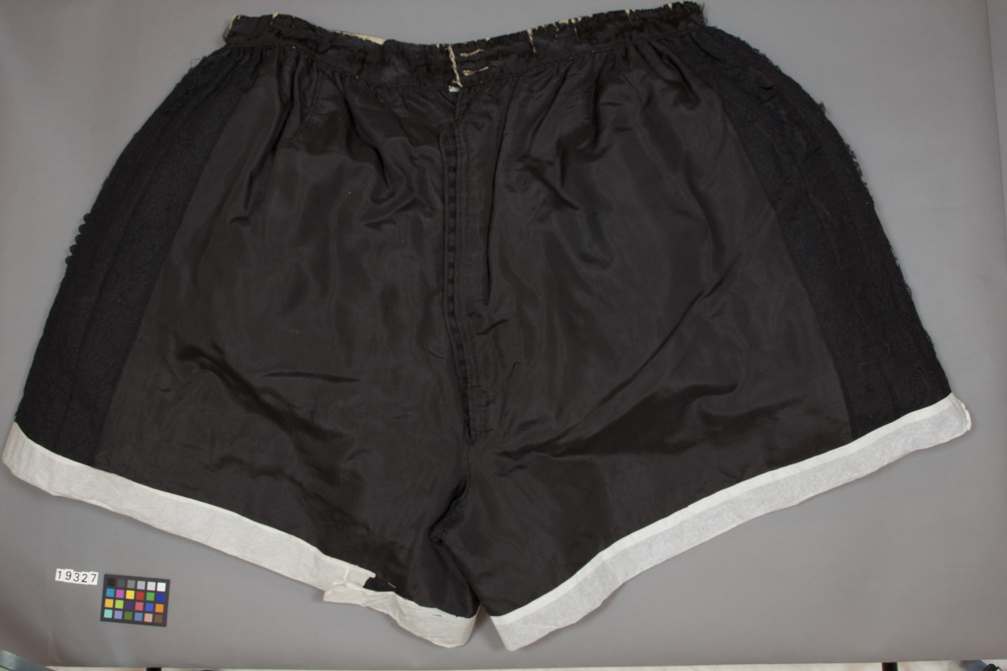 Byxorna är av vid rak modell. De har inte någon skarvsöm, trots sin ansenliga vidd. I de raka sidsömmarna där staden vikts in har de stora (24 cm långa) vertikala ficksprunden placerats. Fram- och baksömmarna är obetydligt sneddade. Framtill är sprundet 47 cm långt och försett med en 38 cm lång knäppslå. Denna har 19 knapphål (2,5 cm långa), som är sydda med ca 6 stygn över 1 tråd med högertvinnat svart silke. Blott 15 knappar (d: 1,1 cm) finns däremot kvar på höger sida, de 4 nedersta fattas nämligen. Den sneddade framkanten och knäppslån samt fickorna har skoning av rips. Byxorna är rynkade vid den 131 cm långa linningen, som blott har 2 av sina ursprungligen 4 hakar i behåll. Linningen har endast en skarv, på höger framsida. Den går i motsatt riktning mot plagget i övrigt och knäpps med 2 små knappar (d: 1,2 cm). En styvnad av dubbel linnelärft(17x15 tr/cm2) är inlagd i linningen. På vänster framstycke finns också den lilla urfickan med sitt tränsade hål, för att en av de felande hakarna skall kunna trädas ut därigenom bakifrån. Byxorna har mellanfoder av svart yllekypert (16x12 tr/cm2)och är på insidan fodrade med vit linnelärft (24x22 tr/cm2). Vid byxbenens insida finns en11 á 12 cm hög skoning av den svarta ripsen. Ovanpå denna har det vita linnefodret sytts. Fickorna är stofferade med jackans moiréfoder, utom sidfickornas mittsektion, som stofferats med rips. Byxornas garnering utgörs av 3 vertikala rader svarta knypplade spetsar av samma sort som på jackan. Dessa går på ömse sidor om sidsömmarna, ca 1 cm från desamma samt i en horisontell rad nedtill vid byxbenen ca 4 cm från kanten. Mitt i sidsömmen har en knapprad suttit (knapparna d: 1,2 cm). Nu återstår endast en liten rad av 5 knappar i höger sida (ca 4 cm nedanför fickans sprund). Spetsen vänder sig mot sidan och har staden med pien riktad mot mitten. Byxorna har aldrig haft någon garnering med rosetter. I linnefodret är byxorna i linningen på vänster sida märkta med bläck: "N. 49" (= nr i 1789-90 års inv.).