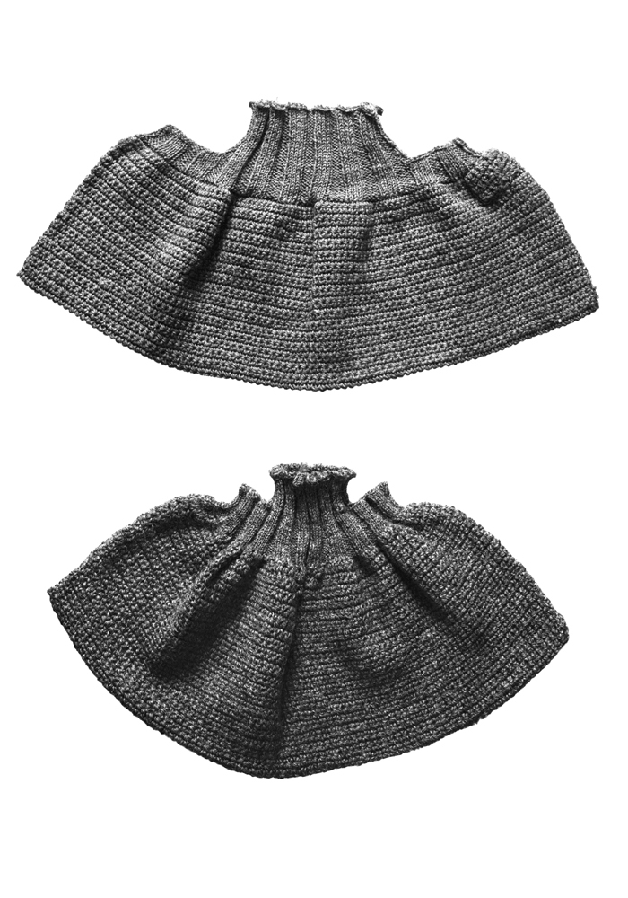 BORSTÖVERDRAG, två stycken. Handstickade och virkade. Det ena gråblått det andra mörkgrått. Avlånga i form av en påse i halvstolpvirkning. Gråblåa överdraget längd: 72 cm, höjd: 30 cm. Mörkgråa överdraget längd: 65 cm, höjd: 27 cm. Stickade av fröken Ida Uhse år 1914. Garnet inköpt av Wilhelmina von Hallwyl år 1914 hos firman Bredenberg & Co. garn- och trikåhandel, Stockholm.