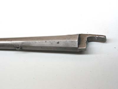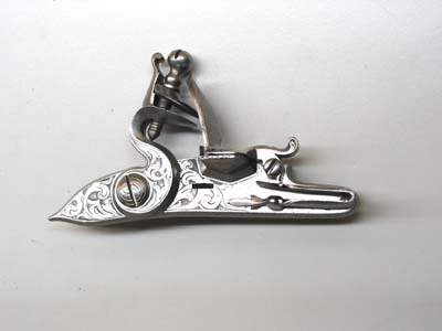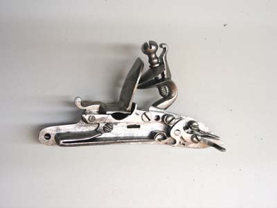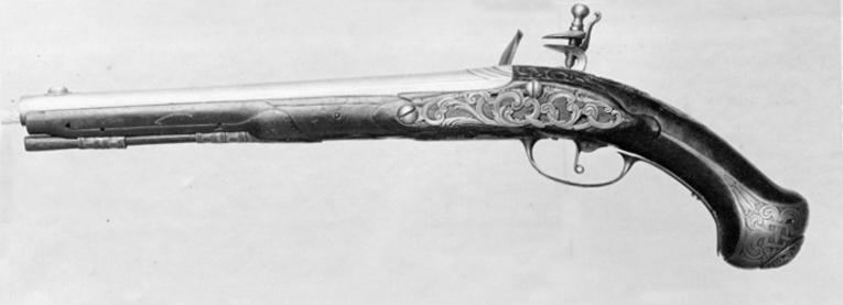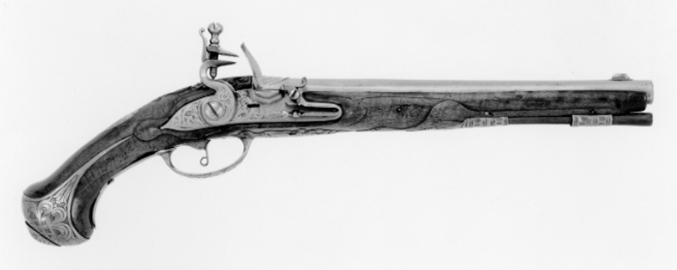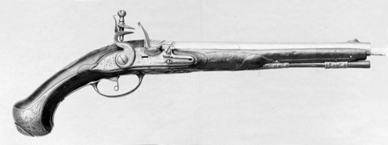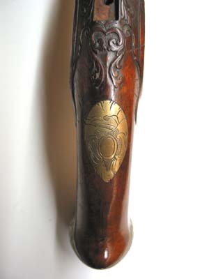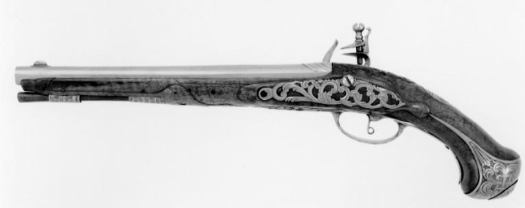 Rund, räfflad pipa, 7 räfflor, kammaren med plana sidor. På kammarens ovansida tre halvovala reliefornemant, på undersidan en otydlig stämpel. Riktmedel: På pipans ovansida en plan ribba fram till kornet. Lågt ståndsikte med lång siktskåra. Ovalt stolpkorn av mässing. Fästning: Två häften. Pipan fäst med krysskruv ovanifrån samt ett pipstift av stål. Flintlås av stål med plant låsbleck, fasade kanter och yttäckande ornering av rankor och blad mot finpunsad botten. S-formig hane med lös överkäke, kulformigt käkskruvhuvud med profilerad hals. Stor hanskruv med cirkelformigt graverade linjer. Kantig fängpanna med fals. Batteri med kraftigt eldstål, åsad och fasad rygg. Batterifjäder med flikigt fjäderlöv. På bleckets mitt mellan hane och fängpanna en rektangulär genombrytning (fjäderfäste?). Fästning: En låsskruv. Avtryckare med inrullad ände. Helstock av valnöt med snidad kantdekor samt runt svansskruvbladet rankor och c-formiga bågar. Näsband av horn, övriga beslag av mässing med graverade rank- och bandornament mot punsad botten. Kolvkappa med långa flikar, oval, något välvd centrumplatta. Varbygel med slät bakre arm och konturerad främre arm, avslutad med palmett. Genombrutet sidbleck. Två rörkor, runda och profilerade, spetsrörkan utdragen bakåt i en palmett. Tillbehör: Laddstock av stockens trä, vidgad i ena änden, l: 293 mm.