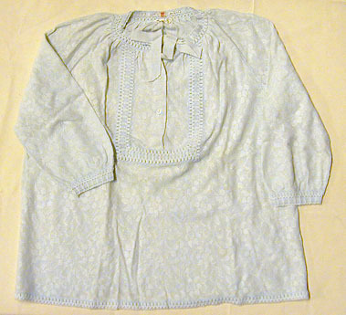 Pyjamasjacka, rak, vid modell med raglanärm. Blekt turkosgrön av 55% ull och 45 % orlon medmaskinstickat mönster i form av blommor på stjälkar med blad. Jackan skuren i ettframstycke, b: 730 mm, ett bakstycke, b: 650 mm. Rundskuren hals med sprund, l: 270 mm,knäppt med tre knappar. I ringningen inträtt band. På bandets främre delar påsytt bredare band, b: 25 mm medrunduddad kant. Detta knutet till en rosett. Nedanför bandet genombruten dekorationsbård.Samma bård med inträtt band omger knäppningen och bildar där ett raktangulärt fält. Raglanärm i en våd, figursöm från ringningen vid axeln, l: 140 mm. Ärmen rynkad nedtill ochupptill och avslutad med samma dekorationsbård som runt ringningen. Det inträdda bandet iringningen och ärm är elastiskt. Runt jackans nederkant genombruten bård liknande en knutenfrans. På ringningens insida i nacken etikett: "Hanro // MADE IN SWITZERLAND // MITIN // 55% WOOL// 45% ORLON // M" därovanför Sibyllas märkning: kvadratisk lapp med krönt S i rött garn. Storlek: medium.
