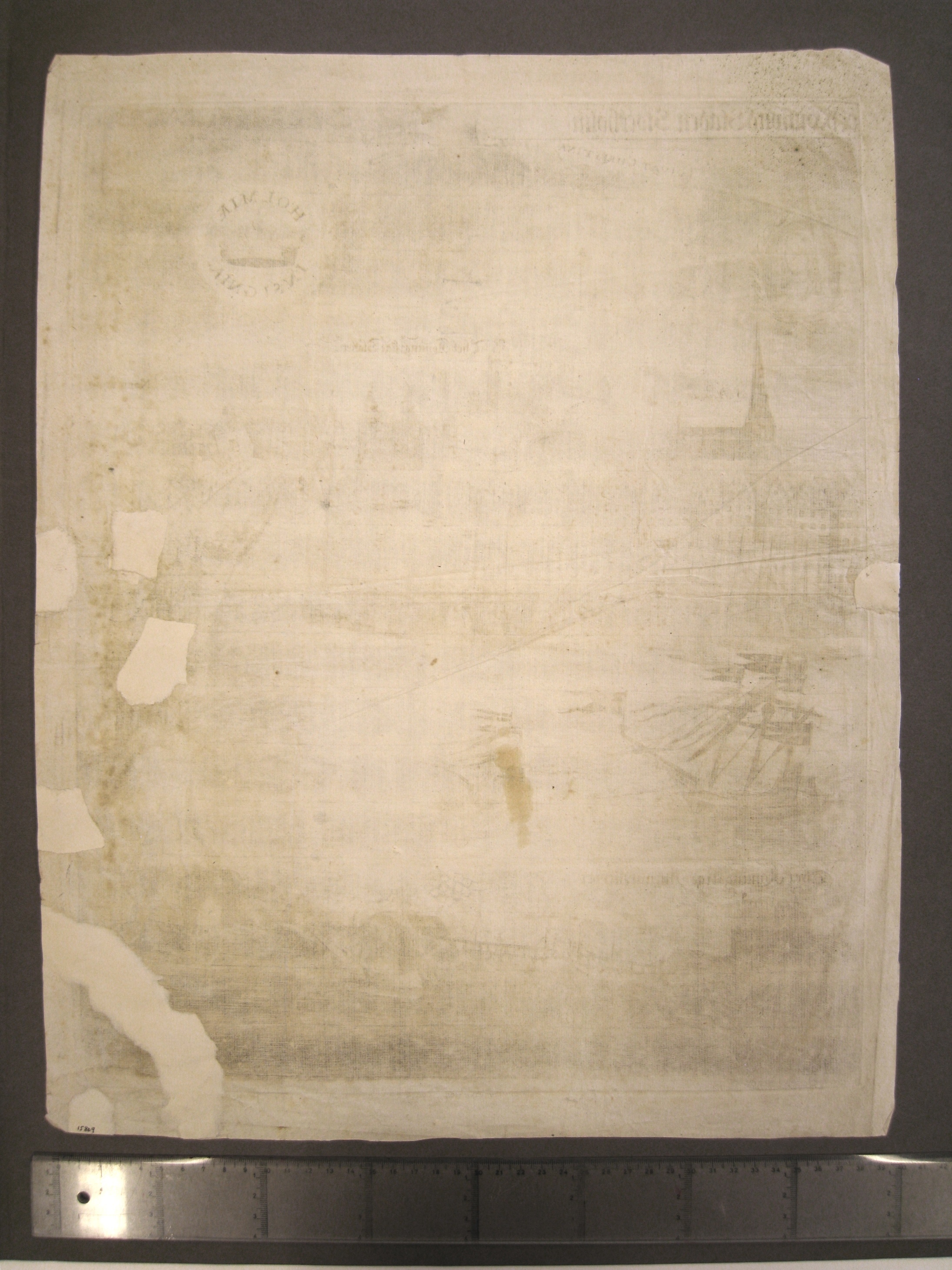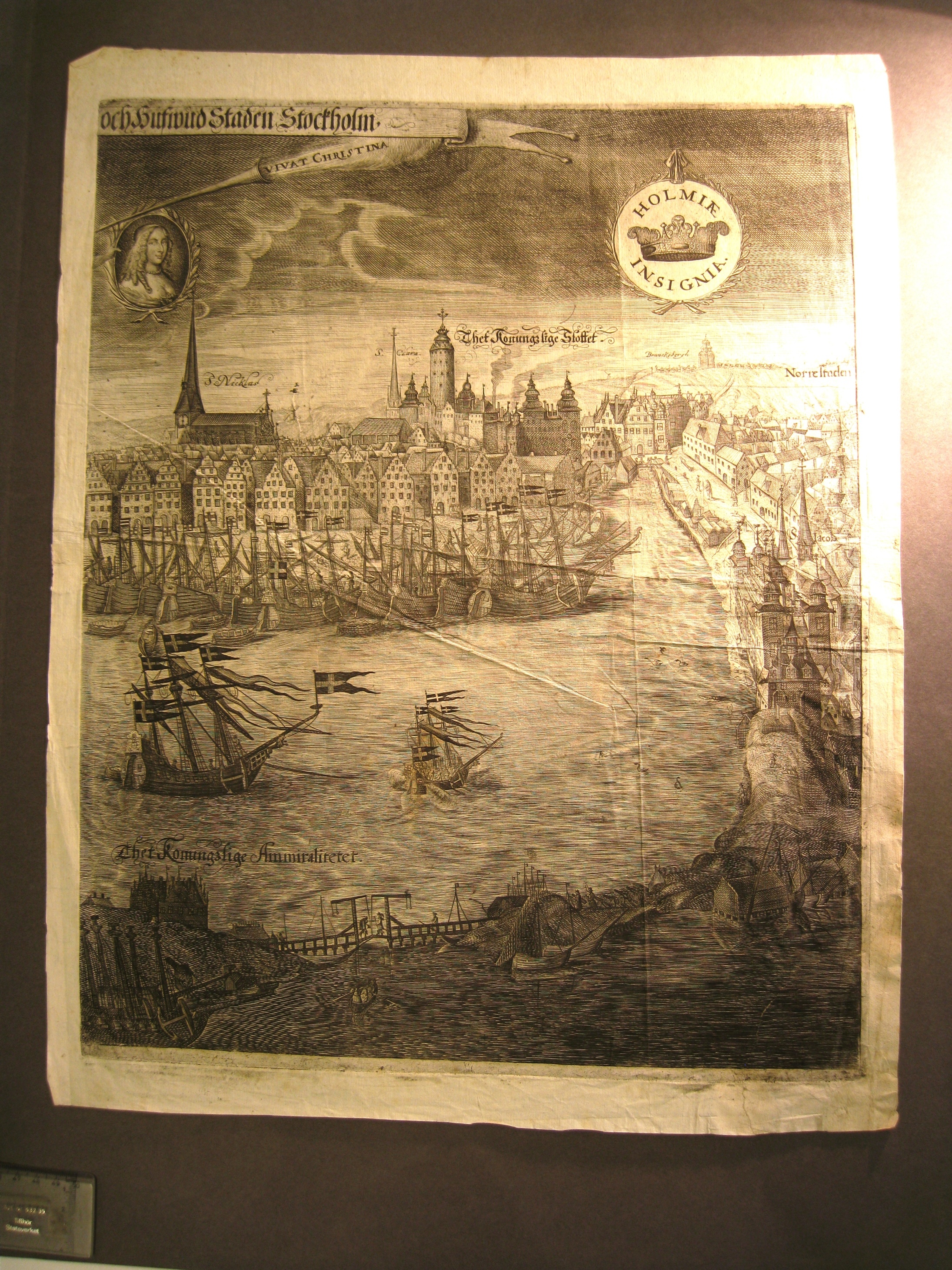 framställd till Kristinas Kröning 1650. Vy över Gamla stan med slottet Tre kronor samt del av Norrmalm. I förgrunden Amiralitet. I språkband upptill t.v. ”och Hufwud Staden Stockholm”. Upptill t.v. porträttmedaljong av drottnig Kristina med trumpetblåsande ängel (ängeln finns på inv.nr. 15808) och ”Vivat Christina”. Upptill t.h. Stockholms vapen. Utförd av Wolffgang Hartmann, 1650.