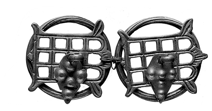 MALJOR , ett par. Av silver, delvis förgylldning. Runda Vadera bestående av en spiralvriden ring, ivarpå pålagd ett gjutet rektangulärt fönsterliknande ornament med kvadratiska rutor. Utan stämplar. Från 1700-talet eller senare. Dylika maljor kända även från Skåne. Inköpta av Wilhelmina von Hallwyl december 1888 hos juvilerarfiramn JE Torsk, Stockholm.