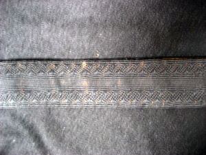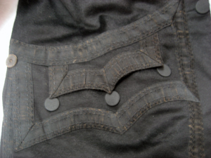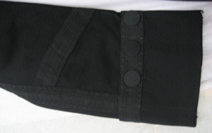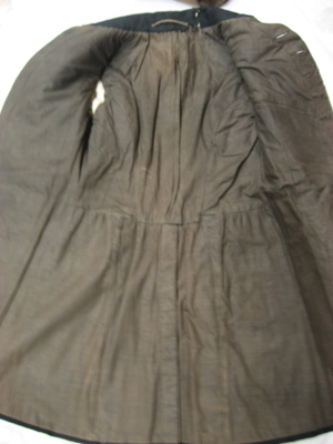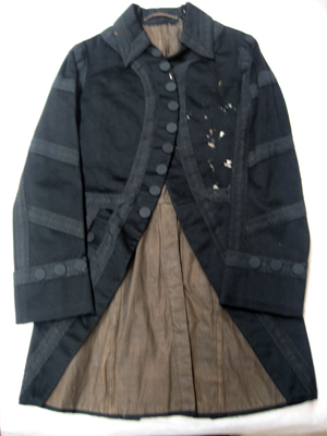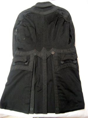 Rock av svart kläde sydd med två mot varandra rundade, bakåtskurna framstycken, ett ryggstycke av två delar samt två sidostycken. Rocken garneras av svarta vävda silkeband. Runtom midjan löper en söm och från midjesömmen bildas två skörtkappor. Skörtkapporna är lagda i veck så att de bildar ytterligare två skörtkappor. Dessa hålls ihop upp- och nedtill av en platt knapp överklädd med svart silketråd. Rocken har en knäppning mitt fram bestående av fem platta knappar överklädda med svart silketråd. Knappraden fortsätter nedtill med ytterligare tre knappar som dekor. I vardera framstycke är iskuret en horisontal ficka l. 200 mm, med ett spetsflikigt ficklock. Fickan ramas in av svart vävt band och ficklocket garneras av svart band. Rocken har en snibbkrage, b. 65-80 mm, garnerad med svart silkeband. Ärmarna är långa, sydda av två stycken med svarta silkeband över sömmarna samt band lagda i ett tvärrandigt mönster. Vid ärmsluten är uppvikt breda slag, b. 115 mm, garnerade med svarta band och med tre svarta dekorknappar. Rocken är på insidan fodrad med svart linnebatist och fram- och sidostycken är vadderade med ull. I vänster framstycke är i fodret iskuret en horisontal bröstficka, l. 140 mm. Ärmarna är fodrade med vit linnelärft. På insidan av kragen sitter påsytt en svart sidenhälla.