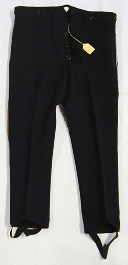 L: 560 mm, linning: 40 mm, midja: 56 mm, benvidd: 90 mm Ridbyxor av mörkblå diagonal knäppta med gylf med tre svarta knappar d: 15 mm. Linning med sex lika knappar. Fickor i sidsömmen. Utmed denna smalt beläggningssnöre av guldtråd. Nedtill på byxbenens insida svarta knappar med hällor av resår. Har tillhört prins Gustav Adolf (1906-1947) som 1910 fått uniformen av officerarna vid Bonarps hed vid kronprinsparets (Gustav VI Adolf och Margareta) besök.