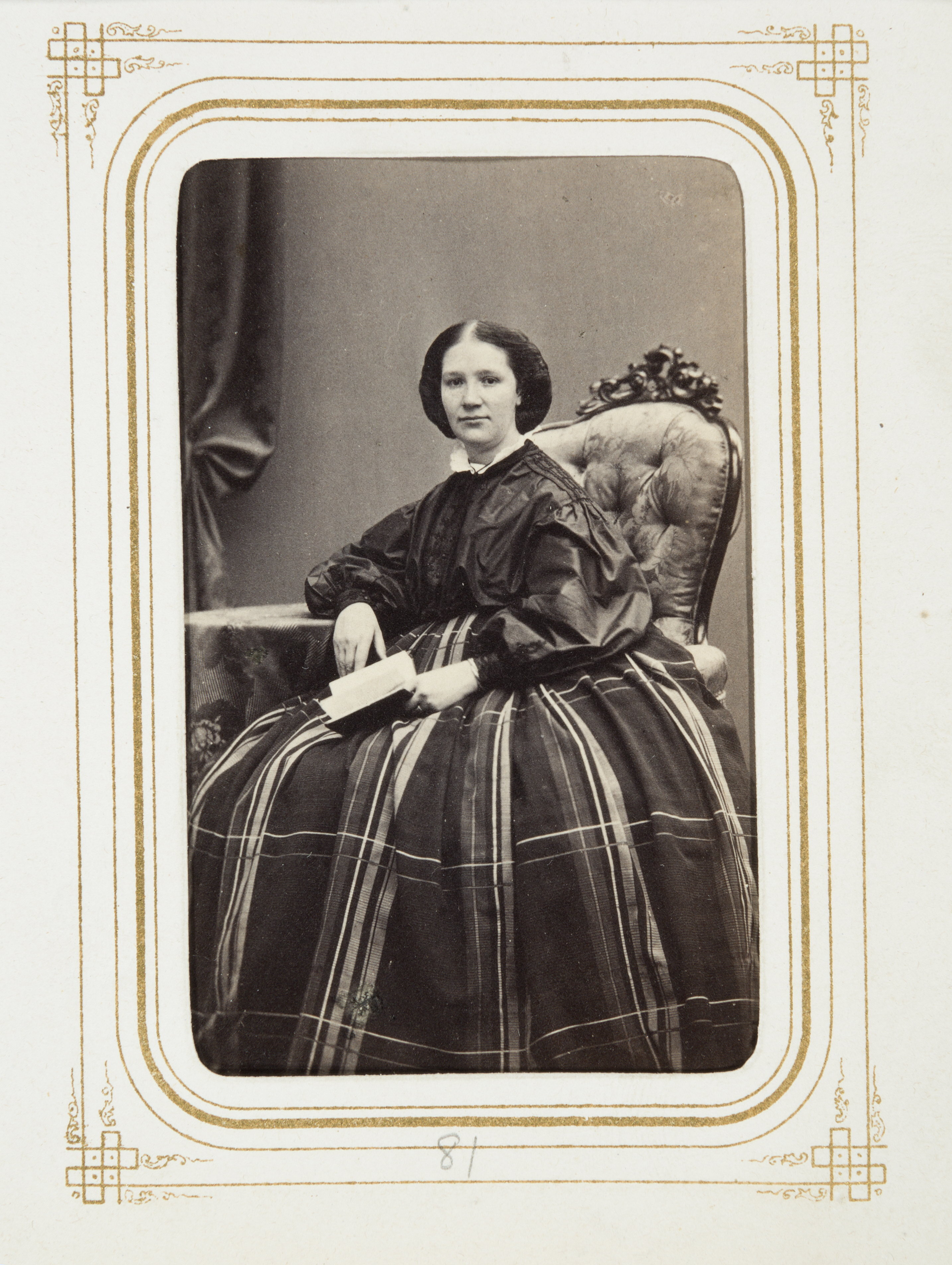 Biografi. Fotografiporträtt. 101 porträtt i album. Medelålders dam . Erhållet av Johanna Kempe, f. Wallis på 1860-talet. 26,5x20,7x4 cm.