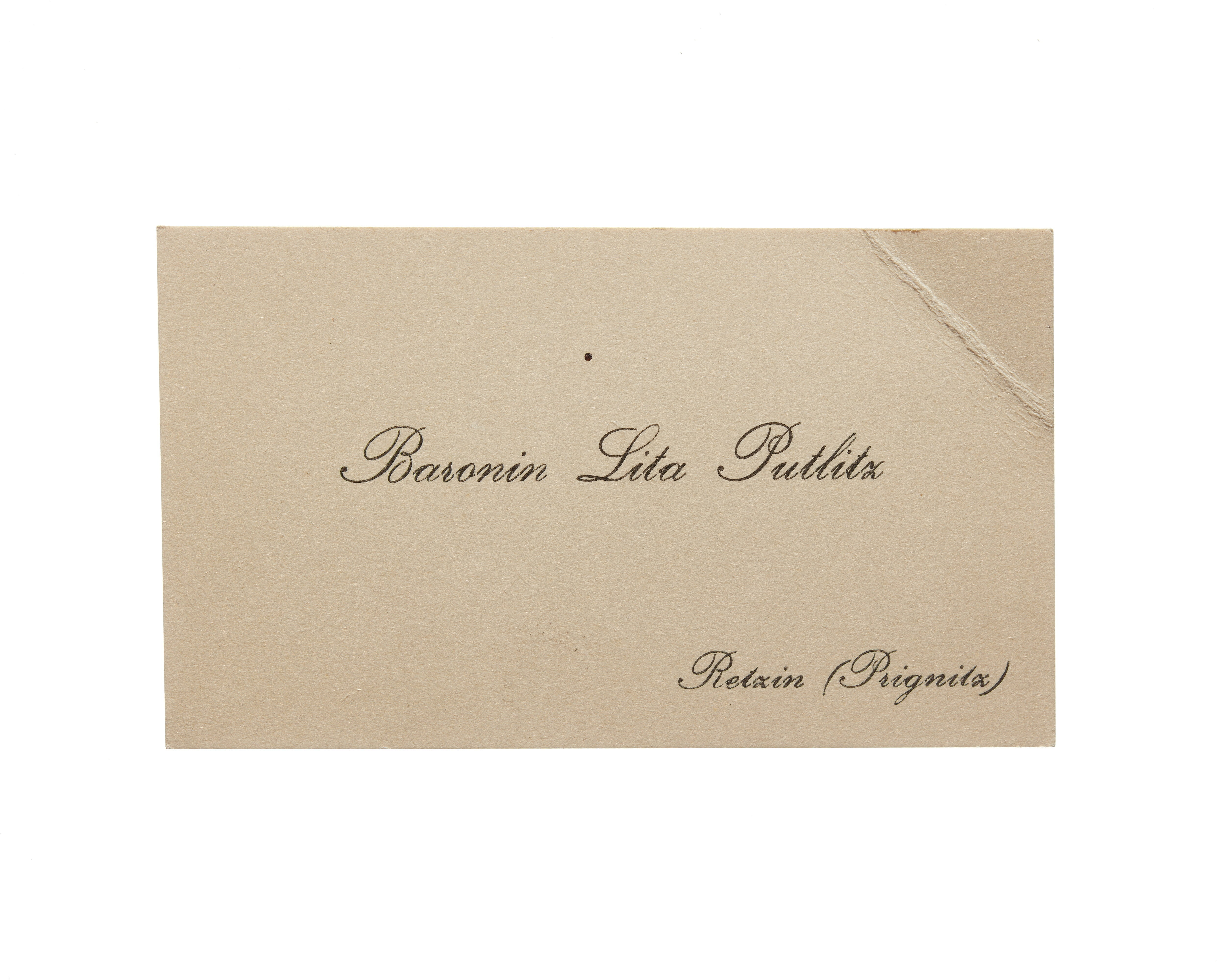 Ett visitkort från Baronin Lita Putlitz, utan datum, vikt i övre högra hörnet. Adress (nedre högra hörnet) Retzin (Prignitz).