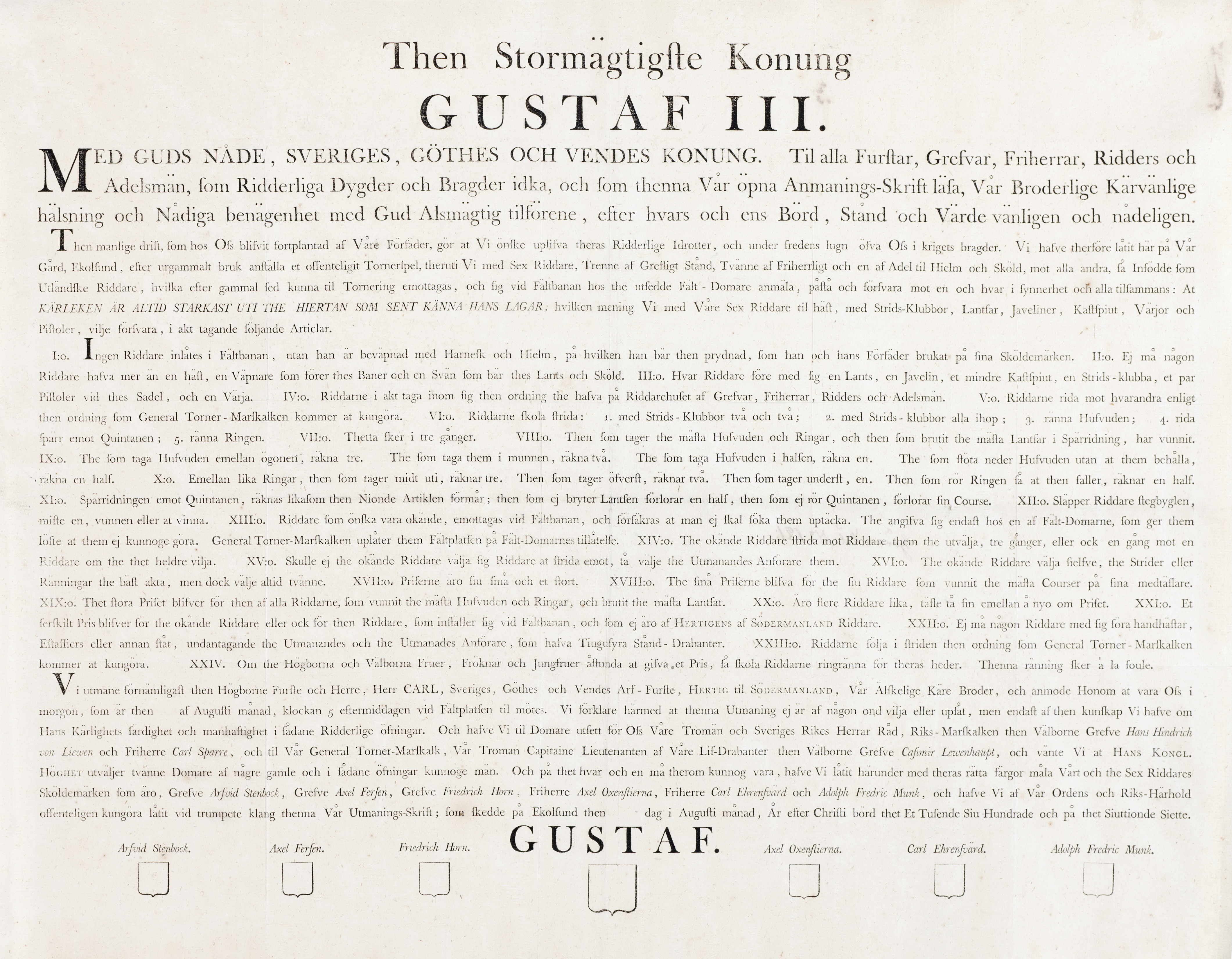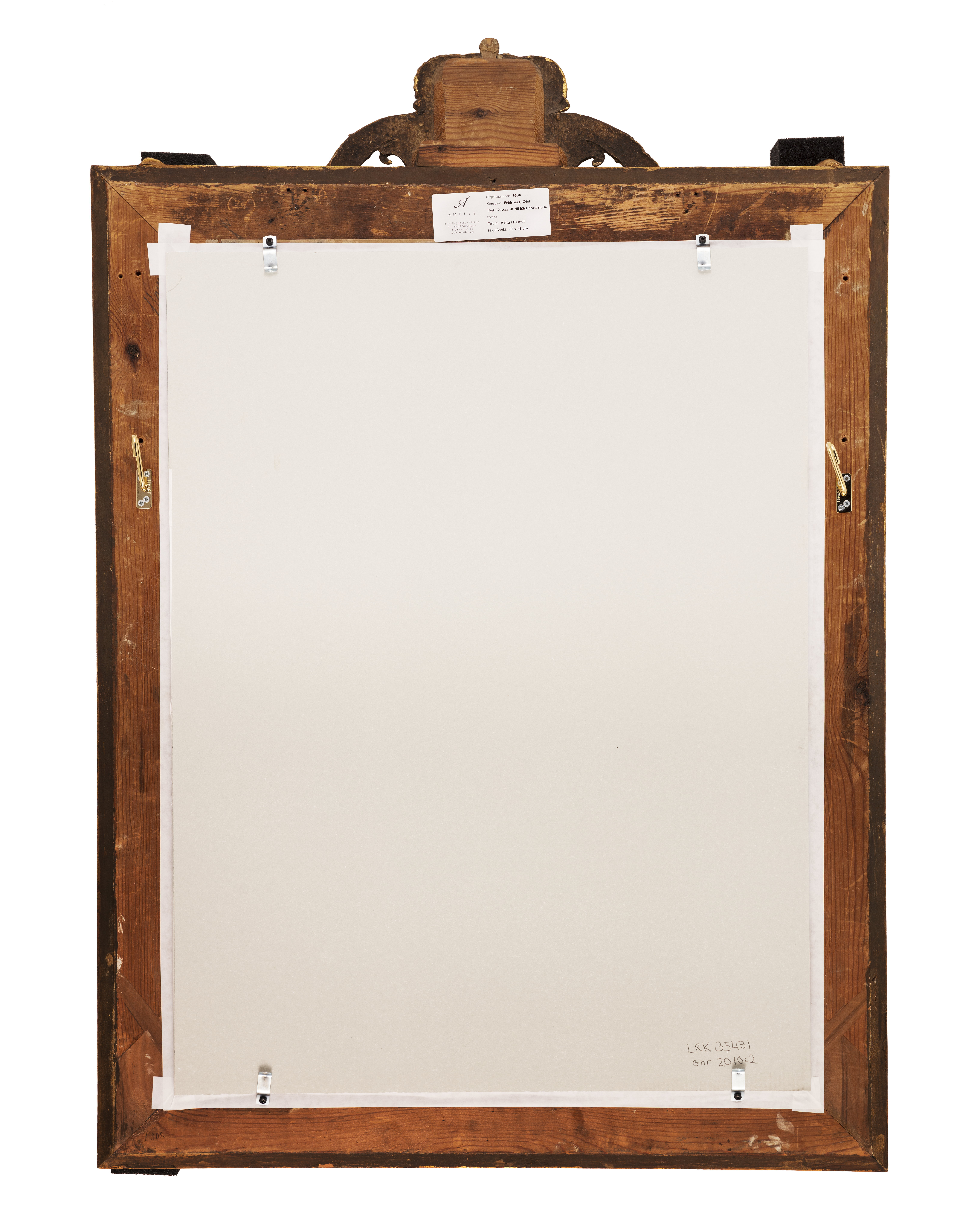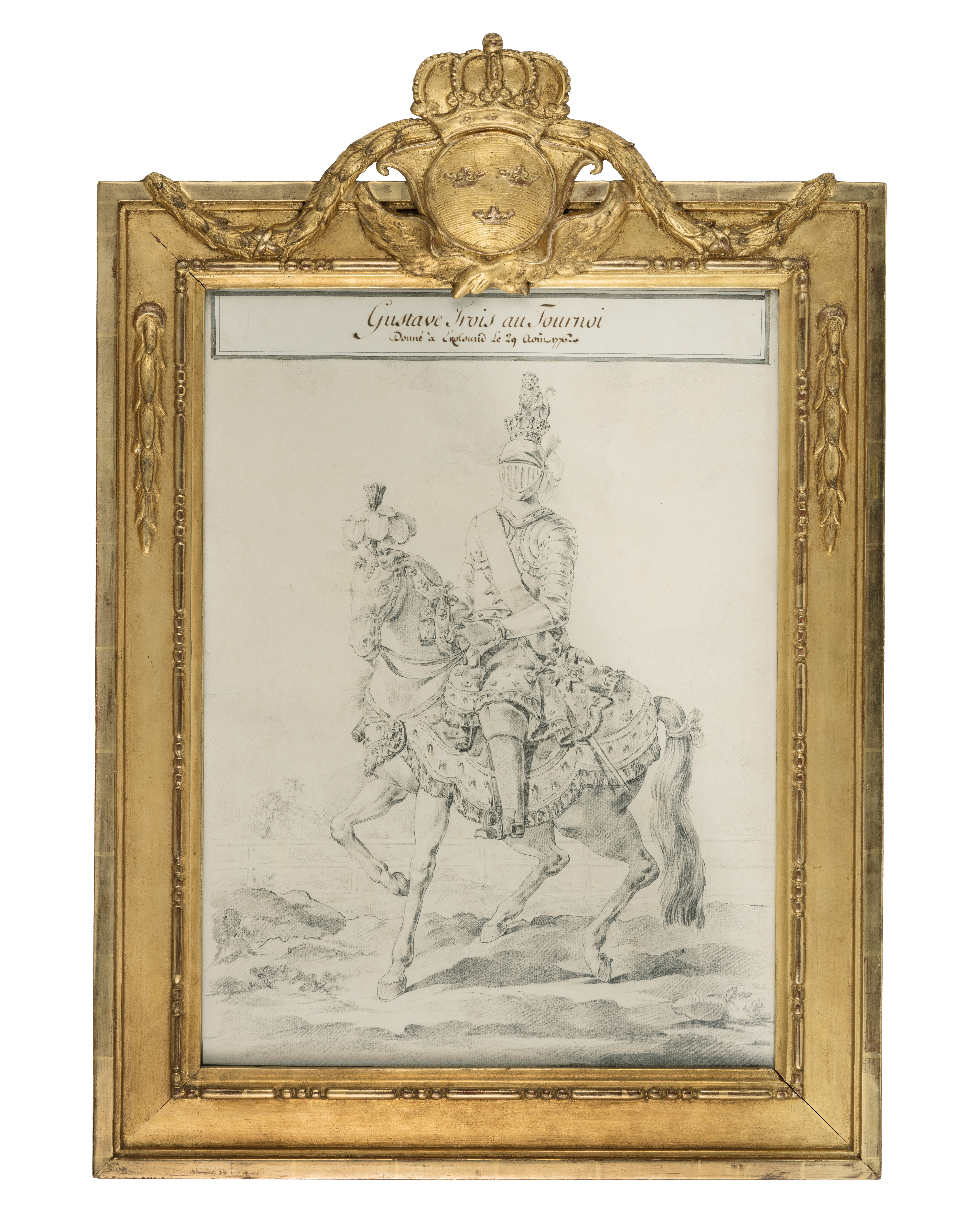 Kungen är avbildad i sin förgyllda rustning. På bröstet är Serafimerkraschanen fästen och över bröstet Serafimerordens band. Kronprydd vapenskjortel samt kraftiga stövlar med krage. I gehänget syns svärdet som Gustav III bar vid sin kröning. Hästens huvudlag är prytt med plymer och ädelstenar. Schabraket har påsydda kronor, en bård av hermelinskinn samt kantring med krepiner. Hästens svans är omknuten med rosett. I bakgrunden svagt skisserat landskap, träd, moln samt tornerarenans skrank. Upptill en påklistrad etikett med påskrift: "Gustave Trois au Tournoi Donné à Ekolsund de 29 aout 1776" På baksidan etikett med Åmells, försäljarens, uppgifter: Objektnummer 9538, konstnär: Fridsberg 017, titel: Gustav III till häst iförd ridda; teknik: krita, pastell höjd/bredd: 60x450 På ramens baksida: med blyerts: hampa, 60en med bläck 305 Förgylld träram, profilerad med pärlstav och blad. Kröns upptill av lilla riksvapnet under kunglig krona.